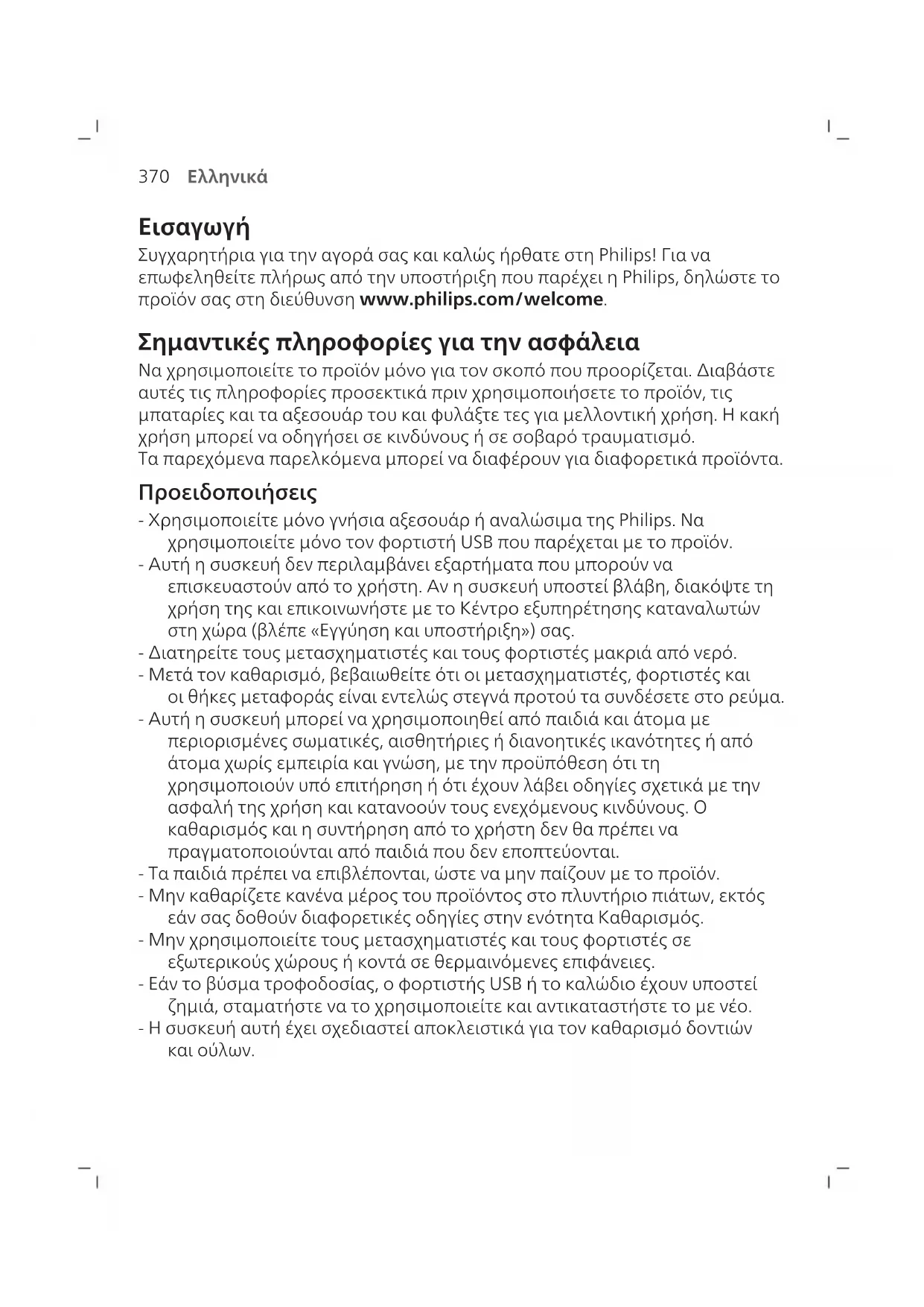 Συγχαρητήρια για την αγορά σας και καλώς ήρθατε στη Philips! Για να επωφεληθείτε πλήρως από την υποστήριξη που παρέχει η Philips, δηλώστε το προϊόν σας στη διεύθυνση www.philips.com/welcome. Σημαντικές πληροφορίες για την ασφάλεια Να χρησιμοποιείτε το προϊόν μόνο για τον σκοπό που προορίζεται. Διαβάστε αυτές τις πληροφορίες προσεκτικά πριν χρησιμοποιήσετε το προϊόν, τις μπαταρίες και τα αξεσουάρ του και φυλάξτε τες για μελλοντική χρήση. Η κακή χρήση μπορεί να οδηγήσει σε κινδύνους ή σε σοβαρό τραυματισμό. Τα παρεχόμενα παρελκόμενα μπορεί να διαφέρουν για διαφορετικά προϊόντα. Προειδοποιήσεις - Χρησιμοποιείτε μόνο γνήσια αξεσουάρ ή αναλώσιμα της Philips. Να χρησιμοποιείτε μόνο τον φορτιστή USB που παρέχεται με το προϊόν. - Αυτή η συσκευή δεν περιλαμβάνει εξαρτήματα που μπορούν να επισκευαστούν από το χρήστη. Αν η συσκευή υποστεί βλάβη, διακόψτε τη χρήση της και επικοινωνήστε με το Κέντρο εξυπηρέτησης καταναλωτών στη χώρα (βλέπε «Εγγύηση και υποστήριξη») σας. - Διατηρείτε τους μετασχηματιστές και τους φορτιστές μακριά από νερό. - Μετά τον καθαρισμό, βεβαιωθείτε ότι οι μετασχηματιστές, φορτιστές και οι θήκες μεταφοράς είναι εντελώς στεγνά προτού τα συνδέσετε στο ρεύμα. - Αυτή η συσκευή μπορεί να χρησιμοποιηθεί από παιδιά και άτομα με περιορισμένες σωματικές, αισθητήριες ή διανοητικές ικανότητες ή από άτομα χωρίς εμπειρία και γνώση, με την προϋπόθεση ότι τη χρησιμοποιούν υπό επιτήρηση ή ότι έχουν λάβει οδηγίες σχετικά με την ασφαλή της χρήση και κατανοούν τους ενεχόμενους κινδύνους. Ο καθαρισμός και η συντήρηση από το χρήστη δεν θα πρέπει να πραγματοποιούνται από παιδιά που δεν εποπτεύονται. - Τα παιδιά πρέπει να επιβλέπονται, ώστε να μην παίζουν με το προϊόν. - Μην καθαρίζετε κανένα μέρος του προϊόντος στο πλυντήριο πιάτων, εκτός εάν σας δοθούν διαφορετικές οδηγίες στην ενότητα Καθαρισμός. - Μην χρησιμοποιείτε τους μετασχηματιστές και τους φορτιστές σε εξωτερικούς χώρους ή κοντά σε θερμαινόμενες επιφάνειες. - Εάν το βύσμα τροφοδοσίας, ο φορτιστής USB ή το καλώδιο έχουν υποστεί ζημιά, σταματήστε να το χρησιμοποιείτε και αντικαταστήστε το με νέο. - Η συσκευή αυτή έχει σχεδιαστεί αποκλειστικά για τον καθαρισμό δοντιών και ούλων.371