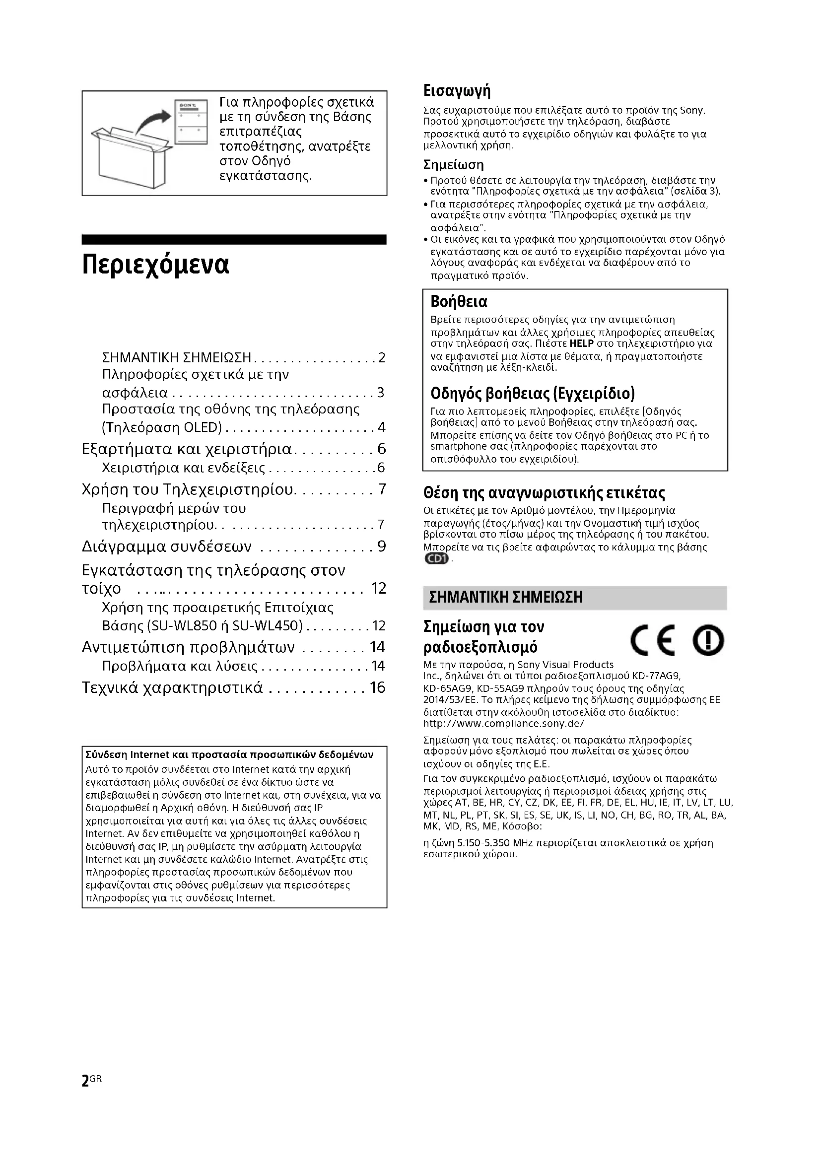 Σημείωση για τον ραδιοεξοπλισμό Με την παρούσα, η Sony Visual Products Inc., δηλώνει ότι οι τύποι ραδιοεξοπλισμού KD-77AG9, KD-65AG9, KD-55AG9 πληρούν τους όρους της οδηγίας 2014/53/ΕΕ. Το πλήρες κείμενο της δήλωσης συμμόρφωσης ΕΕ διατίθεται στην ακόλουθη ιστοσελίδα στο διαδίκτυο: http://www.compliance.sony.de/Σημείωση γι α τους πελάτες: οι παρακάτω πληροφορίες αφορούν μόνο εξοπλισμό που πωλείται σε χώρες όπου ισχύουν οι οδηγίες της Ε.Ε. Για τον συγκεκριμένο ραδιοεξοπλισμό, ισχύουν οι παρακάτω περιορισμοί λειτουργίας ή περιορισμοί άδειας χρήσης στις χώρες AT, BE, HR, CY, CZ, DK, EE, FI, FR, DE, EL, HU, IE, IT, LV, LT, LU, MT, NL, PL, PT, SK, SI, ES, SE, UK, IS, LI, NO, CH, BG, RO, TR, AL, BA, MK, MD, RS, ME, Κόσοβο:η ζώ νη 5.150-5.350 MHz περιορίζεται αποκλειστικά σε χρήση εσωτερικού χώρου. Για πληροφορίες σχετικά