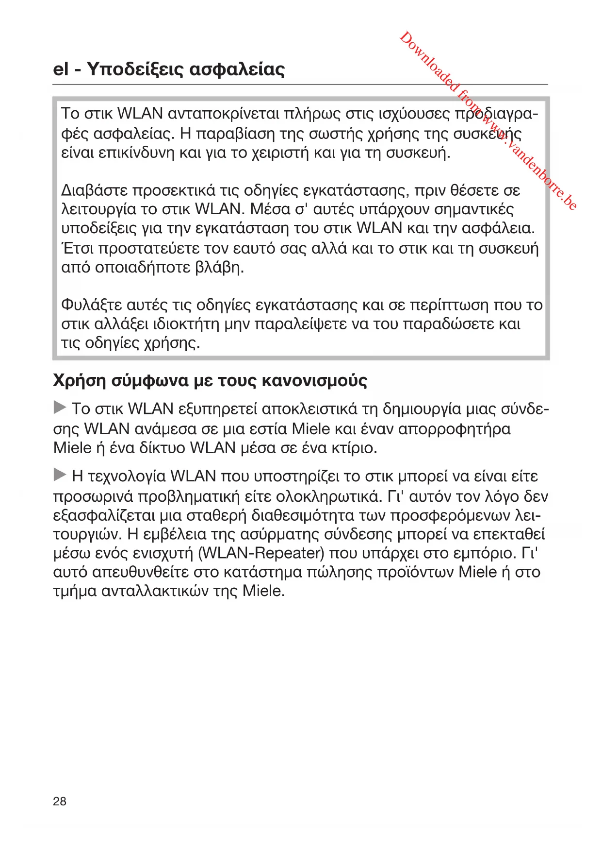 Το στικ WLAN ανταποκρίνεται πλήρως στις ισχύουσες προδιαγρα- φές ασφαλείας. Η παραβίαση της σωστής χρήσης της συσκευής είναι επικίνδυνη και για το χειριστή και για τη συσκευή. Διαβάστε προσεκτικά τις οδηγίες εγκατάστασης, πριν θέσετε σε λειτουργία το στικ WLAN. Μέσα σ' αυτές υπάρχουν σημαντικές υποδείξεις για την εγκατάσταση του στικ WLAN και την ασφάλεια. Έτσι προστατεύετε τον εαυτό σας αλλά και το στικ και τη συσκευή από οποιαδήποτε βλάβη. Φυλάξτε αυτές τις οδηγίες εγκατάστασης και σε περίπτωση που το στικ αλλάξει ιδιοκτήτη μην παραλείψετε να του παραδώσετε και τις οδηγίες χρήσης. Χρήση σύμφωνα με τους κανονισμούς Το στικ WLAN εξυπηρετεί αποκλειστικά τη δημιουργία μιας σύνδε- σης WLAN ανάμεσα σε μια εστία Miele και έναν απορροφητήρα Miele ή ένα δίκτυο WLAN μέσα σε ένα κτίριο. Η τεχνολογία WLAN που υποστηρίζει το στικ μπορεί να είναι είτε προσωρινά προβληματική είτε ολοκληρωτικά. Γι' αυτόν τον λόγο δεν εξασφαλίζεται μια σταθερή διαθεσιμότητα των προσφερόμενων λει- τουργιών. Η εμβέλεια της ασύρματης σύνδεσης μπορεί να επεκταθεί μέσω ενός ενισχυτή (WLAN-Repeater) που υπάρχει στο εμπόριο. Γι' αυτό απευθυνθείτε στο κατάστημα πώλησης προϊόντων Miele ή στο τμήμα ανταλλακτικών της Miele. Downloaded from www.vandenborre.beel - Υποδείξεις ασφαλείας