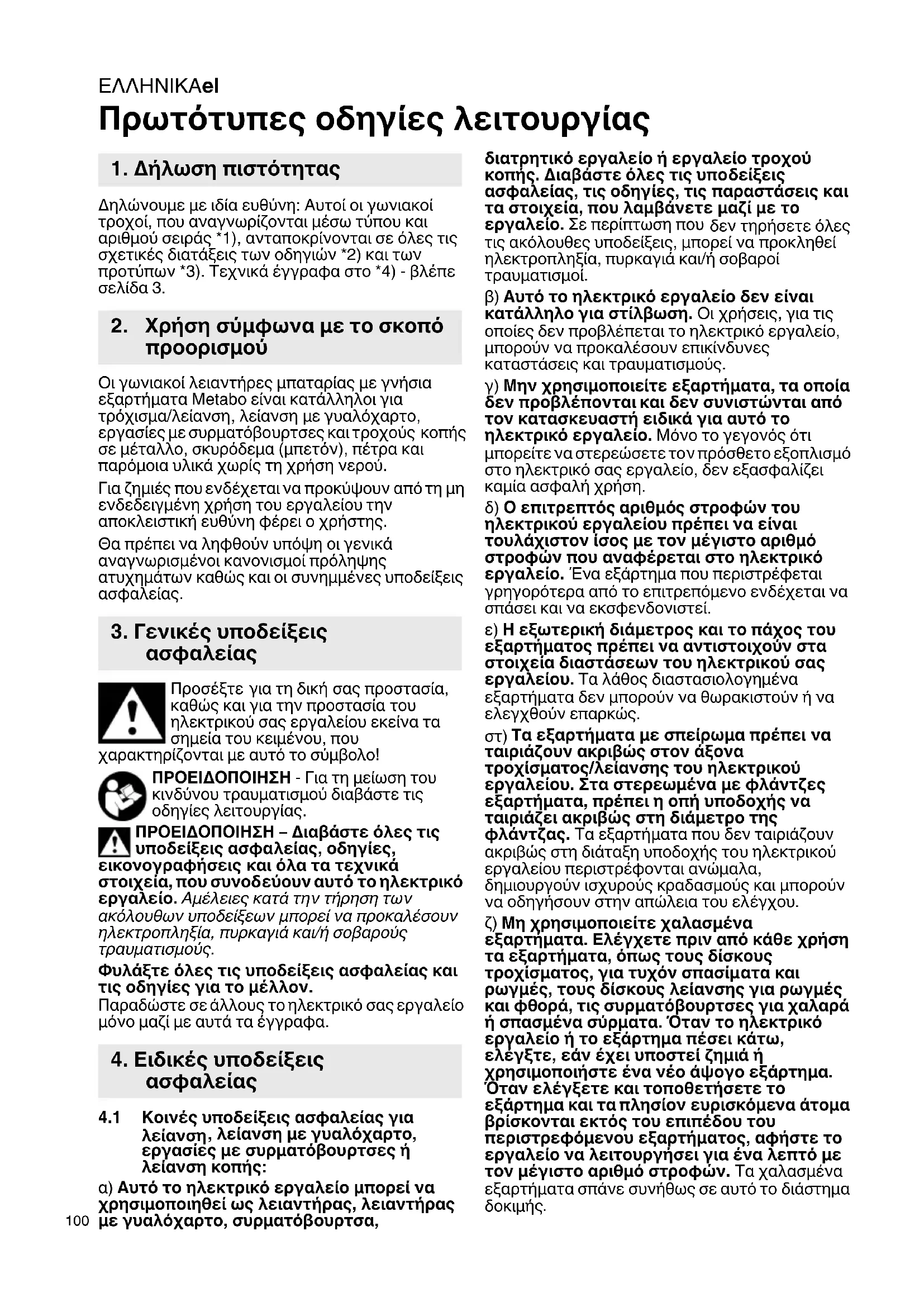 Πρωτότυπες οδηγίες λειτουργίας Δηλώνουμε με ιδία ευθύνη: Αυτοί οι γωνιακοί τροχοί, που αναγνωρίζονται μέσω τύπου και αριθμού σειράς *1), ανταποκρίνονται σε όλες τις σχετικές διατάξεις των οδηγιών *2) και των προτύπων *3). Τεχνικά έγγραφα στο *4) - βλέπε σελίδα 3. Οι γωνιακοί λειαντήρες μπαταρίας με γνήσια εξαρτήματα Metabo είναι κατάλληλοι για τρόχισμα/λείανση, λείανση με γυαλόχαρτο, εργασίες με συρματόβουρτσες και τροχούς
