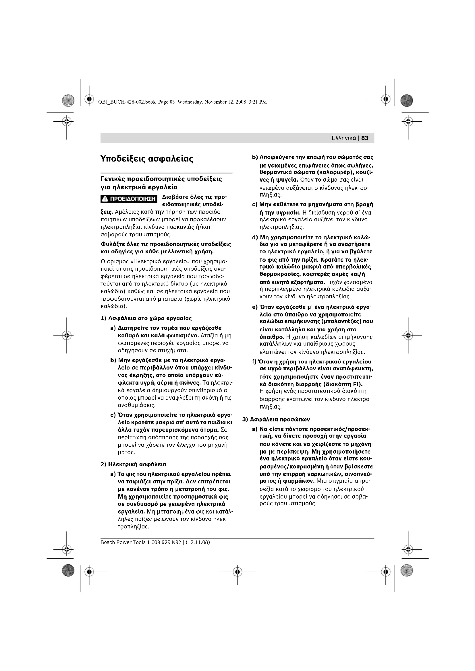 a) Μην υπερφορτώνετε το μηχάνημα. Χρη- σιμοποιείτε για την εκάστοτε εργασία το ηλεκτρικό εργαλείο που προορίζεται γι’ αυτήν. Με το κατάλληλο ηλεκτρικό εργα- λείο εργάζεστε καλύτερα και ασφαλέστερα στην αναφερόμενη περιοχή ισχύος. b) Μη χρησιμοποιήσετε ποτέ ένα μηχάνημα που έχει χαλασμένο διακόπτη. Ένα ηλεκ- τρικό εργαλείο που δεν μπορείτε πλέον να το θέσετε σε λειτουργία και/ή εκτός λει- τουργίας είναι επικίνδυνο και πρέπει να επισκευαστεί. c) Βγάζετε το φις από την πρίζα και/ή αφαιρέστε την μπαταρία πριν διεξάγετε στο μηχάνημα μια οποιαδήποτε εργασία ρύθμισης, πριν αλλάξετε ένα εξάρτημα ή όταν πρόκειται να διαφυλάξετε/να απο- θηκεύσετε το μηχάνημα. Αυτά τα προληπ- τικά μέτρα ασφαλείας μειώνουν τον κίνδυ- νο από τυχόν αθέλητη εκκίνηση του ηλεκ- τρικού εργαλείου. d) Διαφυλάγετε τα ηλεκτρικά εργαλεία που δε χρησιμοποιείτε μακριά από παιδιά. Μην επιτρέψετε τη χρήση του μηχανήμα- τος σε άτομα που δεν είναι εξοικειωμένα μ’ αυτό ή δεν έχουν διαβάσει τις παρού- σες οδηγίες. Τα ηλεκτρικά εργαλεία είναι επικίνδυνα όταν χρησιμοποιούνται από άπειρα πρόσωπα. e) Να περιποιείστε προσεκτικά το ηλεκτρι- κό εργαλείο. Ελέγχετε, αν τα κινούμενα εξαρτήματα λειτουργούν άψογα, χωρίς να μπλοκάρουν, ή μήπως έχουν σπάσει ή φθαρεί τυχόν εξαρτήματα τα οποία επ- ηρεάζουν τον τρόπο λειτουργίας του ηλεκτρικού εργαλείου. Δώστε αυτά τα χαλασμένα εξαρτήματα για επισκευή πριν τα ξαναχρησιμοποιήσετε. Η κακή συντήρηση των ηλεκτρικών εργαλείων αποτελεί αιτία πολλών ατυχημάτων. f) Διατηρείτε τα εργαλεία κοπής κοφτερά και καθαρά. Προσεκτικά συντηρημένα κοπτικά εργαλεία σφηνώνουν δυσκο- λότερα και οδηγούνται ευκολότερα. OBJ_BUCH-428-002.book Page 84 Wednesday, November 12, 2008 3:21 PMEλληνικά | 85 Bosch Power Tools 1 609 929 N92 | (12.11.08) g) Χρησιμοποιείτε ηλεκτρικά εργαλεία, εξαρτήματα, παρελκόμενα εργαλεία κτλ. σύμφωνα με τις παρούσες οδηγίες. Λαμ- βάνετε επίσης υπόψη σας τις εκάστοτε συνθήκες και την υπό εκτέλεση εργασία. Η χρησιμοποίηση των ηλεκτρικών εργα- λείων για εργασίες που δεν προβλέπονται γι’ αυτά μπορεί να δημιουργήσει επικίνδυ- νες καταστάσεις.
