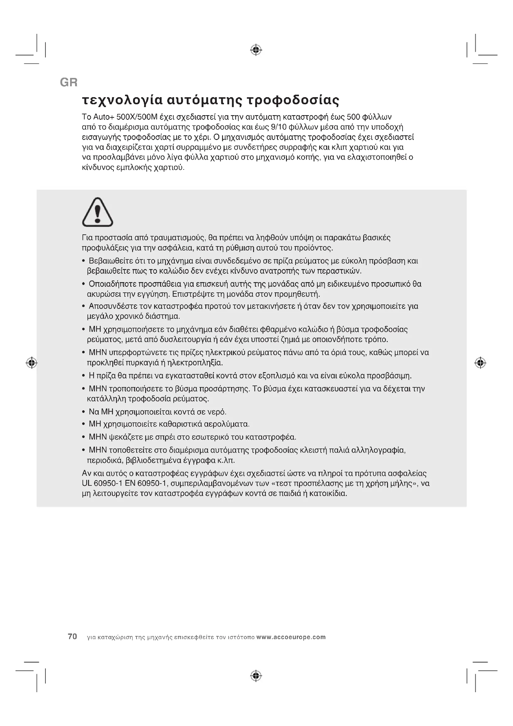 - ΜΗΝ τοποθετείτε στο διαμέρισμα αυτόματης τροφοδοσίας κλειστή παλιά αλληλογραφία, περιοδικά, βιβλιοδετημένα έγγραφα κ.λπ. Αν και αυτός ο καταστροφέας εγγράφων έχει σχεδιαστεί ώστε να πληροί τα πρότυπα ασφαλείας UL 60950-1 EN 60950-1, συμπεριλαμβανομένων των «τεστ προσπέλασης με τη χρήση μήλης», να μη λειτουργείτε τον καταστροφέα εγγράφων κοντά σε παιδιά ή κατοικίδια. τεχνολογία αυτόματης τροφοδοσίας Το Auto+ 500X/500M έχει σχεδιαστεί για την αυτόματη καταστροφή έως 500 φύλλων από το διαμέρισμα αυτόματης τροφοδοσίας και έως 9/10 φύλλων μέσα από την υποδοχή εισαγωγής τροφοδοσίας με το χέρι. Ο μηχανισμός αυτόματης τροφοδοσίας έχει σχεδιαστεί για να διαχειρίζεται χαρτί συρραμμένο με συνδετήρες συρραφής και κλιπ χαρτιού και για να προσλαμβάνει μόνο λίγα φύλλα χαρτιού στο μηχανισμό κοπής, για να ελαχιστοποιηθεί ο κίνδυνος εμπλοκής χαρτιού.AUTO+ 500X&500M ΚΑΤΑΣΤΡΟΦΈΑ 71