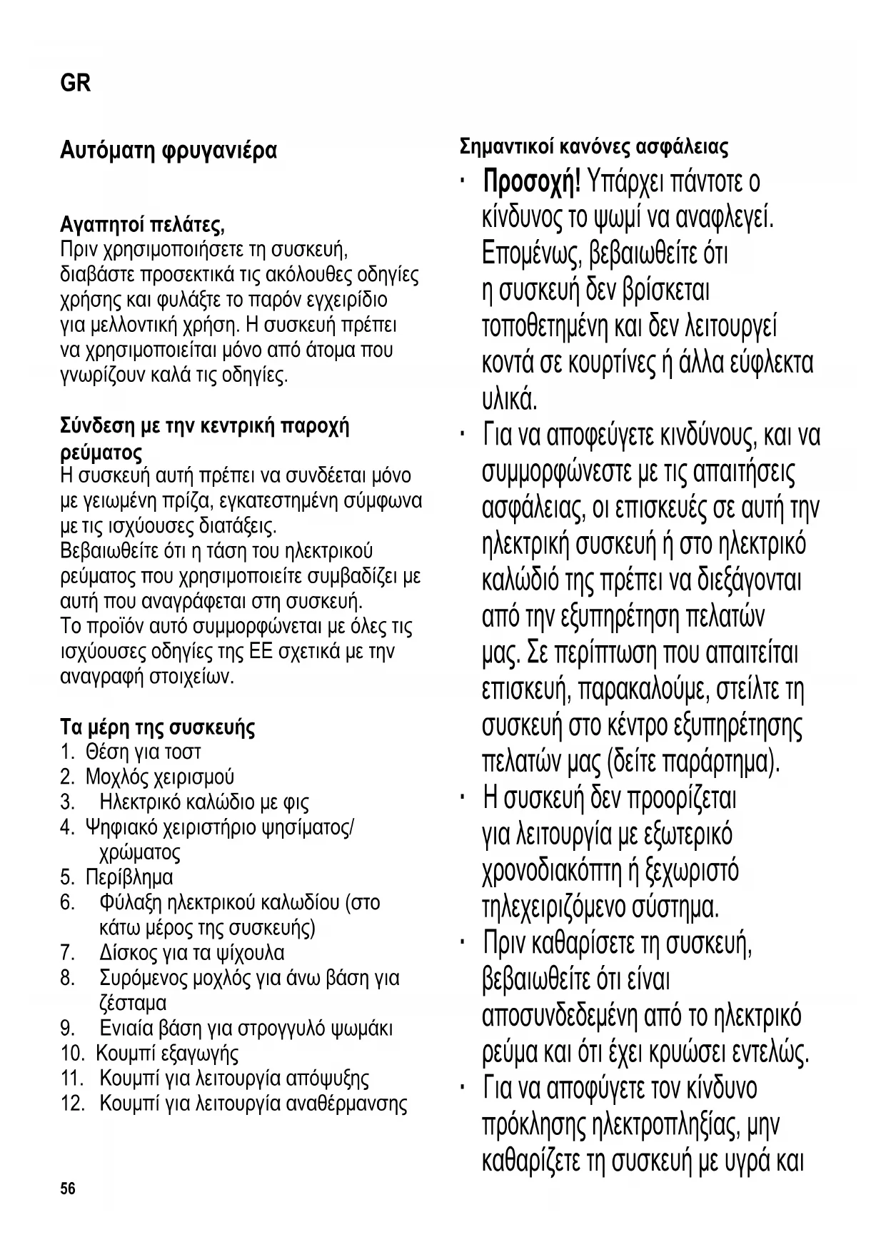 ∙ Προσοχή! Οι προσιτές επιφάνειες του κύριου τμήματος θερμαίνονται πολύ κατά τη λειτουργία. Μπορεί να προκληθούν εγκαύματα αν αγγίξετε τα θερμά μέρη. ∙ Κάθε φορά που χρησιμοποιείτε τη συσκευή, θα πρέπει να ελέγχετε προσεκτικά την κύρια μονάδα, το ηλεκτρικό καλώδιο, καθώς και κάθε58 εξάρτημα για τυχόν ελαττώματα. Αν η συσκευή, για παράδειγμα, έχει πέσει σε σκληρή επιφάνεια ή έχει ασκηθεί υπερβολική δύναμη για το τράβηγμα του ηλεκτρικού καλωδίου δεν θα πρέπει να χρησιμοποιηθεί ξανά, ακόμη κι αν η ζημιά δεν φαίνεται ότι μπορεί να προκαλέσει προβλήματα στην ασφαλή λειτουργία της συσκευής. ∙ Μην αφήνετε το ηλεκτρικό καλώδιο να αγγίζει θερμές επιφάνειες. ∙ Μην αφήνετε το ηλεκτρικό καλώδιο να κρέμεται ελεύθερο. ∙ Μην αφήνετε τη συσκευή χωρίς επιτήρηση κατά τη χρήση της. ∙ Μην καλύπτετε τη θέση για τοστ κατά τη διάρκεια της λειτουργίας. ∙ Μην προσπαθείτε να βγάλετε το ψωμί από τη φρυγανιέρα με τα δάκτυλά σας, ούτε να βάλετε μέσα στις θέσεις για φέτες ψωμί κάποιο αντικείμενο (όπως μαχαίρια, πιρούνια) επειδή τα θερμαινόμενα στοιχεία είναι ηλεκτροφόρα. ∙ Βγάζετε πάντοτε το καλώδιο από την