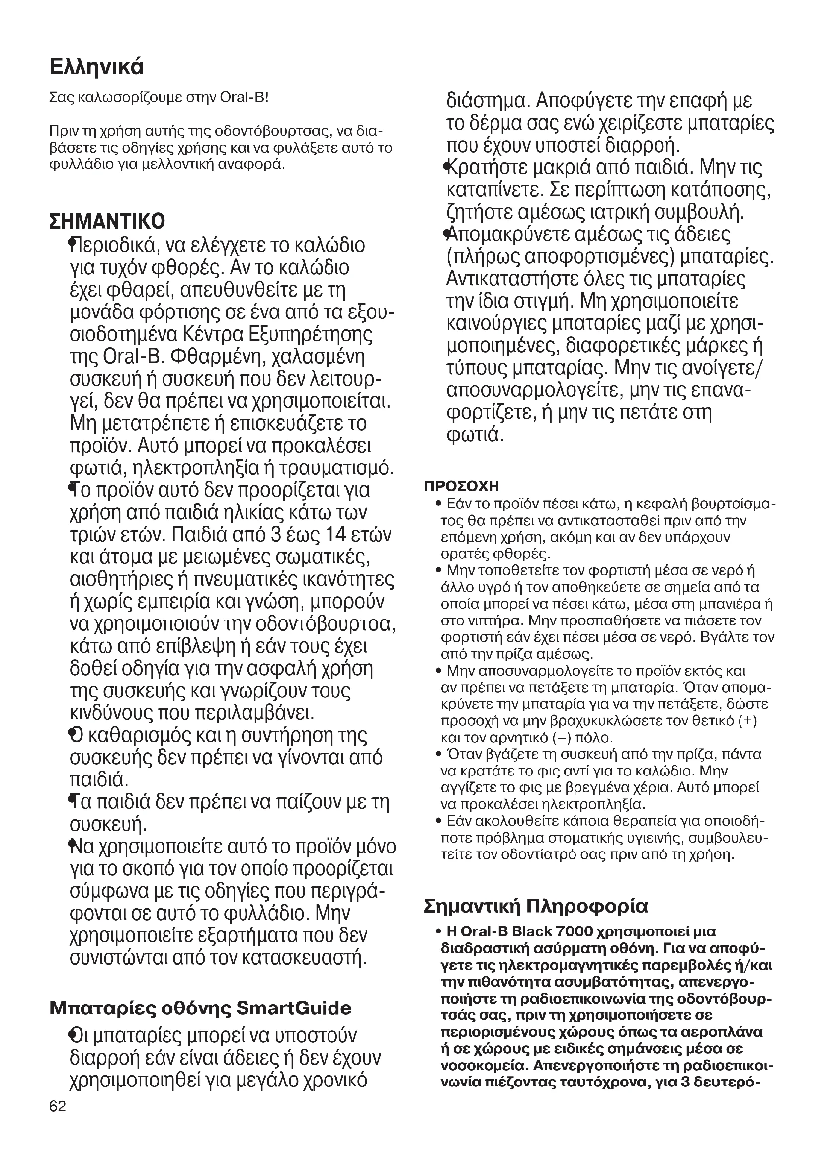 Παραχωρούμε δύο χρόνια εγγύηση στο προϊόν, ξεκινώντας από την ημερομηνία αγοράς. Μέσα στην περίοδο εγγύησης καλύπτουμε, χωρίς χρέωση, οποιοδήποτε ελάττωμα της συσκευής, προερχόμενο από κακής ποιότητας υλικό ή κακή κατασκευή, είτε επισκευάζοντας, είτε αντικαθιστώντας ολόκληρη την συσκευή, σύμφωνα με την κρίση μας. Αυτή η εγγύηση ισχύει για όλες τις χώρες που η συσκευή προμηθεύεται από την Braun ή από τον αποκλειστικό αντιπρόσωπο της. Η εγγύηση αυτή δεν καλύπτει: Καταστροφή από κακή χρήση, φυσιολογική φθορά από τη χρήση, ειδικά όσον αφορά τις κεφαλές βουρτσίσματος, όπως επίσης βλάβες οι οποίες έχουν αμελητέα επίπτωση στην αξία ή στη λειτουργία της συσκευής. Η εγγύηση ακυρώνεται εάν έχουν γίνει επισκευές από μη εξουσιοδοτημένα άτομα και δεν έχουν χρησιμοποιηθεί γνήσια ανταλλακτικά Braun. Για να επιτύχετε Service μέσα στην περίοδο της εγγύησης, παραδώστε ή στείλτε ολόκληρη τη συσκευή με την απόδειξη αγοράς σε ένα εξουσιοδοτημένο Κέντρο Εξυπηρέτησης της Oral-B Braun. Εγγύηση ανταλλακτικών κεφαλών βουρτσίσματος Η εγγύηση Oral-B ακυρώνεται εάν η φθορά της ηλεκτρικής επαναφορτιζόμενης λαβής έχει προκληθεί από τη χρήση ανταλλακτικών κεφαλών βουρτσίσματος που δεν είναι Oral-B. H Oral-B δεν συνιστά τη χρήση ανταλλακτικών κεφαλών βουρτσίσματος που δεν είναι Oral-B.
