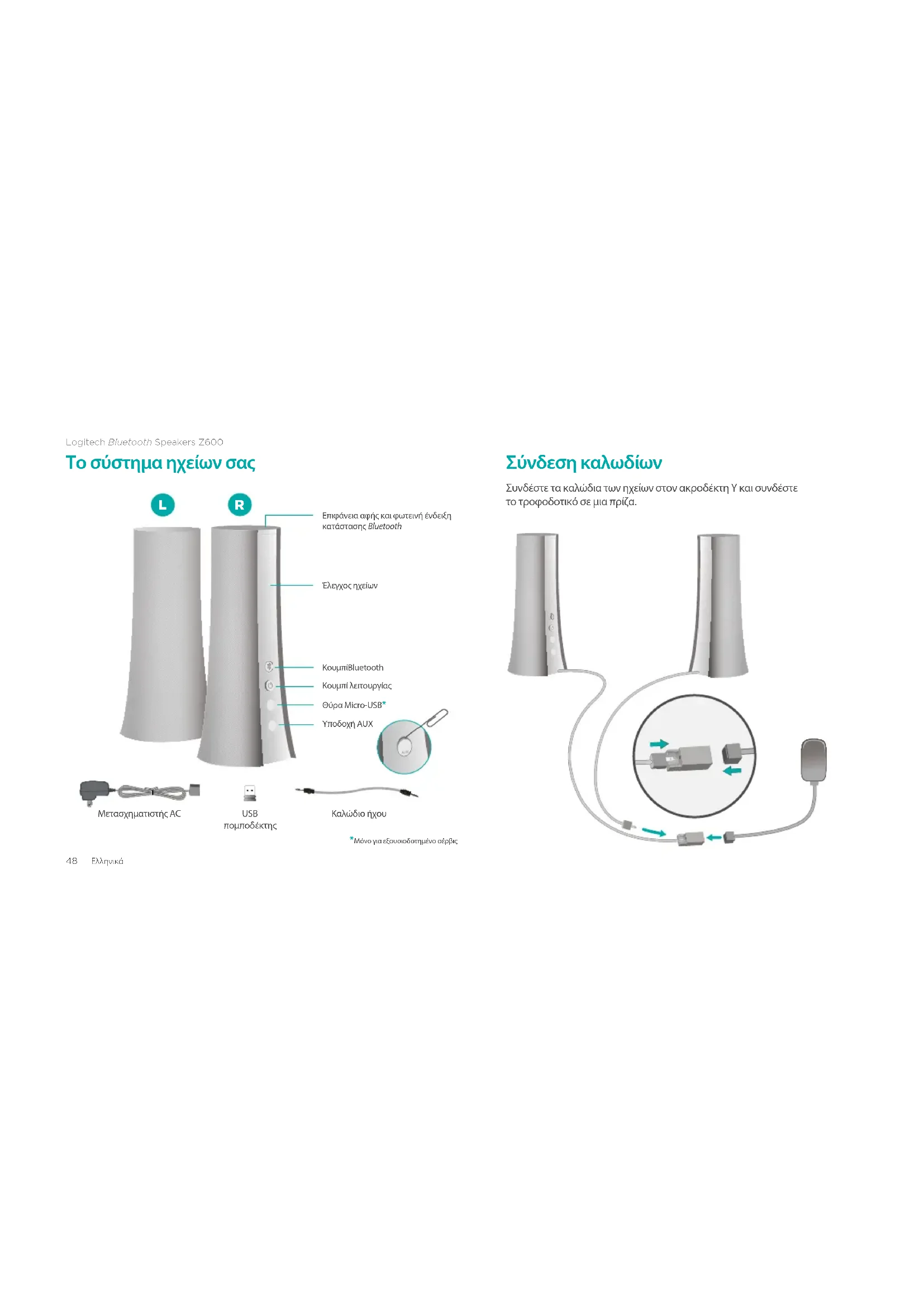 Κάντε δεξιό κλικ στο εικονίδιοήχου, στη γραμμή εργασιών και επιλέξτε «Συσκευέςαναπαραγωγής» από το μενού περιβάλλοντος. Στην καρτέλα «Αναπαραγωγή», επιλέξτε «LogitechZ600» από τη λίστα με τις συσκευές και κάντε κλικ στο κουμπί «Επόμενο». Επιλέξτε το σύμβολο «Ρυθμίσεις» και μετά επιλέξτε «Αλλαγή ρυθμίσεων PC». Κάντεκλικ στην επιλογή «Συσκευές» και επιλέξτε «LogitechZ600» από τη λίστα με τιςσυσκευές. Αφιερώστε λίγο χρόνο για να μας πείτε. Σας ευχαριστούμε για την αγορά του προϊόντος μας. www.logitech.com/ithinkLogitech Bluetooth Speakers Z60052 По-русски Кнопка BluetoothУправляющая колонкаСенсорный диск и индикатор состояния BluetoothРазъем AUXПорт микро-USB*Кнопка питания Акустическая система USB-