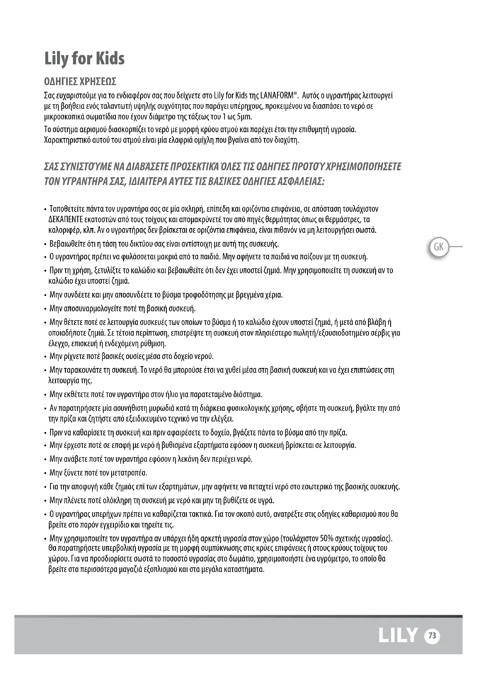 ΠΕΡΙΟΡΙΣΜΕΝΗ ΕΓΓΥΗΣΗ: Η LANAFORM® εγγυάται για διάστημα δύο ετών από την ημερομηνία αγοράς του ότι αυτό το προϊόν δεν φέρει κατασκευαστικά ή υλικά ελαττώματα, με εξαίρεση τις παρακάτω περιπτώσεις: Η εγγύηση για αυτό το προϊόν LANAFORM® δεν καλύπτει οποιαδήποτε ζημιά προκληθεί ως συνέπεια κακής ή λανθασμένης χρήσης, ατυχήματος, χρήσης εξαρτημάτων που δεν επιτρέπονται, όποιας μεταβολής επιφερθεί επί του προϊόντος ή οποιασδήποτε άλλης περίστασης υπεράνω ελέγχου της LANAFORM®. Η LANAFORM® δεν μπορεί να θεωρηθεί υπεύθυνη για περαιτέρω, δευτερεύουσες ή ιδιαίτερες αποζημιώσεις. Όλες οι νόμιμες εγγυήσεις επί των προϊόντων ευεξίας παρέχονται για συνολικό διάστημα δύο ετών από την ημερομηνία αγοράς του προϊόντος. Κατόπιν παραλαβής, η LANAFORM® θα επιδιορθώσει ή θα αντικαταστήσει, κατά περίπτωση, τον υγραντήρα υπερήχων σας και θα σας το επιστρέψει, αναλαμβάνοντας τα έξοδα αποστολής. Η εγγύηση ισχύει μόνο μέσω του Κέντρου Συντήρησης της LANAFORM®. Σε περίπτωση που η συντήρηση αυτού του προϊόντος ανατεθεί σε άτομα εκτός του Κέντρου Συντήρησης της LANAFORM®, αυτό καθιστά την παρούσα εγγύηση άκυρη. LILY 77PO LILY for Kids