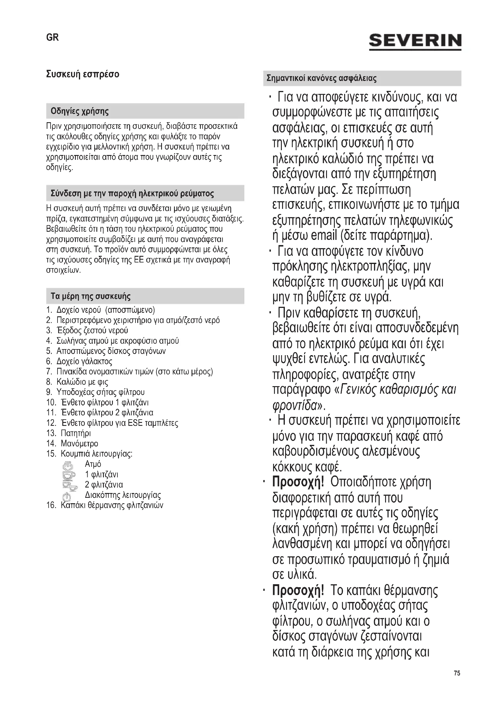 ∙ Προσοχή! Το καπάκι θέρμανσης φλιτζανιών, ο υποδοχέας σήτας φίλτρου, ο σωλήνας ατμού και ο δίσκος σταγόνων ζεσταίνονται κατά τη διάρκεια της χρήσης και GR76 142 x 208 mm παραμένουν ζεστά για αρκετό χρόνο μετέπειτα - υπάρχει μεγάλος κίνδυνος πρόκλησης εγκαυμάτων. ∙ Προσοχή! Κατά τη λειτουργία, να φυλάσσετε πάντα τα χέρια σας μακριά από τα ανοίγματα των εξόδων (έξοδος ζεστού νερού, υποδοχέας σήτας φίλτρου, ακροφύσιο ατμού - υπάρχει κίνδυνος πρόκλησης εγκαυμάτων. ∙ Η συσκευή αυτή μπορεί να χρησιμοποιηθεί από παιδιά (τουλάχιστον 8 χρονών) και από άτομα με μειωμένες φυσικές, αισθητήριες ή διανοητικές ικανότητες ή χωρίς πείρα και γνώσεις, αν επιτηρούνται ή τους έχουν δοθεί οδηγίες σχετικά με τη χρήση της συσκευής και κατανοούν πλήρως όλους τους εμπλεκόμενους κίνδυνους και προφυλάξεις για την ασφάλεια. ∙ Τα παιδιά δεν πρέπει να επιτρέπεται να παίζουν με τη συσκευή. ∙ Δεν πρέπει να επιτρέπεται στα παιδιά να εκτελούν οποιαδήποτε εργασία καθαρισμού ή συντήρησης στη συσκευή εκτός εάν επιτηρούνται και είναι τουλάχιστον 8 ετών. ∙ Κρατήστε πάντα τη συσκευή και το ηλεκτρικό καλώδιό της μακριά από παιδιά κάτω των 8 ετών. ∙ Η συσκευή δεν πρέπει να λειτουργεί μέσα σε κλειστό ντουλάπι. ∙ Η συσκευή αυτή προορίζεται για οικιακή χρήση ή παρόμοιες χρήσεις, όπως για παράδειγμα: - σε κουζίνες εταιρειών, σε γραφεία και άλλα εργασιακά περιβάλλοντα, - σε γεωργικές εταιρείες, - από πελάτες σε ξενοδοχεία, πανδοχεία κτλ. και παρόμοιες εγκαταστάσεις, - σε ξενώνες που σερβίρουν πρωινό. ∙ Κάθε φορά που χρησιμοποιείτε τη συσκευή, θα πρέπει να ελέγχετε προσεκτικά την κύρια μονάδα, το ηλεκτρικό καλώδιο, καθώς και κάθε εξάρτημα για τυχόν ελαττώματα. Αν η συσκευή, για παράδειγμα, έχει πέσει σε σκληρή επιφάνεια ή έχει ασκηθεί υπερβολική δύναμη για το τράβηγμα του ηλεκτρικού καλωδίου δεν θα πρέπει να χρησιμοποιηθεί ξανά, ακόμη κι αν η ζημιά δεν φαίνεται ότι μπορεί να προκαλέσει προβλήματα στην ασφαλή λειτουργία της συσκευής. ∙ Μην ανοίξετε το ακροφύσιο ατμού εάν δεν έχει τοποθετηθεί από κάτω ένα κατάλληλο σκεύος. Προσοχή: Υπάρχει κίνδυνος να προκληθούν εγκαύματα από το ζεστό ατμό. ∙ Προσοχή! Μόνο φλιτζάνια πρέπει να τοποθετούνται στο καπάκι θέρμανσης φλιτζανιών. ∙ Πριν θέσετε τη συσκευή εσπρέσο σε λειτουργία, βεβαιωθείτε ότι η συσκευή είναι γεμάτη με νερό. ∙ Μην υπερβαίνετε την ένδειξη MAX στο δοχείο νερού. ∙ Να χρησιμοποιείτε μόνο φρέσκο, καθαρό νερό βρύσης. ∙ Κατά τη λειτουργία, η συσκευή θα πρέπει να βρίσκεται τοποθετημένη σε επίπεδη, αντιολισθητική επιφάνεια που δεν θα καταστραφεί από λεκέδες. ∙ Μη θέτετε τη συσκευή σε λειτουργία κάτω από κρεμαστό ντουλάπι ή παρόμοιο αντικείμενο. Υπάρχει κίνδυνος ο ατμός που απελευθερώνεται να παγιδευτεί κάτω από τέτοια αντικείμενα. ∙ Μην αφήνετε το ηλεκτρικό καλώδιο να αγγίζει οποιοδήποτε θερμό σημείο της συσκευής. ∙ Μην απομακρύνεστε όταν η συσκευή εσπρέσο βρίσκεται σε λειτουργία. Μην τοποθετείτε τη συσκευή επάνω ή κοντά σε ζεστές επιφάνειες, γυμνή φλόγα ή εύφλεκτο ατμό. ∙ Προσοχή! Τα παιδιά πρέπει να παραμένουν μακριά από τα υλικά συσκευασίας, επειδή είναι δυνητικώς επικίνδυνα, π.χ. κίνδυνος ασφυξίας. ∙ Βγάζετε πάντοτε το καλώδιο από την πρίζα - σε περίπτωση βλάβης, - πριν καθαρίσετε τη συσκευή, - μετά τη χρήση. ∙ Όταν βγάζετε το φις από την πρίζα, ποτέ μην τραβάτε το ηλεκτρικό καλώδιο. Να πιάνετε πάντα το φις. ∙ Μην αγγίζετε το φις μ