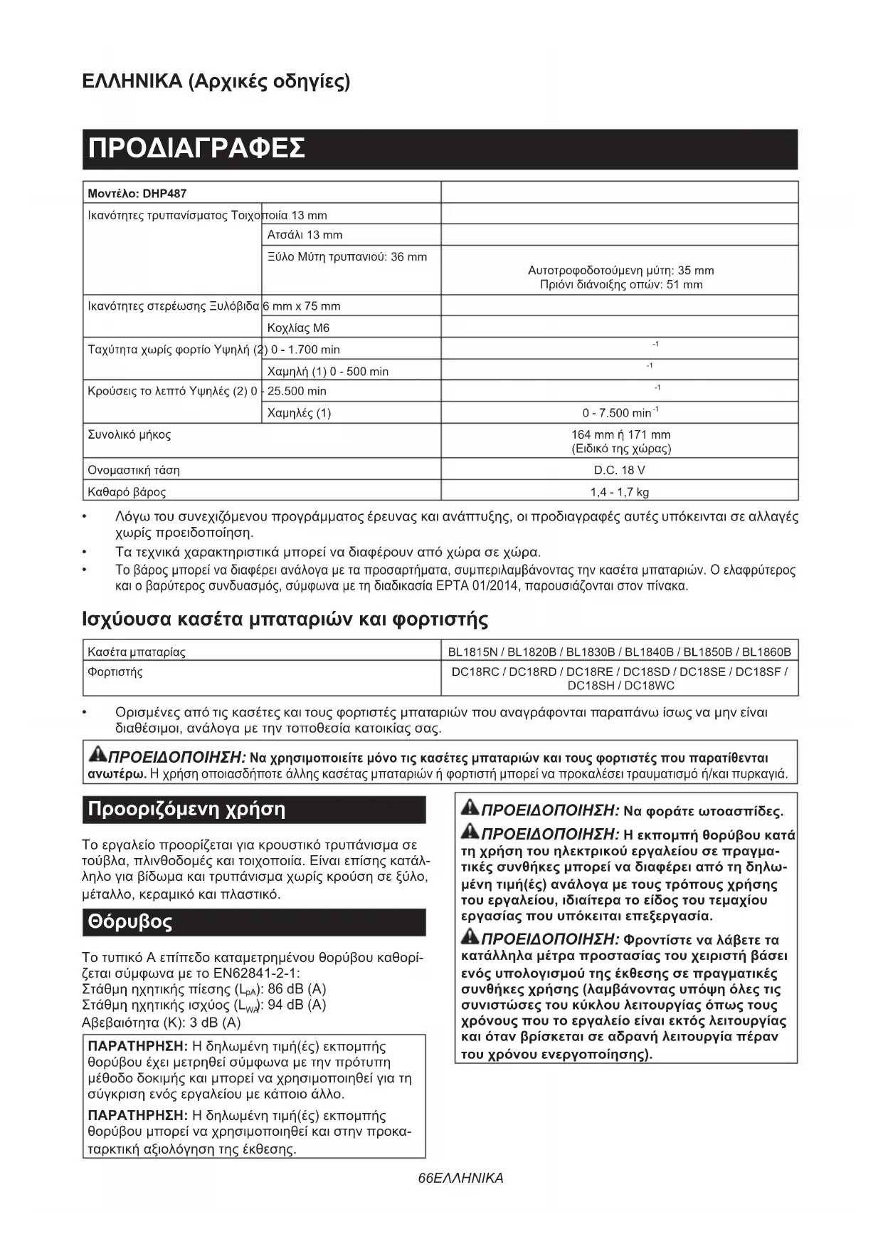 - Original Makita-akku og oplader BEMÆRK: Nogle ting på denne liste kan være inklu- deret i værktøjspakken som standardtilbehør. Det kan være forskellige fra land til land.66 ΕΛΛΗΝΙΚΑ ΕΛΛΗΝΙΚΑ (Αρχικές οδηγίες) ΠΡΟΔΙΑΓΡΑΦΕΣ Μοντέλο: DHP487 Ικανότητες τρυπανίσματος Τοιχοποιία 13 mm Ατσάλι 13 mm Ξύλο Μύτη τρυπανιού: 36 mm Αυτοτροφοδοτούμενη μύτη: 35 mm Πριόνι διάνοιξης οπών: 51 mm Ικανότητες στερέωσης Ξυλόβιδα 6 mm x 75 mm Κοχλίας M6 Ταχύτητα χωρίς φορτίο Υψηλή (2) 0 - 1.700 min