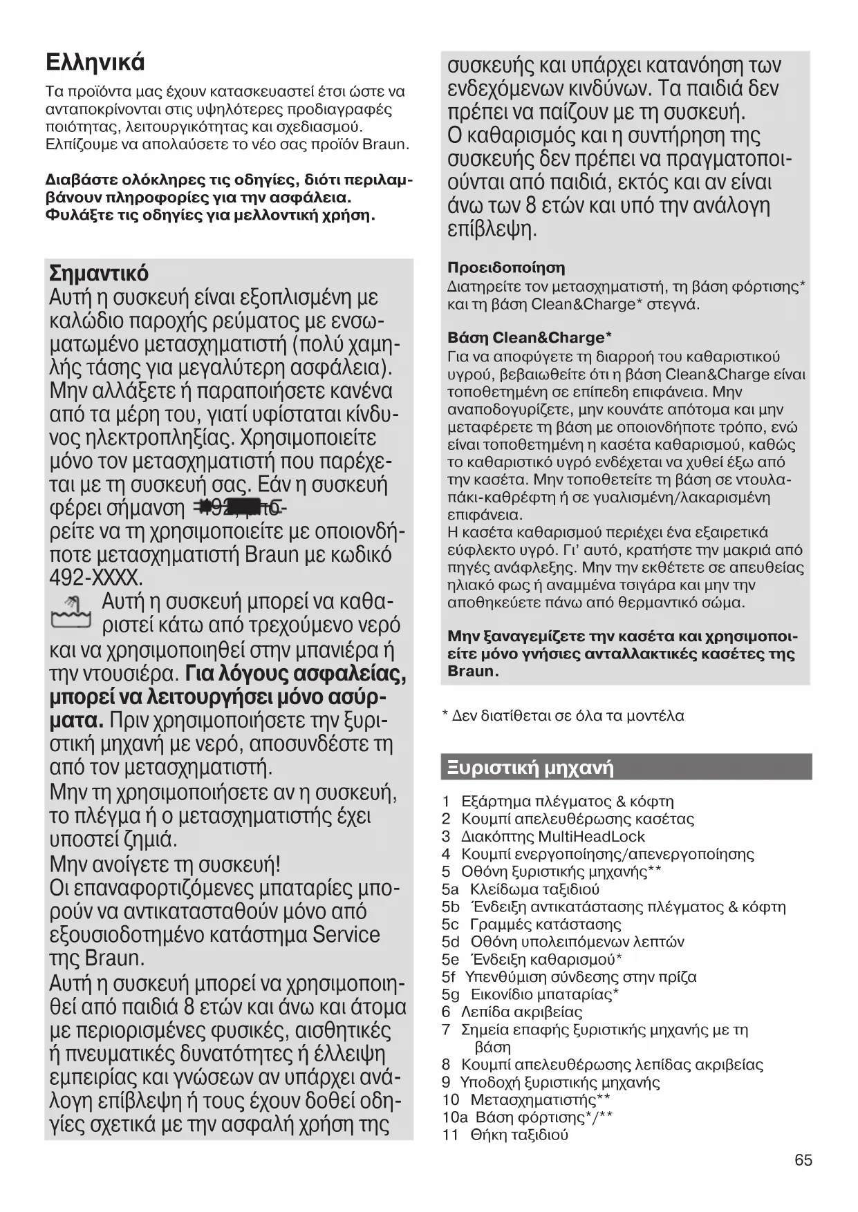 Αυτή η συσκευή είναι εξοπλισμένη με καλώδιο παροχής ρεύματος με ενσω- ματωμένο μετασχηματιστή (πολύ χαμη- λής τάσης για μεγαλύτερη ασφάλεια). Μην αλλάξετε ή παραποιήσετε κανένα από τα μέρη του, γιατί υφίσταται κίνδυ- νος ηλεκτροπληξίας. Χρησιμοποιείτε μόνο τον μετασχηματιστή που παρέχε- ται με τη συσκευή σας. Εάν η συσκευή φέρει σήμανση 492, μπο- ρείτε να τη χρησιμοποιείτε με οποιονδή- ποτε μετασχηματιστή Braun με κωδικό 492-XXXX. Αυτή η συσκευή μπορεί να καθα- ριστεί κάτω από τρεχούμενο νερό και να χρησιμοποιηθεί στην μπανιέρα ή την ντουσιέρα. Για λόγους ασφαλείας, μπορεί να λειτουργήσει μόνο ασύρ- ματα. Πριν χρησιμοποιήσετε την ξυρι- στική μηχανή με νερό, αποσυνδέστε τη από τον μετασχηματιστή. Μην τη χρησιμοποιήσετε αν η συσκευή, το πλέγμα ή ο μετασχηματιστής έχει υποστεί ζημιά. Μην ανοίγετε τη συσκευή! Οι επαναφορτιζόμενες μπαταρίες μπο- ρούν να αντικατασταθούν μόνο από εξουσιοδοτημένο κατάστημα Service της Braun. Αυτή η συσκευή μπορεί να χρησιμοποιη- θεί από παιδιά 8 ετών και άνω και άτομα με περιορισμένες φυσικές, αισθητικές ή πνευματικές δυνατότητες ή έλλειψη εμπειρίας και γνώσεων αν υπάρχει ανά- λογη επίβλεψη ή τους έχουν δοθεί οδη- γίες σχετικά με την ασφαλή χρήση της συσκευής και υπάρχει κατανόηση των ενδεχόμενων κινδύνων. Τα παιδιά δεν πρέπει να παίζουν με τη συσκευή. Ο καθαρισμός και η συντήρηση της συσκευής δεν πρέπει να πραγματοποι- ούνται από παιδιά, εκτός και αν είναι άνω των 8 ετών και υπό την ανάλογη