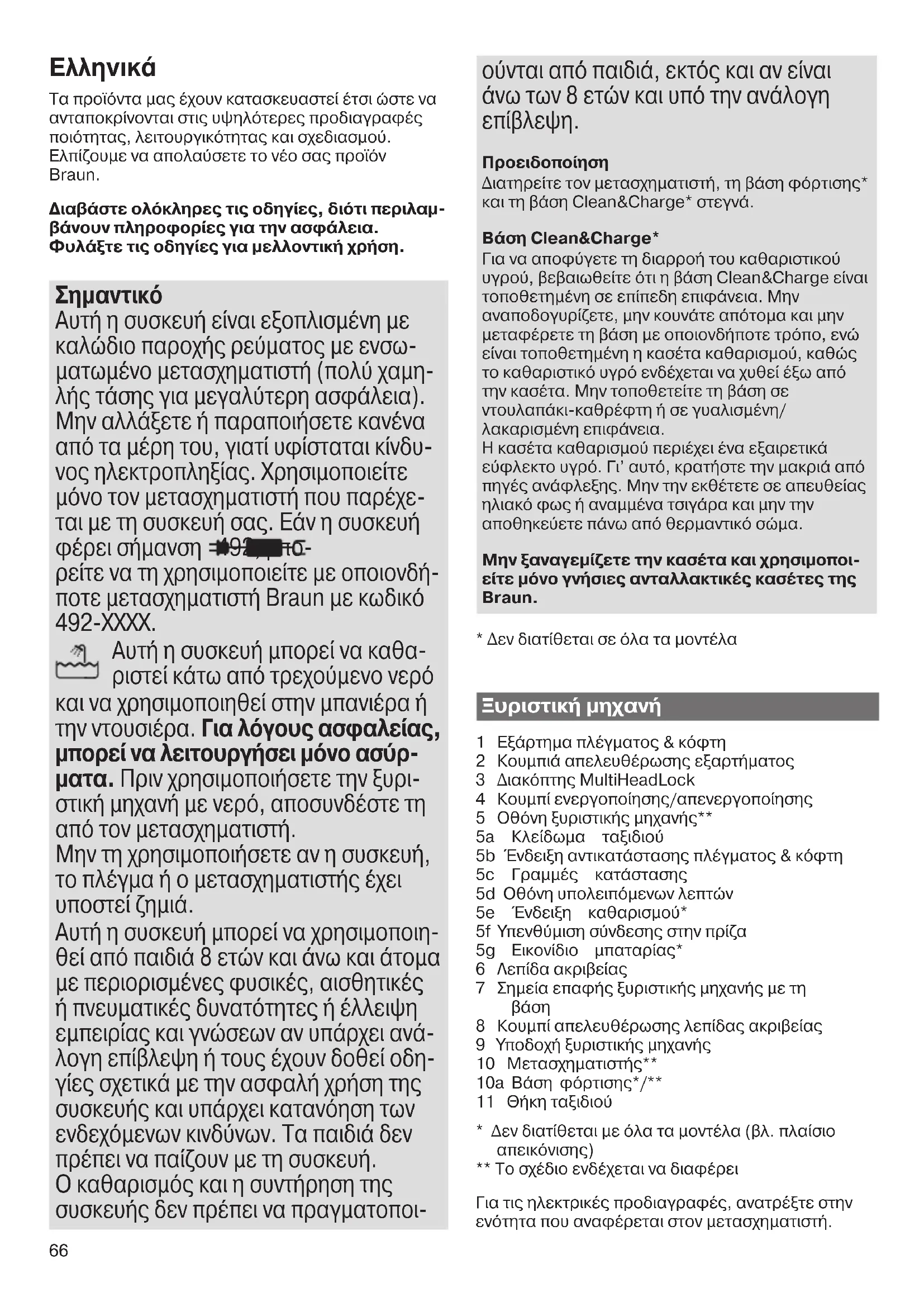 Αυτή η συσκευή είναι εξοπλισμένη με καλώδιο παροχής ρεύματος με ενσω- ματωμένο μετασχηματιστή (πολύ χαμη- λής τάσης για μεγαλύτερη ασφάλεια). Μην αλλάξετε ή παραποιήσετε κανένα από τα μέρη του, γιατί υφίσταται κίνδυ- νος ηλεκτροπληξίας. Χρησιμοποιείτε μόνο τον μετασχηματιστή που παρέχε- ται με τη συσκευή σας. Εάν η συσκευή φέρει σήμανση 492, μπο- ρείτε να τη χρησιμοποιείτε με οποιονδή- ποτε μετασχηματιστή Braun με κωδικό 492-XXXX. Αυτή η συσκευή μπορεί να καθα- ριστεί κάτω από τρεχούμενο νερό και να χρησιμοποιηθεί στην μπανιέρα ή την ντουσιέρα. Για λόγους ασφαλείας, μπορεί να λειτουργήσει μόνο ασύρ- ματα. Πριν χρησιμοποιήσετε την ξυρι- στική μηχανή με νερό, αποσυνδέστε τη από τον μετασχηματιστή. Μην τη χρησιμοποιήσετε αν η συσκευή, το πλέγμα ή ο μετασχηματιστής έχει υποστεί ζημιά. Αυτή η συσκευή μπορεί να χρησιμοποιη- θεί από παιδιά 8 ετών και άνω και άτομα με περιορισμένες φυσικές, αισθητικές ή πνευματικές δυνατότητες ή έλλειψη εμπειρίας και γνώσεων αν υπάρχει ανά- λογη επίβλεψη ή τους έχουν δοθεί οδη- γίες σχετικά με την ασφαλή χρήση της συσκευής και υπάρχει κατανόηση των ενδεχόμενων κινδύνων. Τα παιδιά δεν πρέπει να παίζουν με τη συσκευή. Ο καθαρισμός και η συντήρηση της συσκευής δεν πρέπει να πραγματοποι- ούνται από παιδιά, εκτός και αν είναι άνω των 8 ετών και υπό την ανάλογη