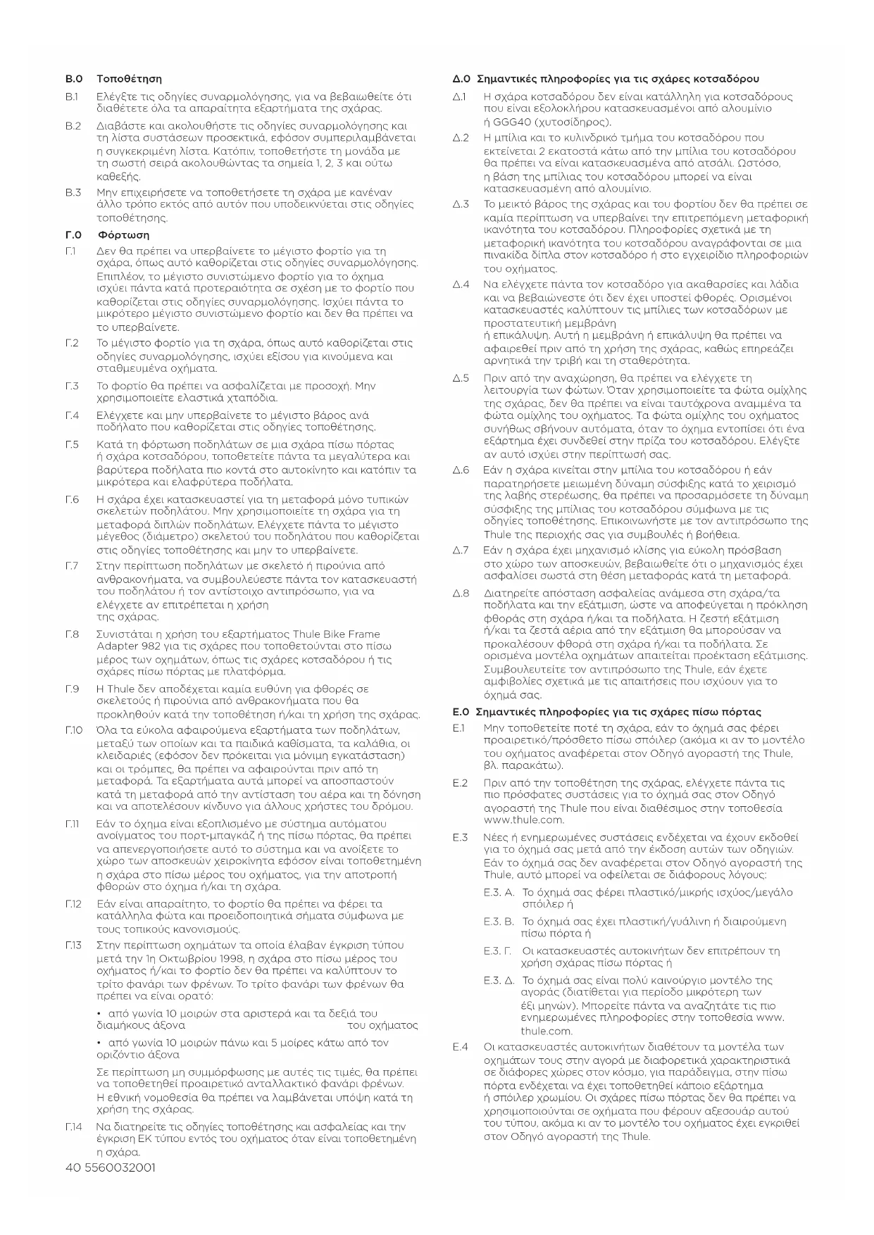 Α.0 Γενικά Α.1 Η Thule δεν αποδέχεται καμία ευθύνη για ανθρώπινο τραυματισμό, πρόκληση φθοράς σε κινητή ή ακίνητη περιουσία, απώλεια κερδών και απώλειες ή βλάβες άλλου είδους, οι οποίες οφείλονται σε ακατάλληλη τοποθέτηση ή χρήση της σχάρας, συμπεριλαμβανομένης, χωρίς περιορισμό, της τοποθέτησης ή της χρήσης αντίθετα με τις οδηγίες συναρμολόγησης, τοποθέτησης ή άλλες οδηγίες που παρέχονται, εγγράφως ήπροφορικώς, από την Thule ή από έναν αντιπρόσωπο τηςThule. Α.2 Απαγορεύεται η οποιαδήποτε τροποποίηση της σχάρας και των εξαρτημάτων της. Α.3 Επικοινωνήστε με τον αντιπρόσωπο της Thule, εάν έχετε απορίες σχετικά με τη λειτουργία, τη χρήση και τους περιορισμούς της σχάρας. Διαβάστε όλες τις οδηγίες και τις πληροφορίες εγγύησης προσεκτικά πριν από την τοποθέτηση και τη χρήση της σχάρας.40 5560032001 Β.0 Τοποθέτηση Β.1 Ελέγξτε τις οδηγίες συναρμολόγησης, για να βεβαιωθείτε ότι διαθέτετε όλα τα απαραίτητα εξαρτήματα της σχάρας. Β.2 Διαβάστε και ακολουθήστε τις οδηγίες συναρμολόγησης και τη λίστα συστάσεων προσεκτικά, εφόσον συμπεριλαμβάνεται η συγκεκριμένη λίστα. Κατόπιν, τοποθετήστε τη μονάδα με τη σωστή σειρά ακολουθώντας τα σημεία 1, 2, 3 και ούτω