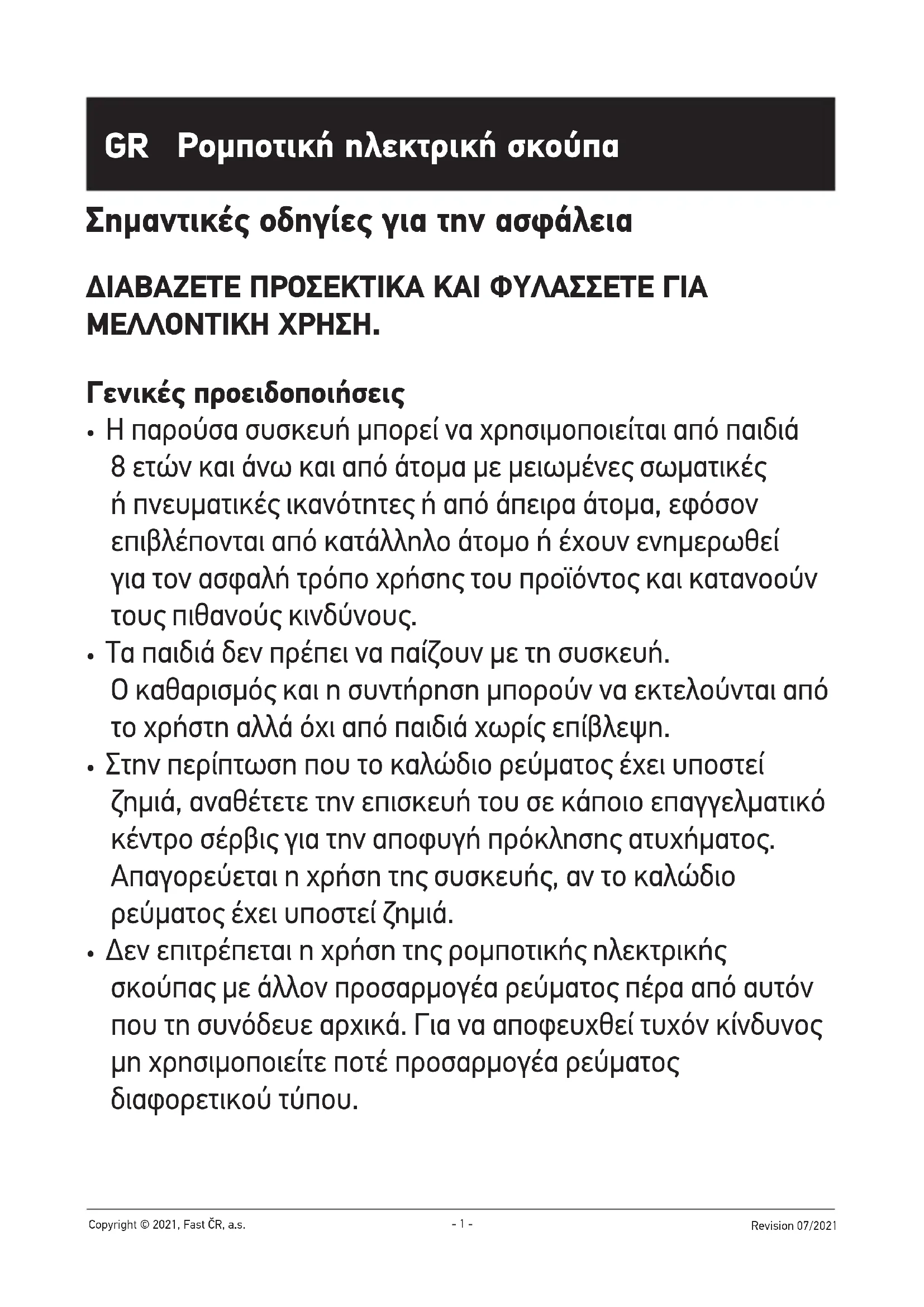 - Γιανααποφύγετετονκίνδυνοτραυματισμούαπό ηλεκτροπληξία,μηνεπισκευάζετετηρομποτική ηλεκτρικήσκούπαμόνος/-ησαςκαιμηνπραγματοποιείτε ρυθμίσεις.Όλεςοιεπισκευέςπρέπειναεκτελούνται σεεξουσιοδοτημένοκέντροσέρβις.Επεμβαίνονταςο ίδιος/ηίδιαστηρομποτικήηλεκτρικήσκούπακατάτη- 5 - Revision 07/2021 Copyright © 2021, Fast ČR, a.s. διάρκειατηςπεριόδουεγγύησης,διατρέχετετονκίνδυνο ακύρωσήςτης.