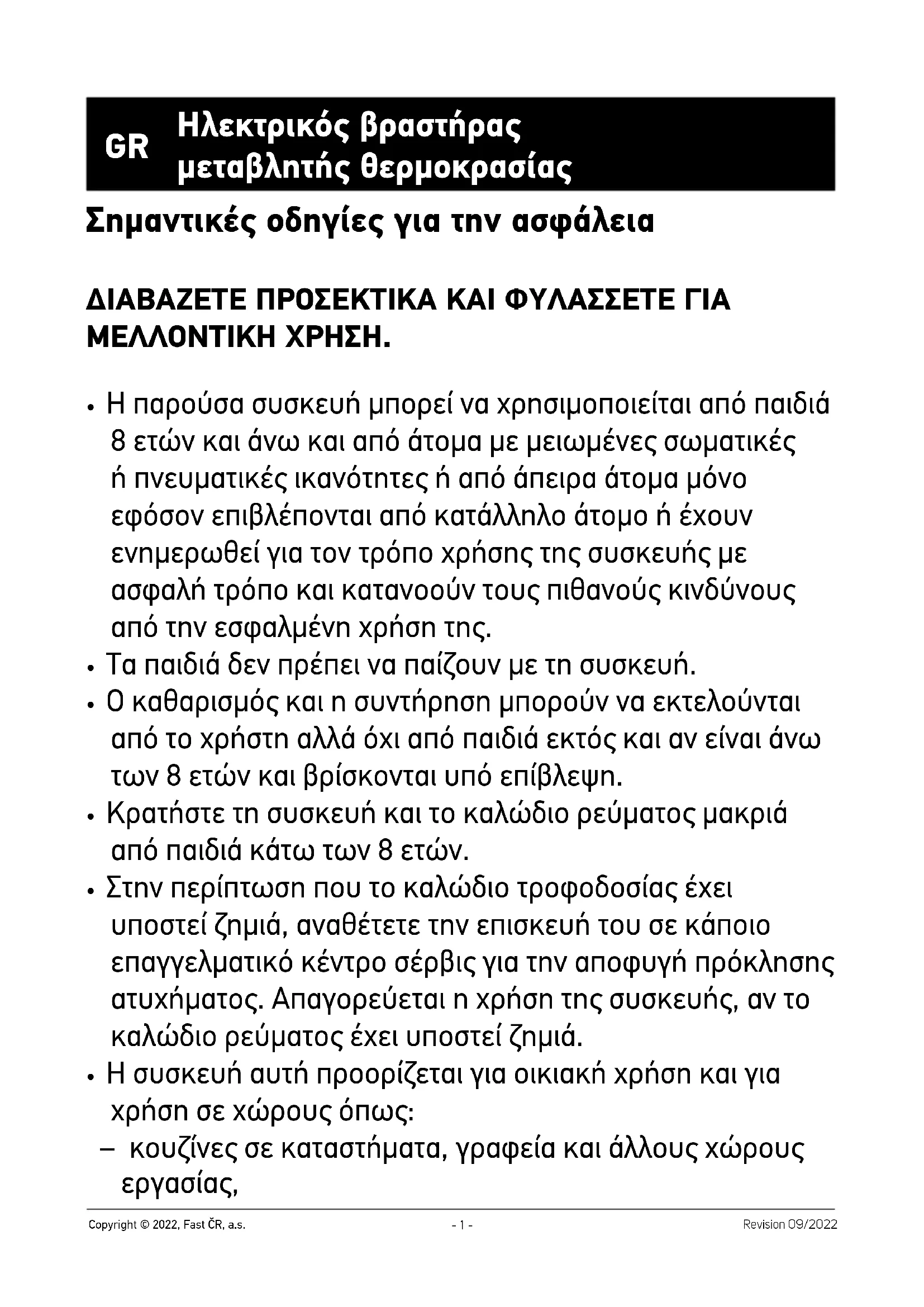 - Η συσκευή αυτή προορίζεται για οικιακή χρήση και για χρήση σε χώρους όπως: – κουζίνες σε καταστήματα, γραφεία και άλλους χώρους εργασίας,- 2 - Revision 09/2022 Copyright © 2022, Fast ČR, a.s. – στον γεωργικό τομέα, – για πελάτες ξενοδοχείων, μοτέλ και άλλων παρόμοιων