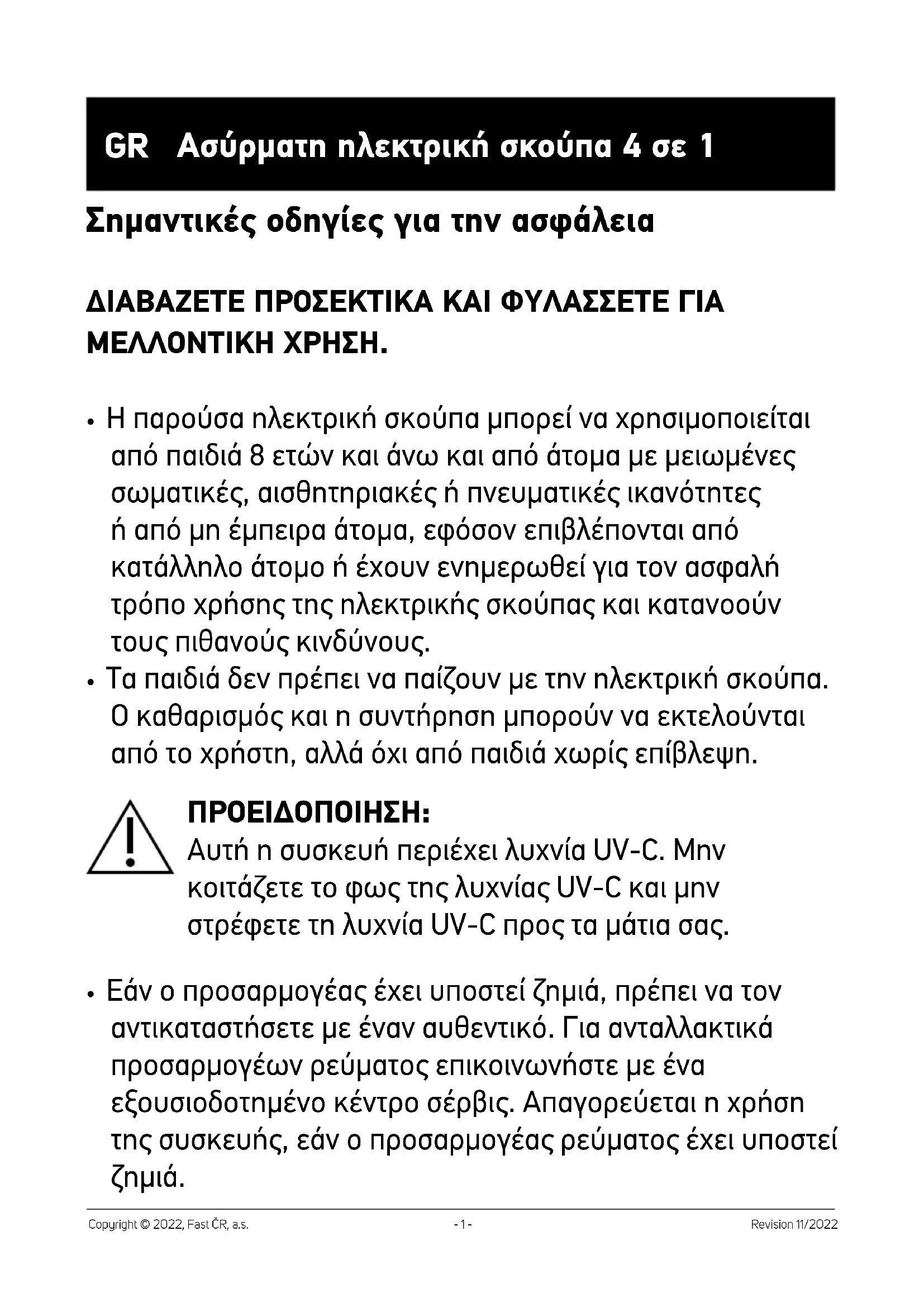 - Εάν ο προσαρμογέας έχει υποστεί ζημιά, πρέπει να τον αντικαταστήσετε με έναν αυθεντικό. Για ανταλλακτικά προσαρμογέων ρεύματος επικοινωνήστε με ένα εξουσιοδοτημένο κέντρο σέρβις. Απαγορεύεται η χρήση της συσκευής, εάν ο προσαρμογέας ρεύματος έχει υποστεί ζημιά.- 2 - Revision 11/2022 Copyright © 2022, Fast ČR, a.s. ΠΡΟΕΙΔΟΠΟΙΗΣΗ: Αποφύγετε την επαφή με τα περιστρεφόμενα μέρη των εξαρτημάτων χειρός της ηλεκτρικής σκούπας. Ύπάρχει κίνδυνος να μαγκώσετε στα μέρη αυτά και πιθανόν να τραυματιστείτε. Χρησιμοποιείτε την ηλεκτρική σκούπα μόνο με τον αυθεντικό προσαρμογέα ισχύος, τη βάση φόρτισης και τα εξαρτήματα που παρέχονται με αυτήν.
