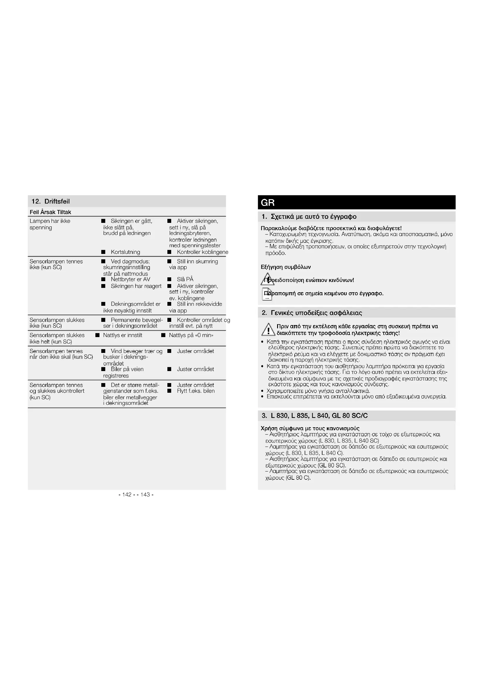 Αισθητήριος λαμπτήρας ενεργοποιείται ανεπιθύ- μητα (μόνο SC) ■ Ο άνεμος φυσάει δέν- δρα και θάμνους στην περιοχή κάλυψης ■ Ανίχνευση αυτοκινή- των στο δρόμο ■ Μετατοπίζετε την περιοχή κάλυψης ■ Μετατοπίζετε την περιοχή κάλυψης Αισθητήριος λαμπτήρας ενεργοποιείται και απενεργοποιείται ανεξέ- λεγκτα (μόνο SC) ■ Μεγάλα μεταλλικά αντικείμενα, όπως π.χ. αυτοκίνητα ή μεταλλικοί τοίχοι, στα όρια ανίχνευσης ■ Μετατοπίζετε την περιοχή κάλυψης ■ π.χ. αλλάζετε θέση αυτοκινήτου Φως νυκτός Ναι (Εκτός, 10min, 30min, όλη τη νύχτα, πάντα) Για C: Πάντα μόνο σε συνδυασμό με προϊόν αισθητήρα Bluetooth. Τεχνολογία αισθητήρων (μόνο SC) (5,8GHz, ≤ 1 mW) Εύρος ανίχνευσης Γωνία ανίχνευσης Γωνία ανοίγματος 160° Για C: Πάντα μόνο σε συνδυασμό με προϊόν αισθητήρα Bluetooth. 160° Για C: Πάντα μόνο σε συνδυασμό με προϊόν αισθητήρα Bluetooth. Εμβέλεια 1-5 m Για C: Πάντα μόνο σε συνδυασμό με προϊόν αισθητήρα Bluetooth. Ρύθμιση χρόνου 5 δευτ. - 60 λεπτά Για C: Μόνο σε συνδυασμό με προϊόν αισθητήρα Bluetooth. Ρύθμιση ευαισθησίας 2-2.000 Lux Για C: Μόνο σε συνδυασμό με προϊόν αισθητήρα Bluetooth. Τάξη ενεργειακής απόδοσης πηγής φωτός L 830, L 835, L 840 SC L 830, L 835, L 840 C GL 80 SC GL 80 C