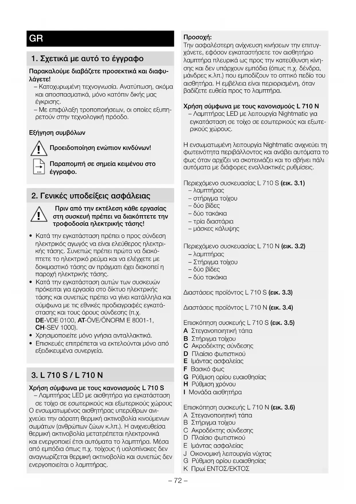 Την ασφαλέστερη ανίχνευση κινήσεων την επιτυγ- χάνετε, εφόσον εγκαταστήσετε τον αισθητήριο λαμπτήρα πλευρικά ως προς την κατεύθυνση κίνη- σης και δεν υπάρχουν εμπόδια (όπως π.χ. δένδρα, μάνδρες κ.λπ.) που εμποδίζουν το οπτικό πεδίο του αισθητήρα. Η εμβέλεια είναι περιορισμένη, όταν βαδίζετε ευθεία προς το λαμπτήρα. Χρήση σύμφωνα με τους κανονισμούς L 710 N – Λαμπτήρας LED με λειτουργία Nightmatic για εγκατάσταση σε τοίχο σε εσωτερικούς και εξωτε- ρικούς χώρους. Η ενσωματωμένη λειτουργία Nightmatic ανιχνεύει τη φωτεινότητα περιβάλλοντος και ανάβει αυτόματα το φως όταν αρχίζει να σκοτεινιάζει και το σβήνει πάλι αυτόματα με διάφορες εναλλακτικές ρυθμίσεις. Περιεχόμενο συσκευασίας L 710 S (εικ.3.1) – λαμπτήρας – στήριγμα τοίχου – δύο βίδες – δύο τακάκια – τρία διαστάρια – μάσκες κάλυψης Περιεχόμενο συσκευασίας L 710 N (εικ.3.2) – λαμπτήρας – Στήριγμα τοίχου – δύο βίδες – δύο τακάκια Διαστάσεις προϊόντος L 710 S (εικ.3.3) Διαστάσεις προϊόντος L 710 N (εικ.3.4) Επισκόπηση συσκευής L 710 S (εικ.3.5) A Στεγανοποιητική τάπα B Στήριγμα τοίχου C Ακροδέκτης σύνδεσης D Πλαίσιο φωτιστικού E Ιμάντας ασφαλείας F Βασικό φως G Ρύθμιση ορίου ευαισθησίας H Ρύθμιση χρόνου I Μονάδα αισθητήρα Επισκόπηση συσκευής L 710 N (εικ.3.6) A Στεγανοποιητική τάπα B Στήριγμα τοίχου C Ακροδέκτης σύνδεσης D Πλαίσιο φωτιστικού E Ιμάντας ασφαλείας J Οικονομική λειτουργία νύχτας G Ρύθμιση ορίου ευαισθησίας Κ Πρωί ΕΝΤΟΣ/ΕΚΤΟΣ– 73 – Όρια ανίχνευσης L 710 S (εικ.3.7/ 3.8/3.9) Κατανομή φωτεινής έντασης (εικ.3.10)