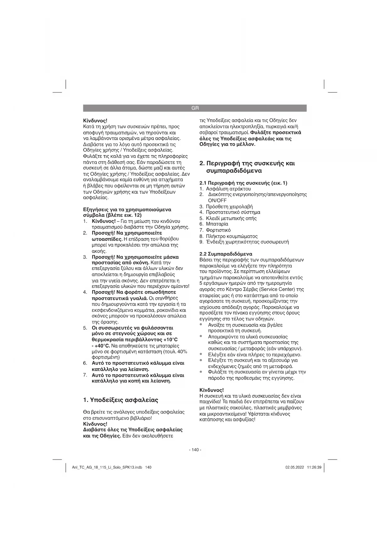 H συσκευή και τα υλικά συσκευασίας δεν είναι παιχνίδια! Τα παιδιά δεν επιτρέπεται να παίζουν με πλαστικές σακούλες, πλαστικές μεμβράνες και μικροαντικείμενα! Υφίσταται κίνδυνος κατάποσης και ασφυξίας! Anl_TC_AG_18_115_Li_Solo_SPK13.indb 140Anl_TC_AG_18_115_Li_Solo_SPK13.indb 140 02.05.2022 11:26:3902.05.2022 11:26:39GR
