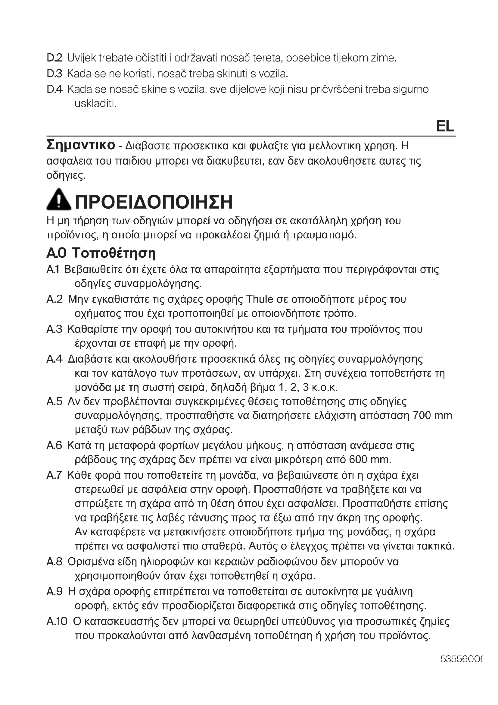 ΠΡΟΕΙΔΟΠΟΙΗΣΗ Η μη τήρηση των οδηγιών μπορεί να οδηγήσει σε ακατάλληλη χρήση του προϊόντος, η οποία μπορεί να προκαλέσει ζημιά ή τραυματισμό. A.0 Τοποθέτηση A.1 Βεβαιωθείτε ότι έχετε όλα τα απαραίτητα εξαρτήματα που περιγράφονται στις οδηγίες συναρμολόγησης. A.2 Μην εγκαθιστάτε τις σχάρες οροφής Thule σε οποιοδήποτε μέρος του οχήματος που έχει τροποποιηθεί με οποιονδήποτε τρόπο. A.3 Καθαρίστε την οροφή του αυτοκινήτου και τα τμήματα του προϊόντος που έρχονται σε επαφή με την οροφή. A.4 Διαβάστε και ακολουθήστε προσεκτικά όλες τις οδηγίες συναρμολόγησης και τον κατάλογο των προτάσεων, αν υπάρχει. Στη συνέχεια τοποθετήστε τη μονάδα με τη σωστή σειρά, δηλαδή βήμα 1, 2, 3 κ.ο.κ. A.5 Αν δεν προβλέπονται συγκεκριμένες θέσεις τοποθέτησης στις οδηγίες συναρμολόγησης, προσπαθήστε να διατηρήσετε ελάχιστη απόσταση 700 mm μεταξύ των ράβδων της σχάρας. A.6 Κατά τη μεταφορά φορτίων μεγάλου μήκους, η απόσταση ανάμεσα στις ράβδους της σχάρας δεν πρέπει να είναι μικρότερη από 600 mm. A.7 Κάθε φορά που τοποθετείτε τη μονάδα, να βεβαιώνεστε ότι η σχάρα έχει στερεωθεί με ασφάλεια στην οροφή. Προσπαθήστε να τραβήξετε και να σπρώξετε τη σχάρα από τη θέση όπου έχει ασφαλίσει. Προσπαθήστε επίσης να τραβήξετε τις λαβές τάνυσης προς τα έξω από την άκρη της οροφής. Αν καταφέρετε να μετακινήσετε οποιοδήποτε τμήμα της μονάδας, η σχάρα πρέπει να ασφαλιστεί πιο σταθερά. Αυτός ο έλεγχος πρέπει να γίνεται τακτικά. A.8 Ορισμένα είδη ηλιοροφών και κεραιών ραδιοφώνου δεν μπορούν να χρησιμοποιηθούν όταν έχει τοποθετηθεί η σχάρα. A.9 Η σχάρα οροφής επιτρέπεται να τοποθετείται σε αυτοκίνητα με γυάλινη οροφή, εκτός εάν προσδιορίζεται διαφορετικά στις οδηγίες τοποθέτησης. A.10 Ο κατασκευαστής δεν μπορεί να θεωρηθεί υπεύθυνος για προσωπικές ζημίες που προκαλούνται από λανθασμένη τοποθέτηση ή χρήση του προϊόντος.54 5560060001 A.11 Απαγορεύεται η τροποποίηση του προϊόντος κατ’ οποιονδήποτε τρόπο. A.12 Επικοινωνήστε με τον αντιπρόσωπο, εάν έχετε απορίες σχετικά με τη λειτουργία και τους περιορισμούς των προϊόντων. Διαβάστε όλες τις οδηγίες και τις πληροφορίες εγγύησης προσεκτικά. A.13 Να λαμβάνετε υπόψη τους νόμους και τους κανονισμούς της χώρας όπου έχετε την πρόθεση να χρησιμοποιήσετε το προϊόν A.14 Να φροντίζετε πάντα ώστε οι μπάρες οροφής ή άλλα αξεσουάρ που στερεώνονται στην οροφή να μην εμποδίζουν τη λειτουργία οποιασδήποτε ανοιγόμενης ηλιοροφής/πανοραμικής οροφής/γυάλινης οροφής του αυτοκινήτου. B.0 Φόρτωση B.1 Δεν πρέπει να υπερβαίνετε το μέγιστο επιτρεπόμενο φορτίο που προδιαγράφεται στις οδηγίες συναρμολόγησης. Ωστόσο, αυτό το όριο είναι πάντα χαμηλότερο από το μέγιστο φορτίο που προτείνει ο κατασκευαστής του αυτοκινήτου. Αυτό που ισχύει πάντα είναι το μικρότερο μέγιστο φορτίο. Μεγ. φορτίο οροφής = βάρος σχάρας + βάρος εξαρτημάτων που έχουν πιθανώς τοποθετηθεί στη σχάρα + βάρος φορτίου. B.2 Το φορτίο δεν επιτρέπεται να υπερβαίνει σημαντικά το πλάτος της σχάρας και πρέπει να κατανέμεται πάντα ομοιόμορφα σε ολόκληρη την επιφάνεια της σχάρας με το κέντρο βάρους όσο το δυνατό χαμηλότερα. B.3 Οταν μεταφέρετε περισσότερες από μια σανίδες σέρφινγκ, δεν πρέπει να τις τοποθετείτε τη μια δίπλα στην άλλη αλλά τη μια πάνω στην άλλη. B.4 Οταν μεταφέρετε σανίδες σέρφινγκ και άλλα αντικείμενα μεγάλου μήκους, πρέπει να τα στερεώνετε τόσο στο μπροστινό όσο και στο πίσω μέρος του αυτοκινήτου. B.5 Τα χιονοπέδιλα π