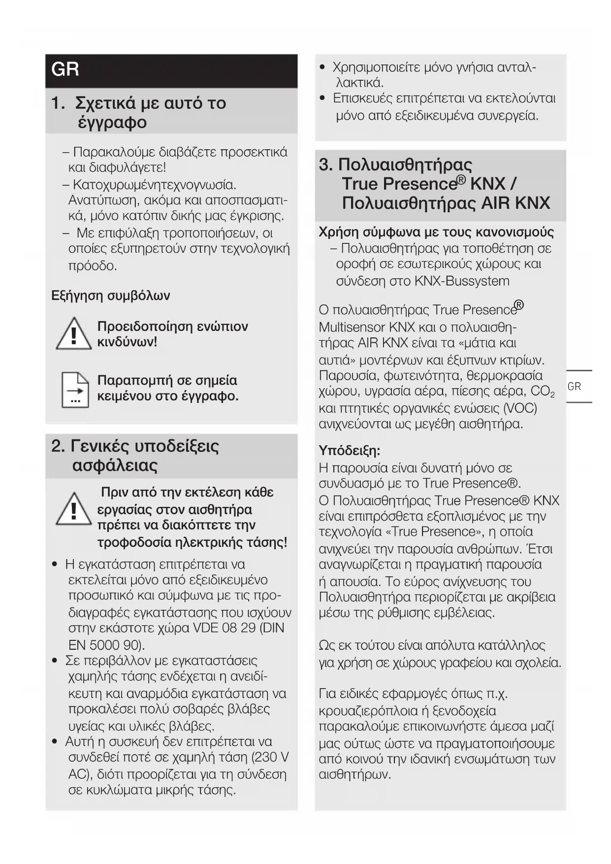 Η παρουσία είναι δυνατή μόνο σε συνδυασμό με το True Presence®. Ο Πολυαισθητήρας True Presence® KNX είναι επιπρόσθετα εξοπλισμένος με την τεχνολογία «TruePresence», η οποία ανιχνεύει την παρουσία ανθρώπων. Έτσι αναγνωρίζεται η πραγματική παρουσία ή απουσία. Το εύρος ανίχνευσης του Πολυαισθητήρα περιορίζεται με ακρίβεια μέσω της ρύθμισης εμβέλειας. Ως εκ τούτου είναι απόλυτα κατάλληλος για χρήση σε χώρους γραφείου και σχολεία. Για ειδικές εφαρμογές όπως π.χ. κρουαζιερόπλοια ή ξενοδοχεία παρακαλούμε επικοινωνήστε άμεσα μαζί μας ούτως ώστε να πραγματοποιήσουμε από κοινού την ιδανική ενσωμάτωση των αισθητήρων. GR– 80 –