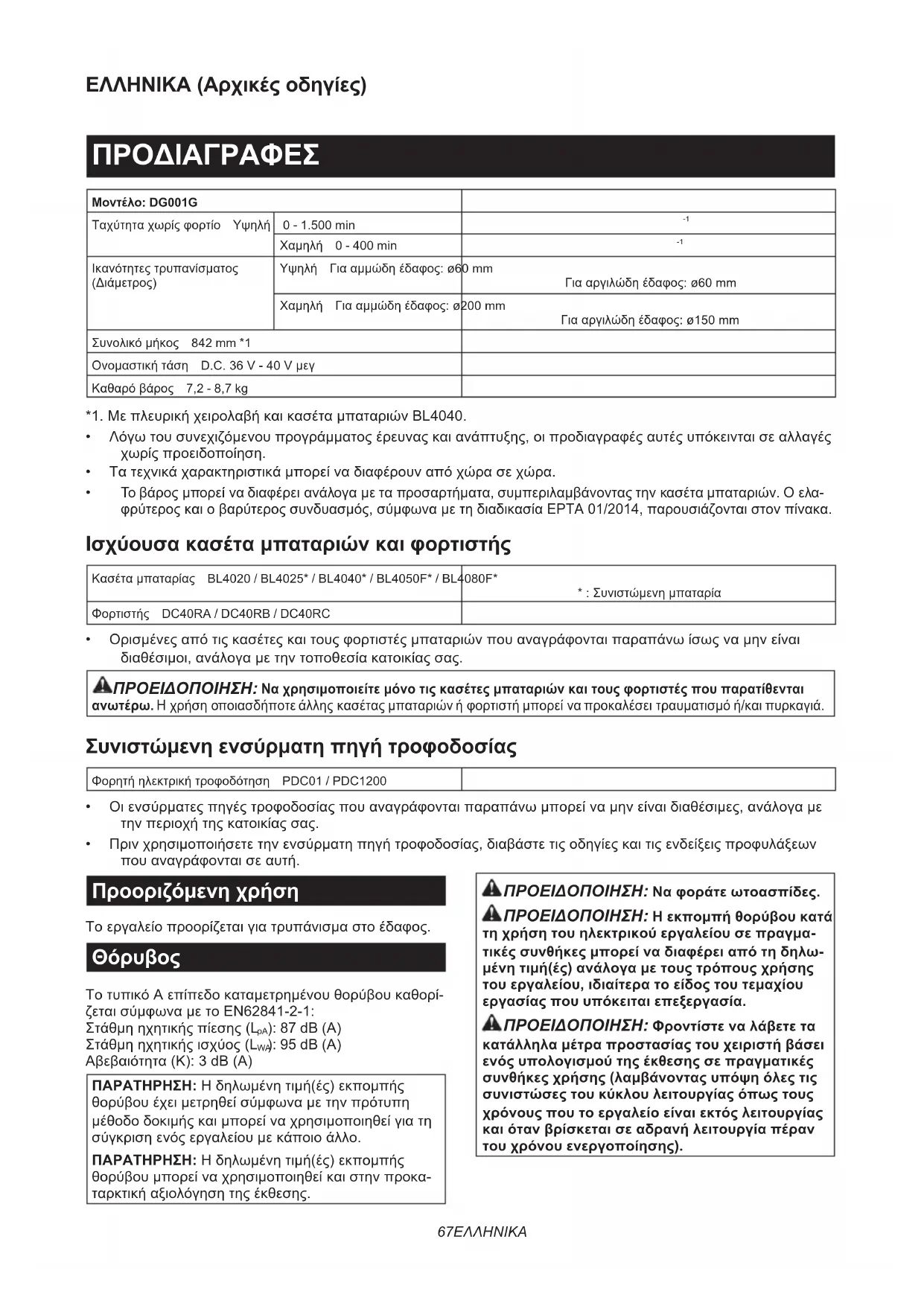 Ικανότητεςτρυπανίσματος (Διάμετρος) Υψηλή Γιααμμώδηέδαφος:ø60mm Γιααργιλώδηέδαφος:ø60mm Χαμηλή Γιααμμώδηέδαφος:ø200mm Γιααργιλώδηέδαφος:ø150mm Συνολικόμήκος 842 mm *1 Ονομαστικήτάση D.C.36V-40Vμεγ Καθαρόβάρος 7,2 - 8,7 kg *1.ΜεπλευρικήχειρολαβήκαικασέταμπαταριώνBL4040.