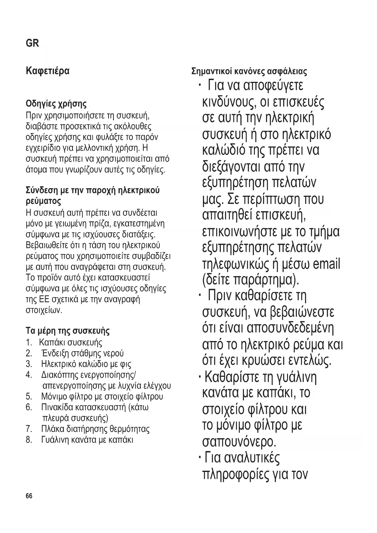 Σημαντικοί κανόνες ασφάλειας ∙ Γιανααποφεύγετε κινδύνους,οιεπισκευές σεαυτήτηνηλεκτρική συσκευήήστοηλεκτρικό καλώδιότηςπρέπεινα διεξάγονταιαπότην εξυπηρέτησηπελατών μας.Σεπερίπτωσηπου απαιτηθείεπισκευή, επικοινωνήστεμετοτμήμα εξυπηρέτησηςπελατών τηλεφωνικώςήμέσωemail (δείτεπαράρτημα). ∙ Πρινκαθαρίσετετη συσκευή,ναβεβαιώνεστε ότιείναιαποσυνδεδεμένη απότοηλεκτρικόρεύμακαι ότιέχεικρυώσειεντελώς. ∙ Καθαρίστετηγυάλινη κανάταμεκαπάκι,το στοιχείοφίλτρουκαι τομόνιμοφίλτρομε σαπουνόνερο. ∙ Γιααναλυτικές πληροφορίεςγιατον GR104 x 142 mm