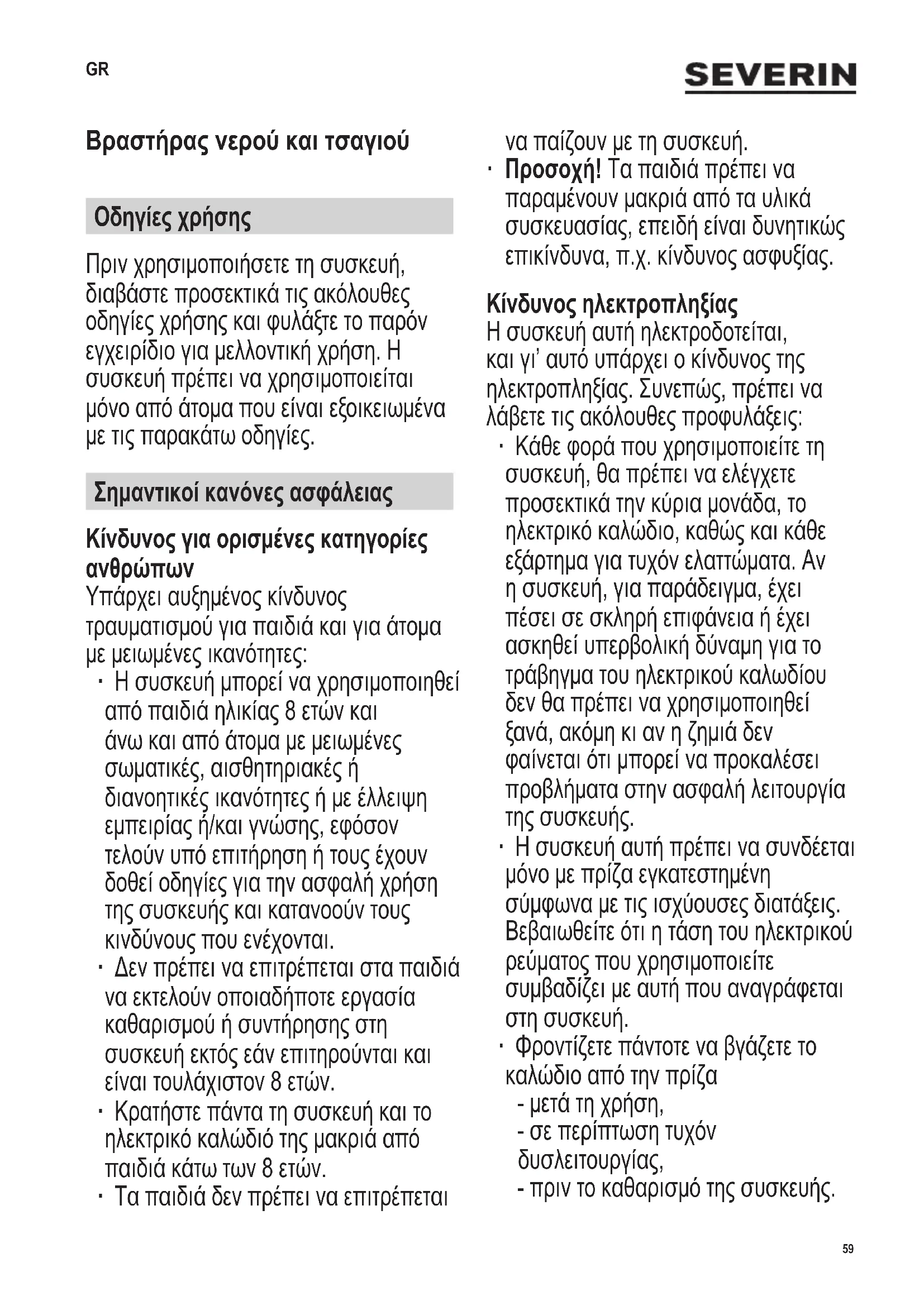 Υπάρχει αυξημένος κίνδυνος τραυματισμού για παιδιά και για άτομα με μειωμένες ικανότητες: ∙ Η συσκευή μπορεί να χρησιμοποιηθεί από παιδιά ηλικίας 8 ετών και άνω και από άτομα με μειωμένες σωματικές, αισθητηριακές ή διανοητικές ικανότητες ή με έλλειψη εμπειρίας ή/και γνώσης, εφόσον τελούν υπό επιτήρηση ή τους έχουν δοθεί οδηγίες για την ασφαλή χρήση της συσκευής και κατανοούν τους κινδύνους που ενέχονται. ∙ Δεν πρέπει να επιτρέπεται στα παιδιά να εκτελούν οποιαδήποτε εργασία καθαρισμού ή συντήρησης στη συσκευή εκτός εάν επιτηρούνται και είναι τουλάχιστον 8 ετών. ∙ Κρατήστε πάντα τη συσκευή και το ηλεκτρικό καλώδιό της μακριά από παιδιά κάτω των 8 ετών. ∙ Τα παιδιά δεν πρέπει να επιτρέπεται να παίζουν με τη συσκευή. ∙ Προσοχή! Τα παιδιά πρέπει να παραμένουν μακριά από τα υλικά συσκευασίας, επειδή είναι δυνητικώς επικίνδυνα, π.χ. κίνδυνος ασφυξίας. Κίνδυνος ηλεκτροπληξίας Η συσκευή αυτή ηλεκτροδοτείται, και γι’ αυτό υπάρχει ο κίνδυνος της ηλεκτροπληξίας. Συνεπώς, πρέπει να λάβετε τις ακόλουθες προφυλάξεις: ∙ Κάθε φορά που χρησιμοποιείτε τη συσκευή, θα πρέπει να ελέγχετε προσεκτικά την κύρια μονάδα, το ηλεκτρικό καλώδιο, καθώς και κάθε εξάρτημα για τυχόν ελαττώματα. Αν η συσκευή, για παράδειγμα, έχει πέσει σε σκληρή επιφάνεια ή έχει ασκηθεί υπερβολική δύναμη για το τράβηγμα του ηλεκτρικού καλωδίου δεν θα πρέπει να χρησιμοποιηθεί ξανά, ακόμη κι αν η ζημιά δεν φαίνεται ότι μπορεί να προκαλέσει προβλήματα στην ασφαλή λειτουργία της συσκευής. ∙ Η συσκευή αυτή πρέπει να συνδέεται μόνο με πρίζα εγκατεστημένη σύμφωνα με τις ισχύουσες διατάξεις. Βεβαιωθείτε ότι η τάση του ηλεκτρικού ρεύματος που χρησιμοποιείτε συμβαδίζει με αυτή που αναγράφεται στη συσκευή. ∙ Φροντίζετε πάντοτε να βγάζετε το καλώδιο από την πρίζα - μετά τη χρήση, - σε περίπτωση τυχόν δυσλειτουργίας, - πριν το καθαρισμό της συσκευής. GR60 142 x 208 mm ∙ Όταν βγάζετε το φις από την πρίζα, ποτέ μην τραβάτε το ηλεκτρικό