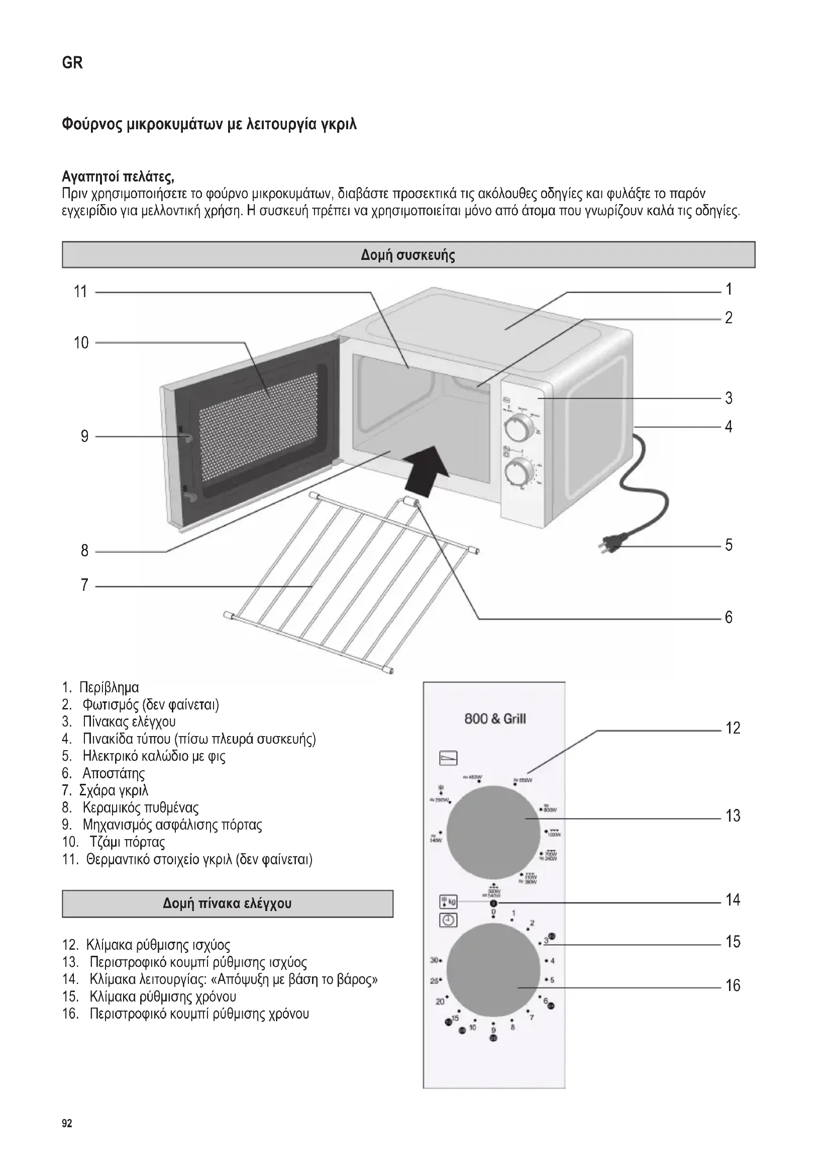 ∙ Όταν ζεσταίνετε ή μαγειρεύετε φαγητό που περιέχεται σε εύφλεκτα υλικά ή είναι τυλιγμένο με εύφλεκτα υλικά, όπως πλαστικό ή χαρτί, υφίσταται κίνδυνος ανάφλεξης. Είναι επίσης πιθανό να ξηραθεί ή και να δημιουργηθεί ανάφλεξη αν επιλεγεί χρόνος μαγειρέματος μεγαλύτερος από τον απαιτούμενο. Εύφλεκτες ουσίες είναι επίσης τα λίπη ή έλαια. Για το λόγο αυτό έχει σημασία να παρακολουθείτε τη συσκευή όταν λειτουργεί. Εξαιρετικά εύφλεκτα υγρά, όπως το συμπυκνωμένο οινόπνευμα, ασφαλώς δεν πρέπει να θερμαίνονται. ∙ Αν παρατηρήσετε καπνό κατά τη λειτουργία της συσκευής, κρατήστε την πόρτα κλειστή για να σταματήσει ή να πνίξει τις φλόγες. Κλείστε αμέσως το διακόπτη της συσκευής και βγάλτε το καλώδιο από την πρίζα. ∙ Χρησιμοποιείτε κατάλληλες πιάστρες κατά την αφαίρεση των τροφίμων από το θάλαμο ψησίματος. Τα σκεύη δεν θερμαίνονται μόνο στη λειτουργία γκριλ, αλλά και στη λειτουργία μικροκυμάτων, επειδή τα θερμά τρόφιμα μεταδίδουν τη θερμότητα και στα σκεύη. ∙ Τα ειδικά θερμόμετρα φαγητού (αυτά που χρησιμοποιούνται στους συμβατικούς φούρνους ψησίματος) δεν είναι κατάλληλα για χρήση στους φούρνους μικροκυμάτων. Πριν χρησιμοποιήσετε τη συσκευή για πρώτη φορά ∙ Αφού βγάλετε τη συσκευή από τη συσκευασία, αλλά και κάθε φορά πριν τη συνδέετε με την παροχή ρεύματος, ελέγχετε και τη συσκευή και το καλώδιο προσεκτικά για τυχόν ίχνη φθοράς. ∙ Προσοχή! Βεβαιωθείτε ότι η πόρτα (μαζί με το παράθυρο φούρνου, τις σφραγίσεις πόρτας και το κλείδωμα) δεν παρουσιάζουν καμία βλάβη, δεν γέρνουν και κλείνουν εφαρμόζοντας σταθερά και ερμητικά στο πλαίσιο της πόρτας. Είναι σημαντικό να διασφαλίζετε ότι δεν εκπέμπεται ενέργεια μικροκυμάτων κατά τη λειτουργία της συσκευής. Για τον ίδιο λόγο, πρέπει να ελέγχετε προσεκτικά όλο το εξωτερικό περίβλημα αλλά και το εσωτερικό του φούρνου. Σε περίπτωση βλάβης, δεν πρέπει να χρησιμοποιήσετε τη συσκευή έως ότου επισκευαστεί από ειδικευμένο τεχνικό. ∙ Αφαιρέστε κάθε εξωτερικό και εσωτερικό υλικό συσκευασίας. Δεν επιτρέπεται να αφαιρέσετε την πινακίδα του κατασκευαστή. Όλα αυτά τα υλικά είναι κατάλληλα για ανακύκλωση. ∙ Μην αφαιρείτε τα ελαστικά παρεμβύσματα της σχάρας γκριλ! Τοποθετήστε τη σχάρα γκριλ με τέτοιον τρόπο, ώστε ο στρογγυλός αποστάτης με τα ελαστικά παρεμβύσματα να έχει κατεύθυνση προς την πίσω πλευρά του εσωτερικού μέρους της συσκευής. ∙ Προσοχή! Τα παιδιά πρέπει να παραμένουν μακριά από τα υλικά συσκευασίας, επειδή είναι δυνητικώς επικίνδυνα, π.χ. κίνδυνος ασφυξίας.97 142 x 208 mm ∙ Πριν χρησιμοποιήσετε τη συσκευή για πρώτη φορά, ή μετά από μεγάλο χρονικό διάστημα, πρέπει να καθαριστεί πάρα πολύ καλά, σύμφωνα με τις οδηγίες στο τμήμα «Καθαρισμός». ∙ Σημείωση: Μην ανάβετε τη μονάδα εκτός αν το φαγητό που θα ζεστάνετε ή θα μαγειρέψετε έχει τοποθετηθεί μέσα στο φούρνο. Αν η συσκευή λειτουργήσει άδεια, θα προκληθεί βλάβη στη μονάδα. ∙ Κατά την πρώτη θέση σε λειτουργία θερμάνετε τη συσκευή στη λειτουργία γκριλ (χωρίς μικροκύματα!) για 10 λεπτά. Ενδέχεται να προκύψει ελαφρά οσμή, γι’ αυτό θα πρέπει να διασφαλίσετε επαρκή αερισμό ανοίγοντας τα παράθυρα ή τις μπαλκονόπορτες. Συσκευή ISM Αυτό το προϊόν είναι μια συσκευή ISM ομάδας 2, κατηγορίας B. Η ομάδα 2 περιλαμβάνει όλες τις συσκευές ISM (βιομηχανικές, επιστημονικές, ιατρικές) οι οποίες παράγουν ενέργεια ραδιοσυχνοτήτων ή/και τη χρησιμοποιούν με τη μορφή ηλεκτρομαγνητικ