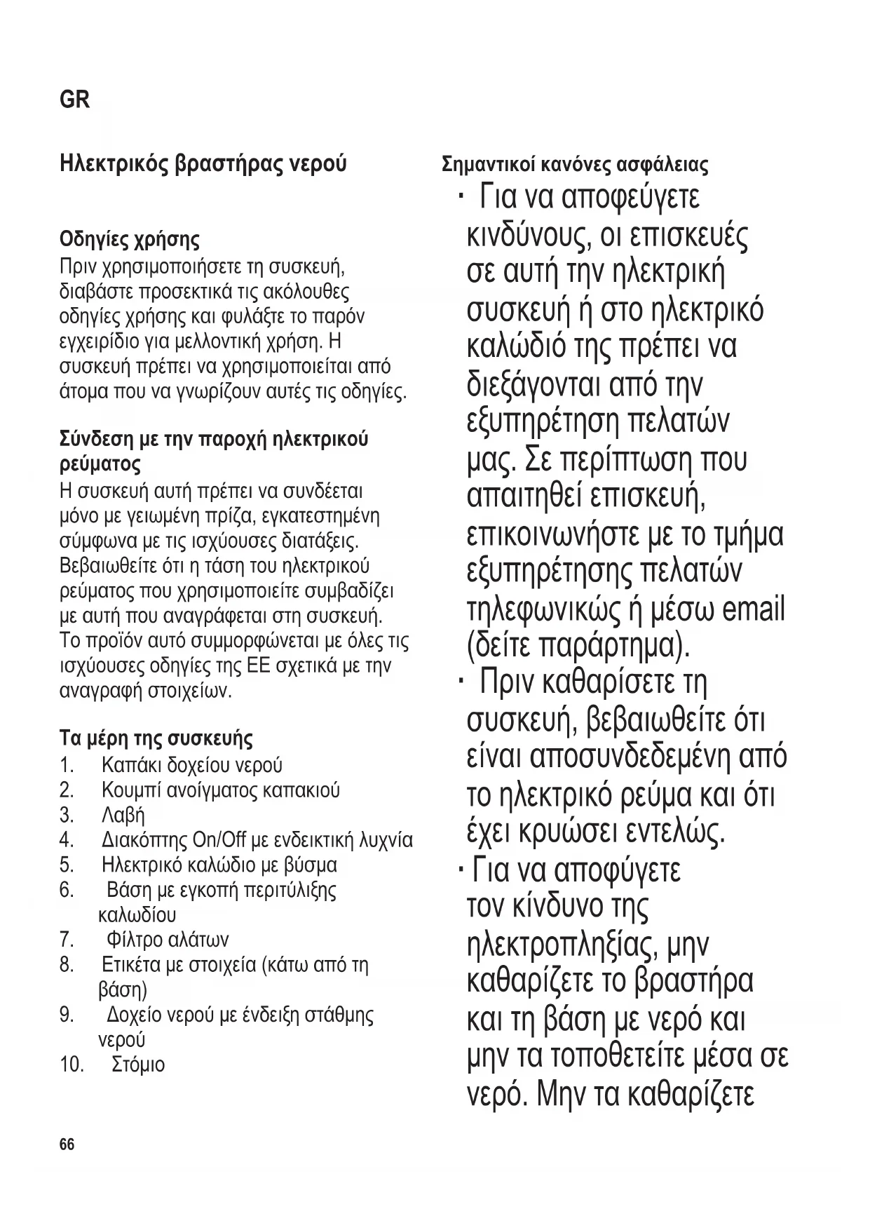Σημαντικοί κανόνες ασφάλειας ∙ Γιανααποφεύγετε κινδύνους,οιεπισκευές σεαυτήτηνηλεκτρική συσκευήήστοηλεκτρικό καλώδιότηςπρέπεινα διεξάγονταιαπότην εξυπηρέτησηπελατών μας.Σεπερίπτωσηπου απαιτηθείεπισκευή, επικοινωνήστεμετοτμήμα εξυπηρέτησηςπελατών τηλεφωνικώςήμέσωemail (δείτεπαράρτημα). ∙ Πρινκαθαρίσετετη συσκευή,βεβαιωθείτεότι είναιαποσυνδεδεμένηαπό τοηλεκτρικόρεύμακαιότι έχεικρυώσειεντελώς. ∙ Γιανααποφύγετε τονκίνδυνοτης ηλεκτροπληξίας,μην καθαρίζετετοβραστήρα καιτηβάσημενερόκαι μηντατοποθετείτεμέσασε νερό.Μηντακαθαρίζετε GR104 x 142 mm