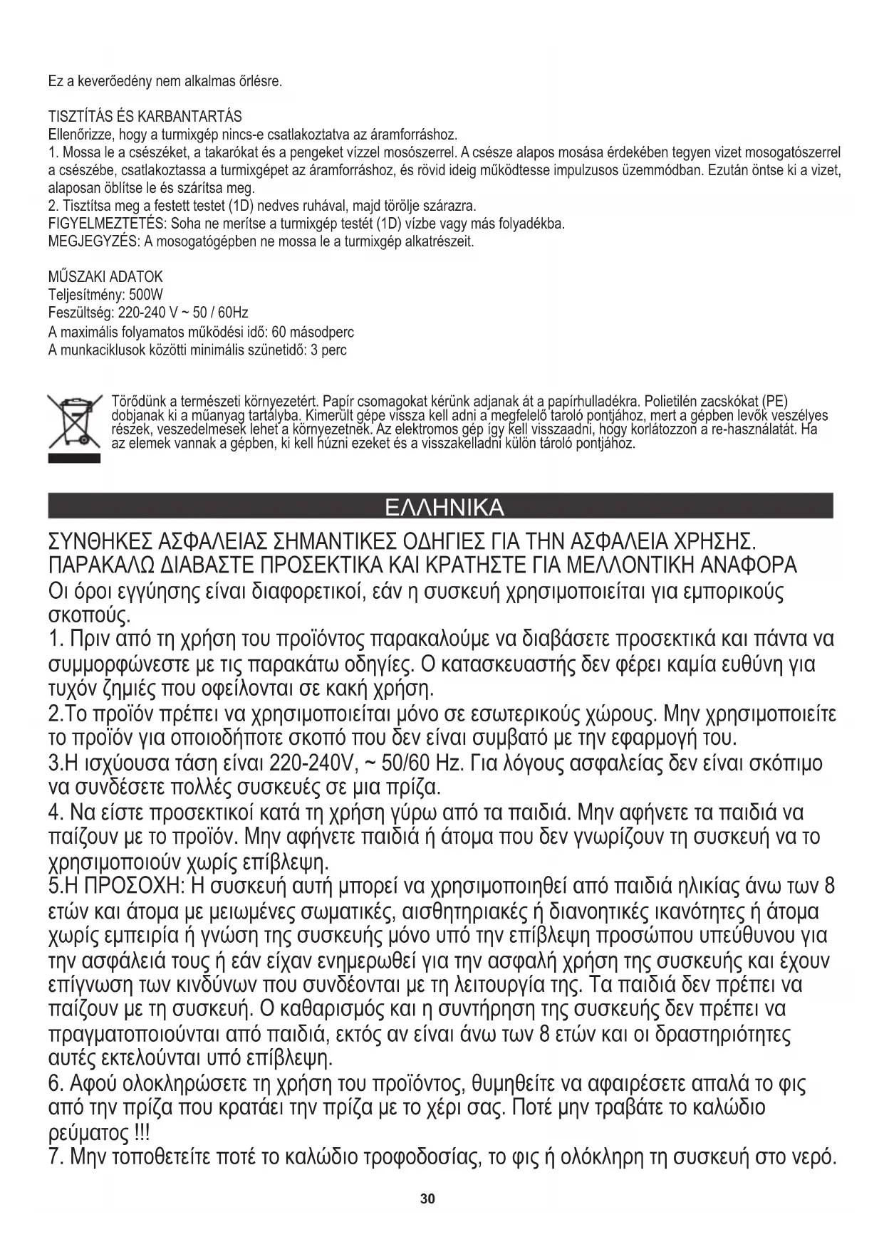 περιστρέφοντας το κουμπί ρύθμισης της ταχύτητας (1E) στη θέση εκτός λειτουργίας (2B). Περιμένετε έως ότου σταματήσουν οι λεπίδες. Αφαιρέστε το φις από την πρίζα. Αφαιρέστε το κύπελλο. φροντίζουμε το φυσικό περιβάλλον. Παρακαλούμε να πετάτε τις συσκευασίες από χαρτόνι στον κάδο ανακύκλωσης απορριμμάτων χαρτιού. Τις σακούλες από πολυαιθυλένιο (ΡΕ), απορρίψτε τις στον κάδο ανακύκλωσης πλαστικών. Η φθαρμένη συσκευή πρέπει να απορρίπτεται στο κατάλληλο σημείο, εξαιτίας των επικίνδυνων στοιχείων που περιέχει και τα οποία μπορεί να αποτελέσουν απειλή για το περιβάλλον. Η ηλεκτρική συσκευή πρέπει να απορρίπτεται με τέτοιο τρόπο ώστε να περιοριστεί η επαναχρησιμοποίηση της. Εάν στη συσκευή βρίσκονται μπαταρίες, αυτές πρέπει να αφαιρεθούν και να πεταχτούν σε ξεχωριστό κάδο.33