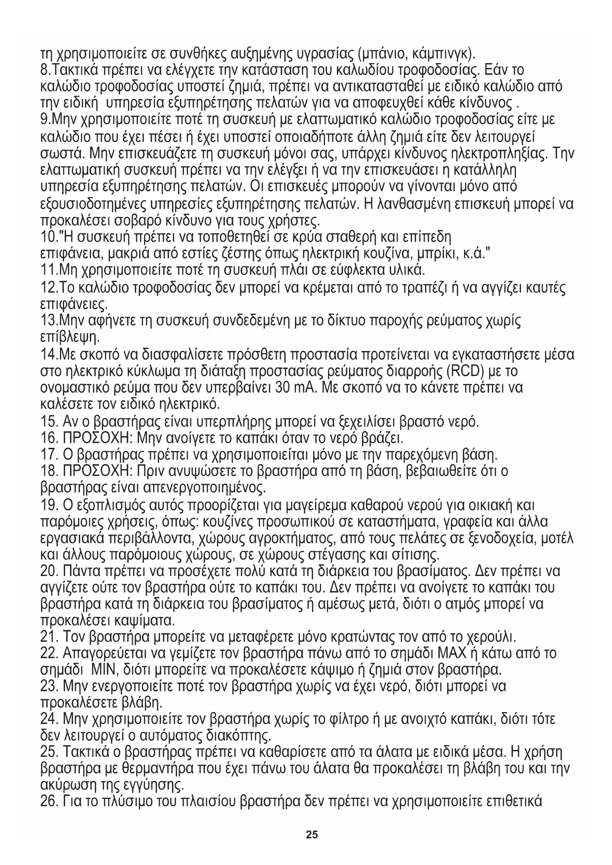 1.Πριν από τη χρήση της συσκευής πρέπει να διαβάσετε τις οδηγίες χρήσεως και να τις ακολουθήσετε. Ο παραγωγός δεν ευθύνεται για ενδεχόμενες ζημιές που οφείλονται σε μη ενδεδειγμένη χρήση ή σε λάθος χειρισμό της συσκευής. 4.Πρέπει να προσέχετε ιδιαιτέρως κατά τη διάρκεια χρήσης της συσκευής όταν δίπλα βρίσκονται παιδιά. Δεν επιτρέπεται τα παιδιά να παίζουν με τη συσκευή. Δεν επιτρέπεται η χρήση της συσκευής από παιδιά ή άτομα που δεν έχουν ενημερωθεί σχετικά με το χειρισμό της. 5.Η συσκευή δεν προορίζεται για χρήση από άτομα (συμπεριλαμβανομένων των παιδιών) με περιορισμένες ικανότητες κινητικές, αισθητικές και νοητικές είτε από άτομα που δεν έχουν εμπειρία ή δεν έχουν ενημερωθεί σχετικά με το χειρισμό της συσκευής, εκτός αν γίνεται αυτό υπό την εποπτεία ατόμου υπεύθυνου για την ασφάλεια τους και σύμφωνα με τις οδηγίες χρήσεως. ΕΛΛΗΝΙΚΑ25 τη χρησιμοποιείτε σε συνθήκες αυξημένης υγρασίας (μπάνιο, κάμπινγκ). 8.Τακτικά πρέπει να ελέγχετε την κατάσταση του καλωδίου τροφοδοσίας. Εάν το καλώδιο τροφοδοσίας υποστεί ζημιά, πρέπει να αντικατασταθεί με ειδικό καλώδιο από την ειδική υπηρεσία εξυπηρέτησης πελατών για να αποφευχθεί κάθε κίνδυνος . 9.Μην χρησιμοποιείτε ποτέ τη συσκευή με ελαττωματικό καλώδιο τροφοδοσίας είτε με καλώδιο που έχει πέσει ή έχει υποστεί οποιαδήποτε άλλη ζημιά είτε δεν λειτουργεί σωστά. Μην επισκευάζετε τη συσκευή μόνοι σας, υπάρχει κίνδυνος ηλεκτροπληξίας. Την ελαττωματική συσκευή πρέπει να την ελέγξει ή να την επισκευάσει η κατάλληλη υπηρεσία εξυπηρέτησης πελατών. Οι επισκευές μπορούν να γίνονται μόνο από εξουσιοδοτημένες υπηρεσίες εξυπηρέτησης πελατών. Η λανθασμένη επισκευή μπορεί να προκαλέσει σοβαρό κίνδυνο για τους χρήστες. 10."Η συσκευή πρέπει να τοποθετηθεί σε κρύα σταθερή και επίπεδη