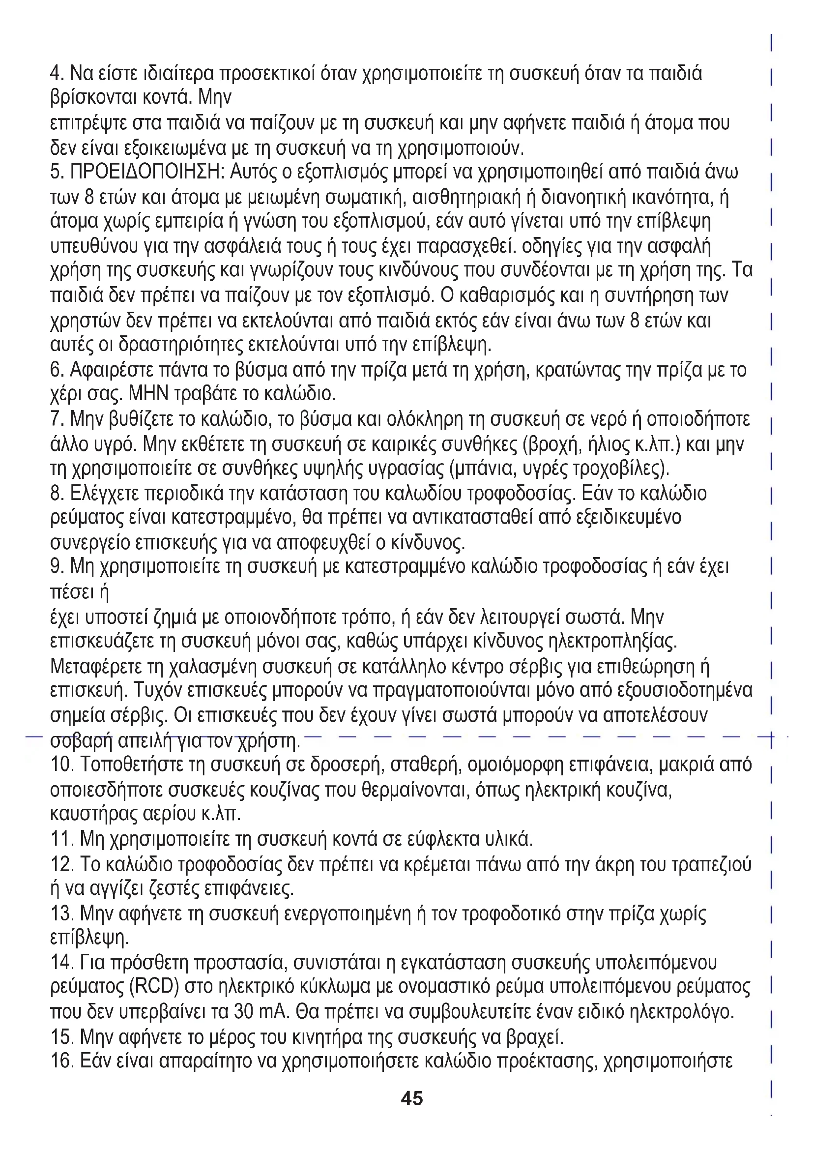 των 8 ετών και άτομα με μειωμένη σωματική, αισθητηριακή ή διανοητική ικανότητα, ή άτομα χωρίς εμπειρία ή γνώση του εξοπλισμού, εάν αυτό γίνεται υπό την επίβλεψη υπευθύνου για την ασφάλειά τους ή τους έχει παρασχεθεί. οδηγίες για την ασφαλή χρήση της συσκευής και γνωρίζουν τους κινδύνους που συνδέονται με τη χρήση της. Τα παιδιά δεν πρέπει να παίζουν με τον εξοπλισμό. Ο καθαρισμός και η συντήρηση των χρηστών δεν πρέπει να εκτελούνται από παιδιά εκτός εάν είναι άνω των 8 ετών και αυτές οι δραστηριότητες εκτελούνται υπό την επίβλεψη.