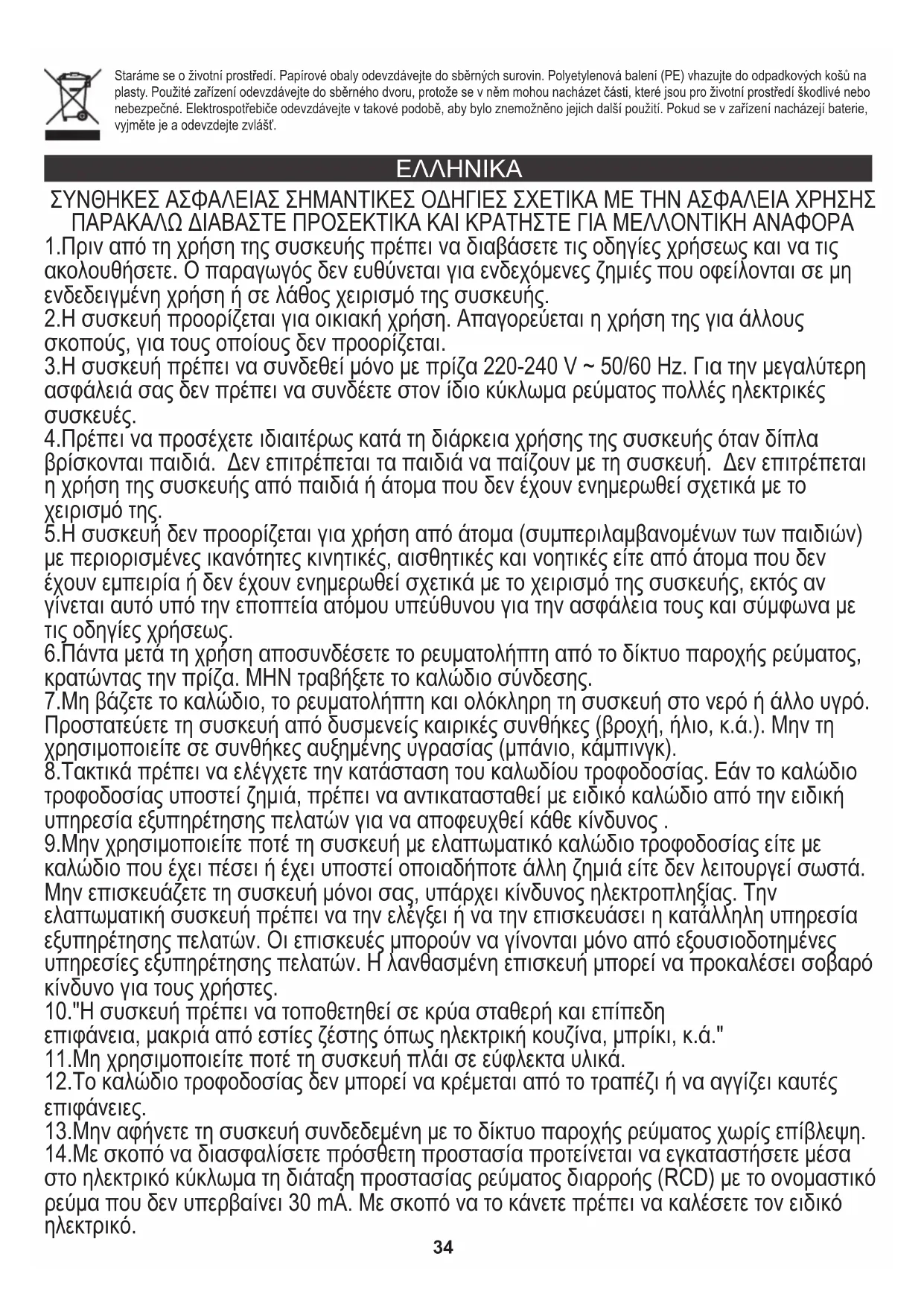 33ΣΥΝΘΗΚΕΣ ΑΣΦΑΛΕΙΑΣ ΣΗΜΑΝΤΙΚΕΣ ΟΔΗΓΙΕΣ ΣΧΕΤΙΚΑ ΜΕ ΤΗΝ ΑΣΦΑΛΕΙΑ ΧΡΗΣΗΣ ΠΑΡΑΚΑΛΩ ΔΙΑΒΑΣΤΕ ΠΡΟΣΕΚΤΙΚΑ ΚΑΙ ΚΡΑΤΗΣΤΕ ΓΙΑ ΜΕΛΛΟΝΤΙΚΗ ΑΝΑΦΟΡΑ 4.Πρέπει να προσέχετε ιδιαιτέρως κατά τη διάρκεια χρήσης της συσκευής όταν δίπλα βρίσκονται παιδιά. Δεν επιτρέπεται τα παιδιά να παίζουν με τη συσκευή. Δεν επιτρέπεται η χρήση της συσκευής από παιδιά ή άτομα που δεν έχουν ενημερωθεί σχετικά με το χειρισμό της. 14.Με σκοπό να διασφαλίσετε πρόσθετη προστασία προτείνεται να εγκαταστήσετε μέσα στο ηλεκτρικό κύκλωμα τη διάταξη προστασίας ρεύματος διαρροής (RCD) με το ονομαστικό ρεύμα που δεν υπερβαίνει 30 mA. Με σκοπό να το κάνετε πρέπει να καλέσετε τον ειδικό