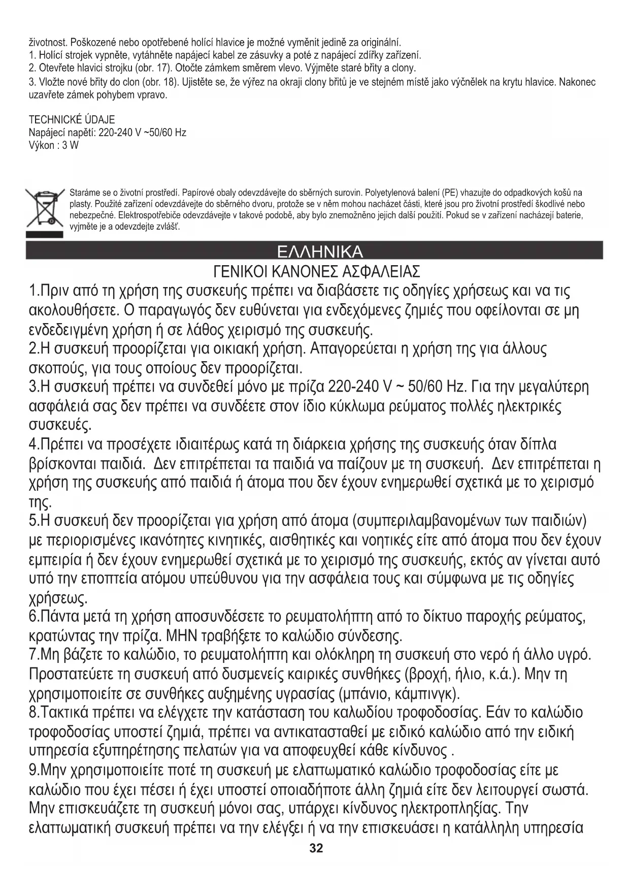 Staráme se o životní prostředí. Papírové obaly odevzdávejte do sběrných surovin. Polyetylenová balení (PE) vhazujte do odpadkových košů na plasty. Použité zařízení odevzdávejte do sběrného dvoru, protože se v něm mohou nacházet části, které jsou pro životní prostředí škodlivé nebo nebezpečné. Elektrospotřebiče odevzdávejte v takové podobě, aby bylo znemožněno jejich další použití. Pokud se v zařízení nacházejí baterie, vyjměte je a odevzdejte zvlášť. 1.Πριν από τη χρήση της συσκευής πρέπει να διαβάσετε τις οδηγίες χρήσεως και να τις ακολουθήσετε. Ο παραγωγός δεν ευθύνεται για ενδεχόμενες ζημιές που οφείλονται σε μη ενδεδειγμένη χρήση ή σε λάθος χειρισμό της συσκευής. 2.Η συσκευή προορίζεται για οικιακή χρήση. Απαγορεύεται η χρήση της για άλλους σκοπούς, για τους οποίους δεν προορίζεται. ΓΕΝΙΚΟΙ ΚΑΝΟΝΕΣ ΑΣΦΑΛΕΙΑΣ 3.Η συσκευή πρέπει να συνδεθεί μόνο με πρίζα 220-240 V ~ 50/60 Hz. Για την μεγαλύτερη ασφάλειά σας δεν πρέπει να συνδέετε στον ίδιο κύκλωμα ρεύματος πολλές ηλεκτρικές
