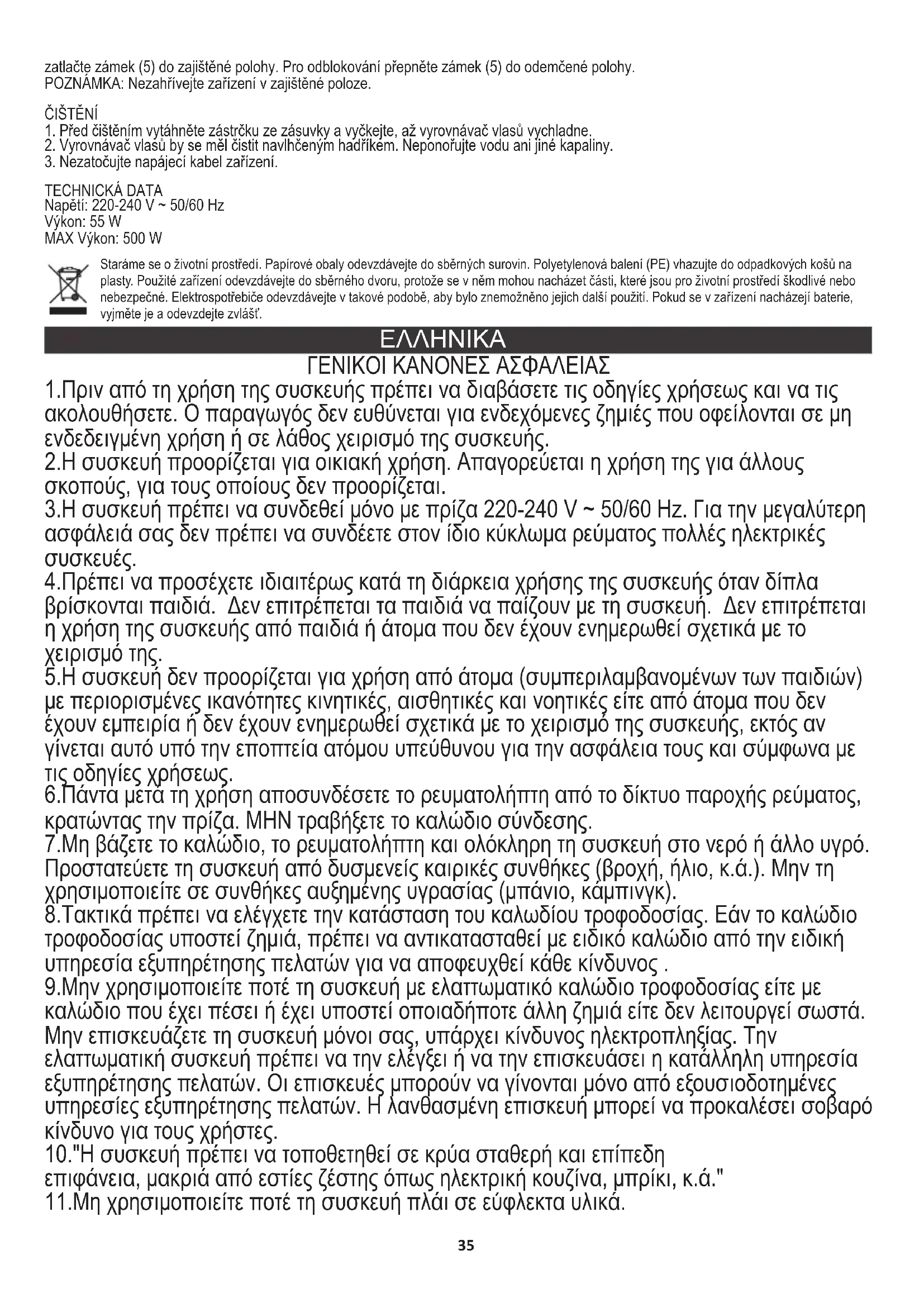 ΑΥΤΟΜΑΤΗ ΑΣΦΑΛΕΙΑ ΚΛΕΙΣΤΑ ΜΕΣΟ ΚΛΕΙΔΩΜΑ Αυτή η συσκευή διαθέτει διακόπτη κλειδώματος κλειδώματος (5) για ευκολότερη αποθήκευση. Για να κλειδώσετε το ίσιωμα των μαλλιών, απλώς πιέστε τις λαβές (3) μαζί και πιέστε την ασφάλεια (5) στην κλειδωμένη θέση. Για ξεκλείδωμα, αλλάξτε το κλείδωμα (5) στη θέση ξεκλειδώματος. Τάση: 220-240V ~ 50 / 60Hz Ισχύς: 55W