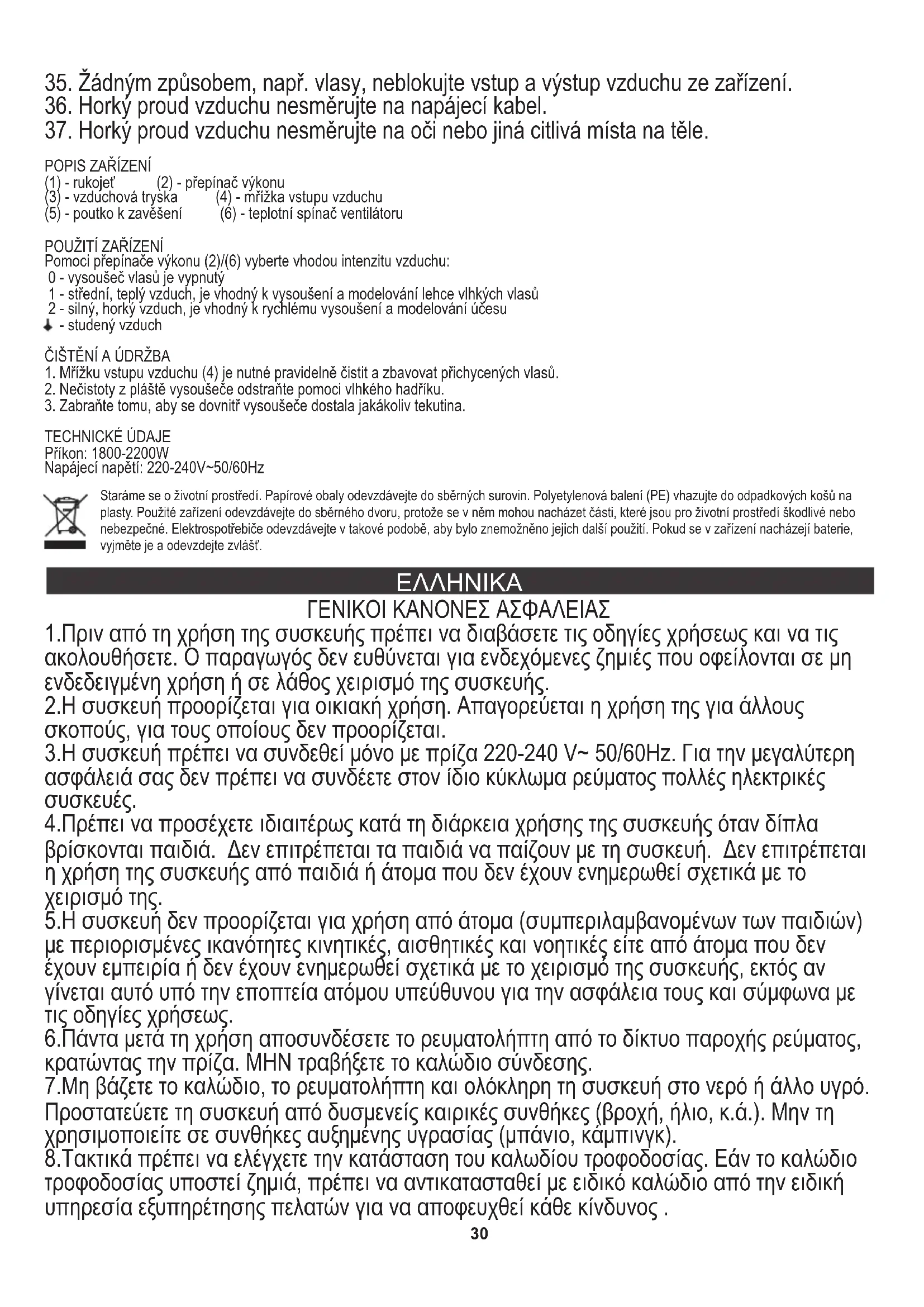 1.Πριν από τη χρήση της συσκευής πρέπει να διαβάσετε τις οδηγίες χρήσεως και να τις ακολουθήσετε. Ο παραγωγός δεν ευθύνεται για ενδεχόμενες ζημιές που οφείλονται σε μη ενδεδειγμένη χρήση ή σε λάθος χειρισμό της συσκευής. 4.Πρέπει να προσέχετε ιδιαιτέρως κατά τη διάρκεια χρήσης της συσκευής όταν δίπλα βρίσκονται παιδιά. Δεν επιτρέπεται τα παιδιά να παίζουν με τη συσκευή. Δεν επιτρέπεται η χρήση της συσκευής από παιδιά ή άτομα που δεν έχουν ενημερωθεί σχετικά με το χειρισμό της. 5.Η συσκευή δεν προορίζεται για χρήση από άτομα (συμπεριλαμβανομένων των παιδιών) με περιορισμένες ικανότητες κινητικές, αισθητικές και νοητικές είτε από άτομα που δεν έχουν εμπειρία ή δεν έχουν ενημερωθεί σχετικά με το χειρισμό της συσκευής, εκτός αν γίνεται αυτό υπό την εποπτεία ατόμου υπεύθυνου για την ασφάλεια τους και σύμφωνα με τις οδηγίες χρήσεως. 6.Πάντα μετά τη χρήση αποσυνδέσετε το ρευματολήπτη από το δίκτυο παροχής ρεύματος, κρατώντας την πρίζα. ΜΗΝ τραβήξετε το καλώδιο σύνδεσης. 8.Τακτικά πρέπει να ελέγχετε την κατάσταση του καλωδίου τροφοδοσίας. Εάν το καλώδιο τροφοδοσίας υποστεί ζημιά, πρέπει να αντικατασταθεί με ειδικό καλώδιο από την ειδική υπηρεσία εξυπηρέτησης πελατών για να αποφευχθεί κάθε κίνδυνος . 2.Η συσκευή προορίζεται για οικιακή χρήση. Απαγορεύεται η χρήση της για άλλους σκοπούς, για τους οποίους δεν προορίζεται. 7.Μη βάζετε το καλώδιο, το ρευματολήπτη και ολόκληρη τη συσκευή στο νερό ή άλλο υγρό. Προστατεύετε τη συσκευή από δυσμενείς καιρικές συνθήκες (βροχή, ήλιο, κ.ά.). Μην τη χρησιμοποιείτε σε συνθήκες αυξημένης υγρασίας (μπάνιο, κάμπινγκ).31