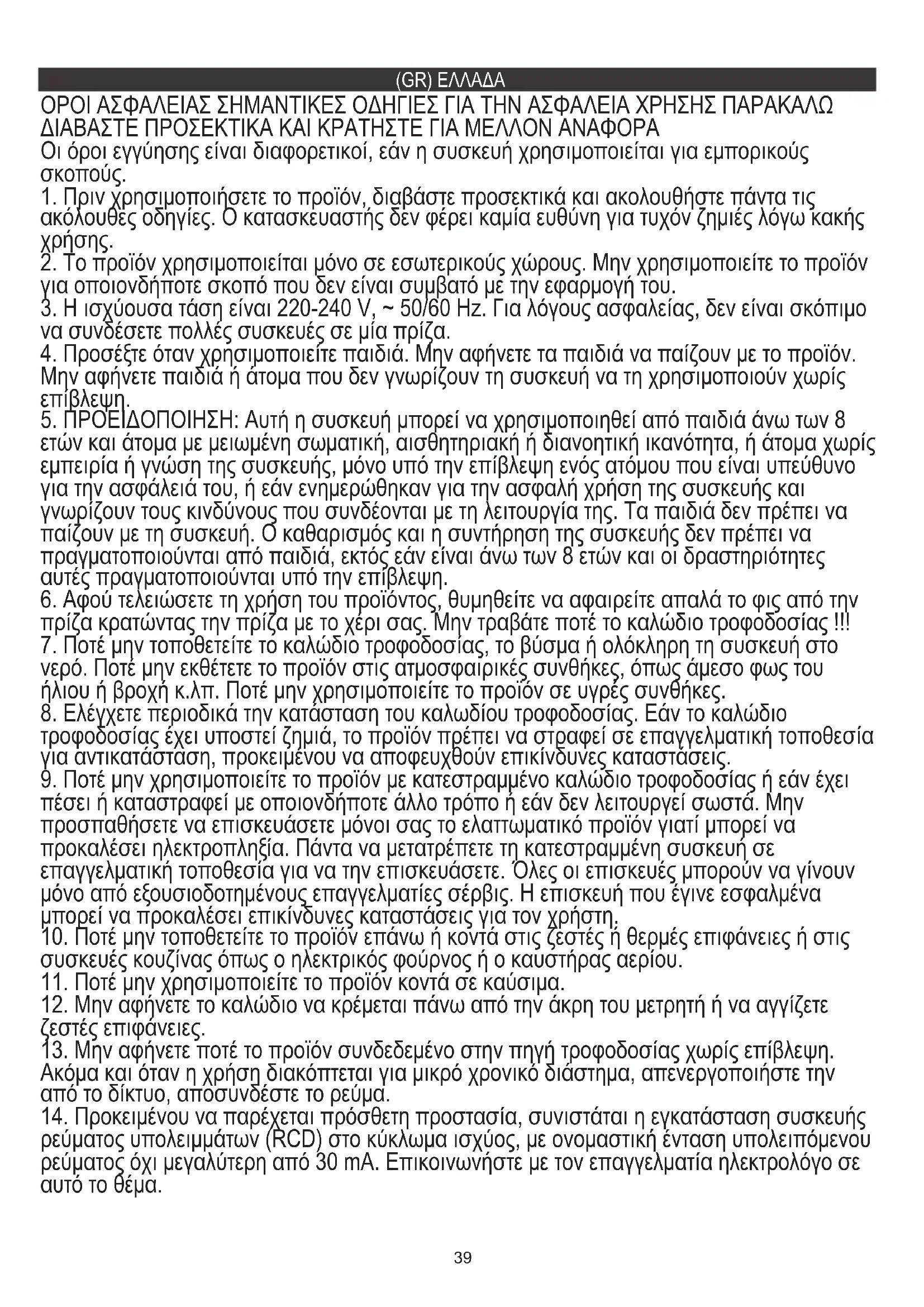 ρεύματος υπολειμμάτων (RCD) στο κύκλωμα ισχύος, με ονομαστική ένταση υπολειπόμενου ρεύματος όχι μεγαλύτερη από 30 mA. Επικοινωνήστε με τον επαγγελματία ηλεκτρολόγο σε αυτό το θέμα. ΟΡΟΙ ΑΣΦΑΛΕΙΑΣ ΣΗΜΑΝΤΙΚΕΣ ΟΔΗΓΙΕΣ ΓΙΑ ΤΗΝ ΑΣΦΑΛΕΙΑ ΧΡΗΣΗΣ ΠΑΡΑΚΑΛΩ ΔΙΑΒΑΣΤΕ ΠΡΟΣΕΚΤΙΚΑ ΚΑΙ ΚΡΑΤΗΣΤΕ ΓΙΑ ΜΕΛΛΟΝ ΑΝΑΦΟΡΑ Οι όροι εγγύησης είναι διαφορετικοί, εάν η συσκευή χρησιμοποιείται για εμπορικούς