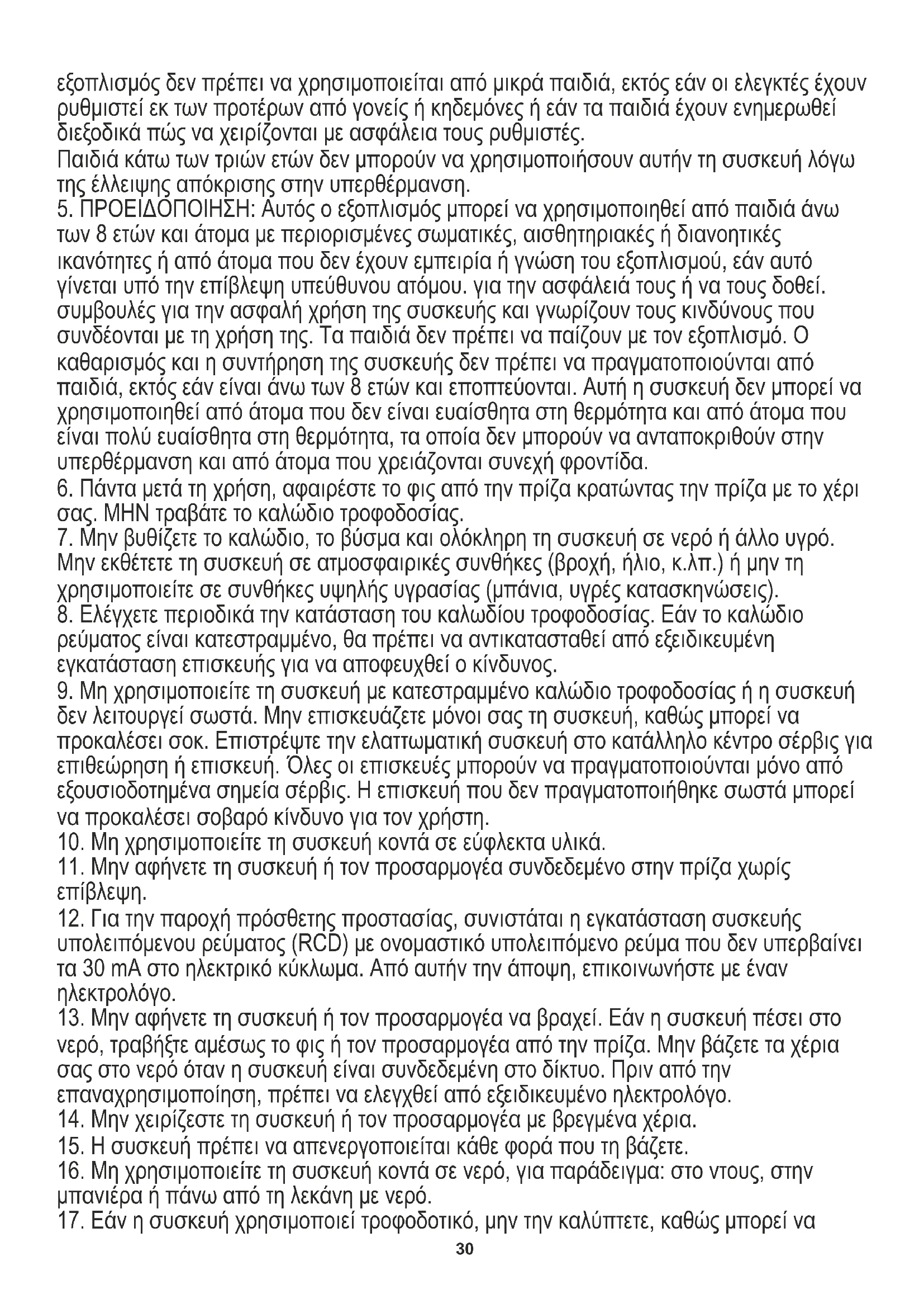 βρίσκονται κοντά. Μην επιτρέπετε στα παιδιά να παίζουν με τη συσκευή, μην αφήνετε παιδιά ή άτομα που δεν είναι εξοικειωμένα με τη συσκευή να τη χρησιμοποιούν. Ο30 εξοπλισμός δεν πρέπει να χρησιμοποιείται από μικρά παιδιά, εκτός εάν οι ελεγκτές έχουν ρυθμιστεί εκ των προτέρων από γονείς ή κηδεμόνες ή εάν τα παιδιά έχουν ενημερωθεί διεξοδικά πώς να χειρίζονται με ασφάλεια τους ρυθμιστές. Παιδιά κάτω των τριών ετών δεν μπορούν να χρησιμοποιήσουν αυτήν τη συσκευή λόγω της έλλειψης απόκρισης στην υπερθέρμανση.