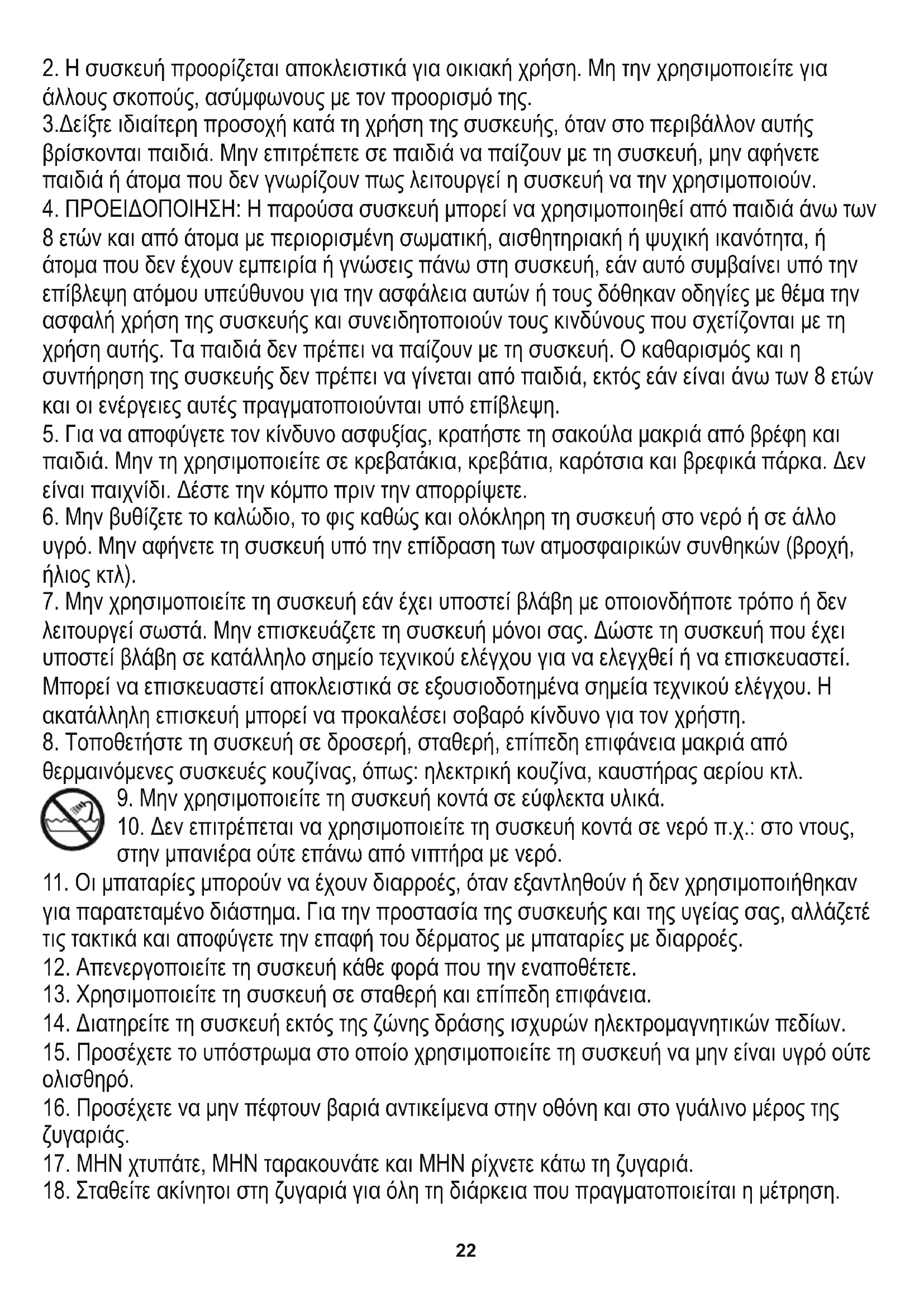 8 ετών και από άτομα με περιορισμένη σωματική, αισθητηριακή ή ψυχική ικανότητα, ή άτομα που δεν έχουν εμπειρία ή γνώσεις πάνω στη συσκευή, εάν αυτό συμβαίνει υπό την επίβλεψη ατόμου υπεύθυνου για την ασφάλεια αυτών ή τους δόθηκαν οδηγίες με θέμα την ασφαλή χρήση της συσκευής και συνειδητοποιούν τους κινδύνους που σχετίζονται με τη χρήση αυτής. Τα παιδιά δεν πρέπει να παίζουν με τη συσκευή. Ο καθαρισμός και η συντήρηση της συσκευής δεν πρέπει να γίνεται από παιδιά, εκτός εάν είναι άνω των 8 ετών και οι ενέργειες αυτές πραγματοποιούνται υπό επίβλεψη.