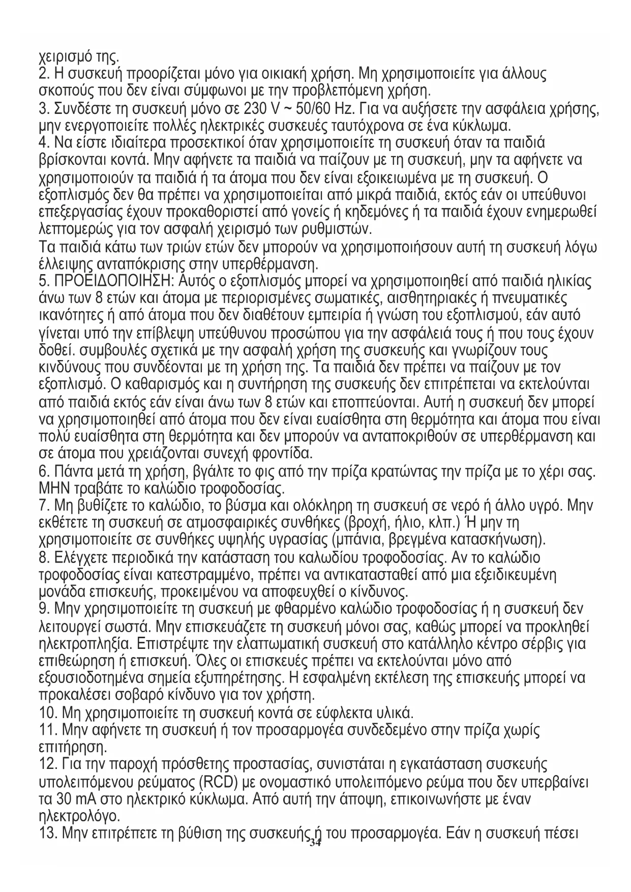 34μέσα στο νερό, τραβήξτε αμέσως το βύσμα ή τον προσαρμογέα από την πρίζα. Μην βάζετε τα χέρια σας στο νερό όταν η συσκευή είναι συνδεδεμένη στο δίκτυο. Πριν από την επαναχρησιμοποίηση, πρέπει να ελέγχεται από ειδικευμένο ηλεκτρολόγο.