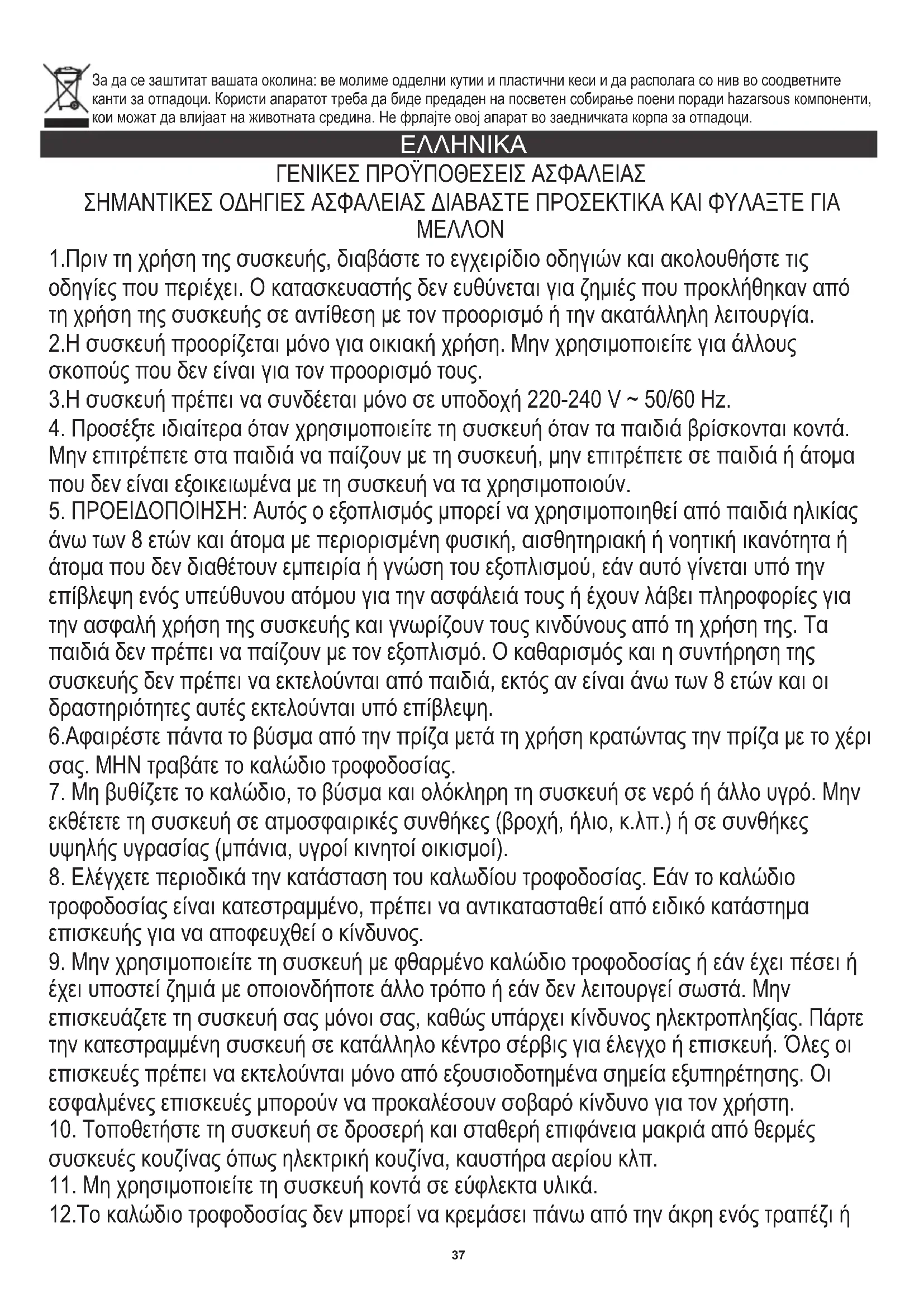 1.Πριν τη χρήση της συσκευής, διαβάστε το εγχειρίδιο οδηγιών και ακολουθήστε τις οδηγίες που περιέχει. Ο κατασκευαστής δεν ευθύνεται για ζημιές που προκλήθηκαν από τη χρήση της συσκευής σε αντίθεση με τον προορισμό ή την ακατάλληλη λειτουργία. 2.Η συσκευή προορίζεται μόνο για οικιακή χρήση. Μην χρησιμοποιείτε για άλλους σκοπούς που δεν είναι για τον προορισμό τους. 3.Η συσκευή πρέπει να συνδέεται μόνο σε υποδοχή 220-240 V ~ 50/60 Hz.