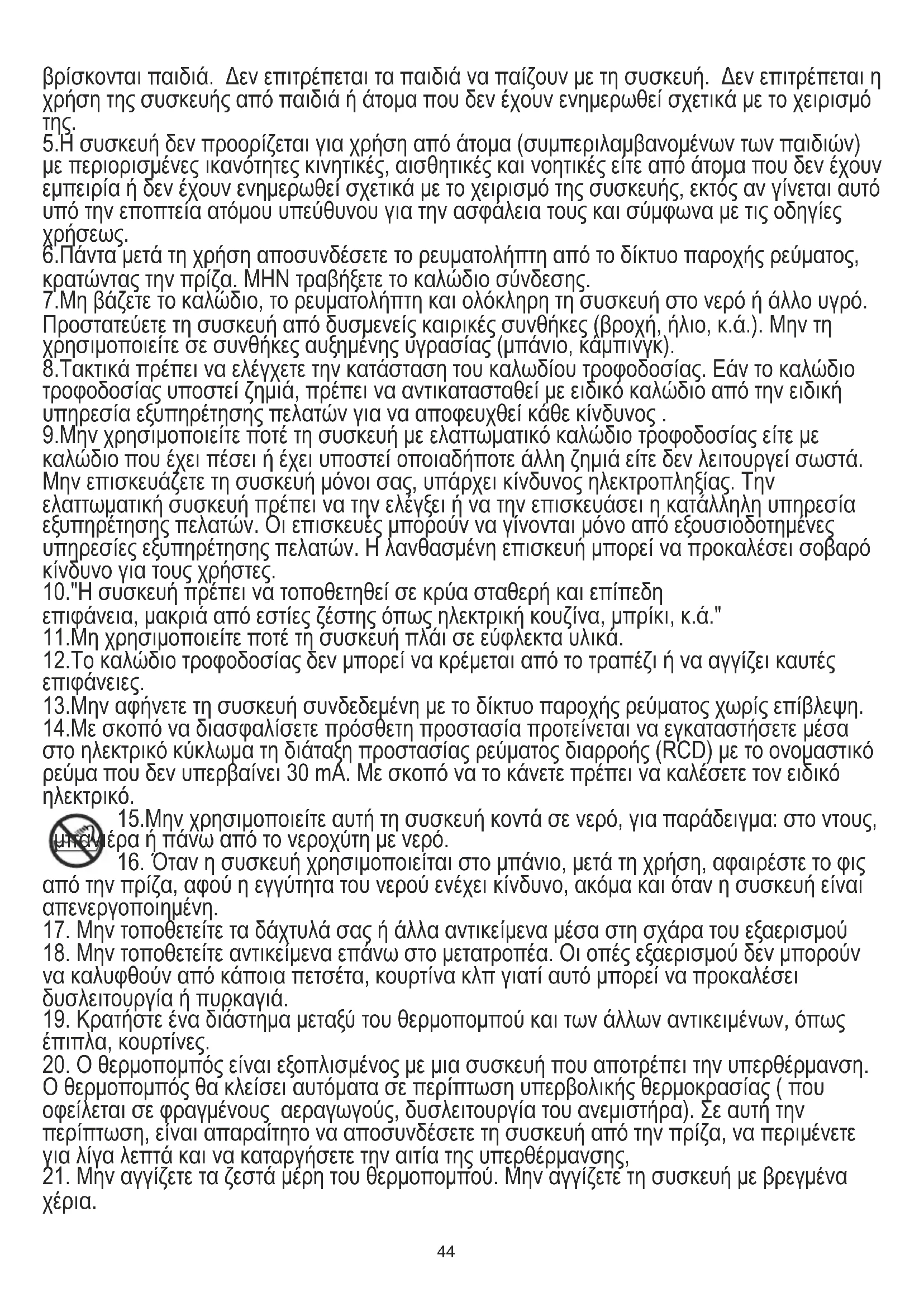 6.Πάντα μετά τη χρήση αποσυνδέσετε το ρευματολήπτη από το δίκτυο παροχής ρεύματος, κρατώντας την πρίζα. ΜΗΝ τραβήξετε το καλώδιο σύνδεσης. 7.Μη βάζετε το καλώδιο, το ρευματολήπτη και ολόκληρη τη συσκευή στο νερό ή άλλο υγρό. Προστατεύετε τη συσκευή από δυσμενείς καιρικές συνθήκες (βροχή, ήλιο, κ.ά.). Μην τη χρησιμοποιείτε σε συνθήκες αυξημένης υγρασίας (μπάνιο, κάμπινγκ). 8.Τακτικά πρέπει να ελέγχετε την κατάσταση του καλωδίου τροφοδοσίας. Εάν το καλώδιο τροφοδοσίας υποστεί ζημιά, πρέπει να αντικατασταθεί με ειδικό καλώδιο από την ειδική υπηρεσία εξυπηρέτησης πελατών για να αποφευχθεί κάθε κίνδυνος . 9.Μην χρησιμοποιείτε ποτέ τη συσκευή με ελαττωματικό καλώδιο τροφοδοσίας είτε με καλώδιο που έχει πέσει ή έχει υποστεί οποιαδήποτε άλλη ζημιά είτε δεν λειτουργεί σωστά. Μην επισκευάζετε τη συσκευή μόνοι σας, υπάρχει κίνδυνος ηλεκτροπληξίας. Την ελαττωματική συσκευή πρέπει να την ελέγξει ή να την επισκευάσει η κατάλληλη υπηρεσία εξυπηρέτησης πελατών. Οι επισκευές μπορούν να γίνονται μόνο από εξουσιοδοτημένες υπηρεσίες εξυπηρέτησης πελατών. Η λανθασμένη επισκευή μπορεί να προκαλέσει σοβαρό κίνδυνο για τους χρήστες. 10."Η συσκευή πρέπει να τοποθετηθεί σε κρύα σταθερή και επίπεδη επιφάνεια, μακριά από εστίες ζέστης όπως ηλεκτρική κουζίνα, μπρίκι, κ.ά." 11.Μη χρησιμοποιείτε ποτέ τη συσκευή πλάι σε εύφλεκτα υλικά. 12.Το καλώδιο τροφοδοσίας δεν μπορεί να κρέμεται από το τραπέζι ή να αγγίζει καυτές επιφάνειες. 13.Μην αφήνετε τη συσκευή συνδεδεμένη με το δίκτυο παροχής ρεύματος χωρίς επίβλεψη. 14.Με σκοπό να διασφαλίσετε πρόσθετη προστασία προτείνεται να εγκαταστήσετε μέσα στο ηλεκτρικό κύκλωμα τη διάταξη προστασίας ρεύματος διαρροής (RCD) με το ονομαστικό ρεύμα που δεν υπερβαίνει 30 mA. Με σκοπό να το κάνετε πρέπει να καλέσετε τον ειδικό