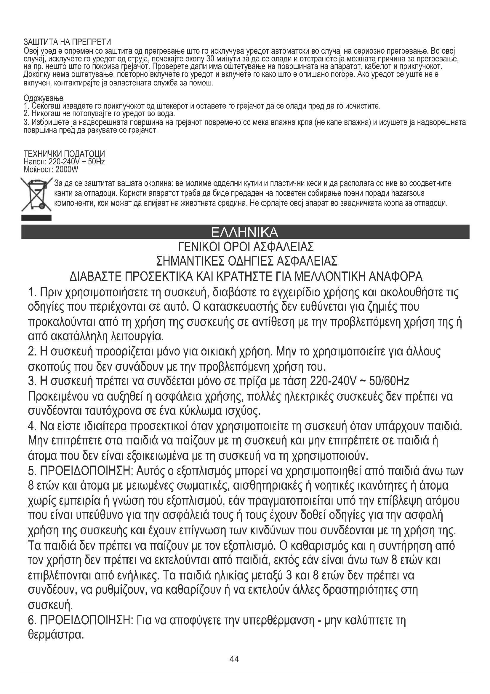 υγρό) και στεγνώστε την εξωτερική επιφάνεια πριν θέσετε σε λειτουργία τον θερμαντήρα. ΤΕΧΝΙΚΑ ΔΕΔΟΜΕΝΑ Τάση: 220-240V ~ 50Hz Ισχύς: 2000W48