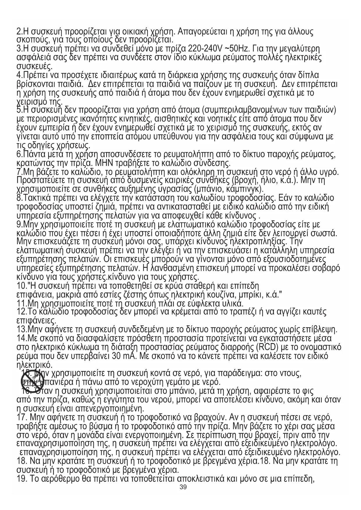 4.Πρέπει να προσέχετε ιδιαιτέρως κατά τη διάρκεια χρήσης της συσκευής όταν δίπλα βρίσκονται παιδιά. Δεν επιτρέπεται τα παιδιά να παίζουν με τη συσκευή. Δεν επιτρέπεται η χρήση της συσκευής από παιδιά ή άτομα που δεν έχουν ενημερωθεί σχετικά με το χειρισμό της. 5.Η συσκευή δεν προορίζεται για χρήση από άτομα (συμπεριλαμβανομένων των παιδιών) με περιορισμένες ικανότητες κινητικές, αισθητικές και νοητικές είτε από άτομα που δεν έχουν εμπειρία ή δεν έχουν ενημερωθεί σχετικά με το χειρισμό της συσκευής, εκτός αν γίνεται αυτό υπό την εποπτεία ατόμου υπεύθυνου για την ασφάλεια τους και σύμφωνα με τις οδηγίες χρήσεως. 6.Πάντα μετά τη χρήση αποσυνδέσετε το ρευματολήπτη από το δίκτυο παροχής ρεύματος, κρατώντας την πρίζα. ΜΗΝ τραβήξετε το καλώδιο σύνδεσης. 7.Μη βάζετε το καλώδιο, το ρευματολήπτη και ολόκληρη τη συσκευή στο νερό ή άλλο υγρό. Προστατεύετε τη συσκευή από δυσμενείς καιρικές συνθήκες (βροχή, ήλιο, κ.ά.). Μην τη χρησιμοποιείτε σε συνθήκες αυξημένης υγρασίας (μπάνιο, κάμπινγκ). 8.Τακτικά πρέπει να ελέγχετε την κατάσταση του καλωδίου τροφοδοσίας. Εάν το καλώδιο τροφοδοσίας υποστεί ζημιά, πρέπει να αντικατασταθεί με ειδικό καλώδιο από την ειδική υπηρεσία εξυπηρέτησης πελατών για να αποφευχθεί κάθε κίνδυνος . 9.Μην χρησιμοποιείτε ποτέ τη συσκευή με ελαττωματικό καλώδιο τροφοδοσίας είτε με καλώδιο που έχει πέσει ή έχει υποστεί οποιαδήποτε άλλη ζημιά είτε δεν λειτουργεί σωστά. Μην επισκευάζετε τη συσκευή μόνοι σας, υπάρχει κίνδυνος ηλεκτροπληξίας. Την ελαττωματική συσκευή πρέπει να την ελέγξει ή να την επισκευάσει η κατάλληλη υπηρεσία εξυπηρέτησης πελατών. Οι επισκευές μπορούν να γίνονται μόνο από εξουσιοδοτημένες υπηρεσίες εξυπηρέτησης πελατών. Η λανθασμένη επισκευή μπορεί να προκαλέσει σοβαρό κίνδυνο για τους χρήστες.κίνδυνο για τους χρήστες. 10."Η συσκευή πρέπει να τοποθετηθεί σε κρύα σταθερή και επίπεδη επιφάνεια, μακριά από εστίες ζέστης όπως ηλεκτρική κουζίνα, μπρίκι, κ.ά." 11.Μη χρησιμοποιείτε ποτέ τη συσκευή πλάι σε εύφλεκτα υλικά. 12.Το καλώδιο τροφοδοσίας δεν μπορεί να κρέμεται από το τραπέζι ή να αγγίζει καυτές επιφάνειες. 13.Μην αφήνετε τη συσκευή συνδεδεμένη με το δίκτυο παροχής ρεύματος χωρίς επίβλεψη. 14.Με σκοπό να διασφαλίσετε πρόσθετη προστασία προτείνεται να εγκαταστήσετε μέσα στο ηλεκτρικό κύκλωμα τη διάταξη προστασίας ρεύματος διαρροής (RCD) με το ονομαστικό ρεύμα που δεν υπερβαίνει 30 mA. Με σκοπό να το κάνετε πρέπει να καλέσετε τον ειδικό