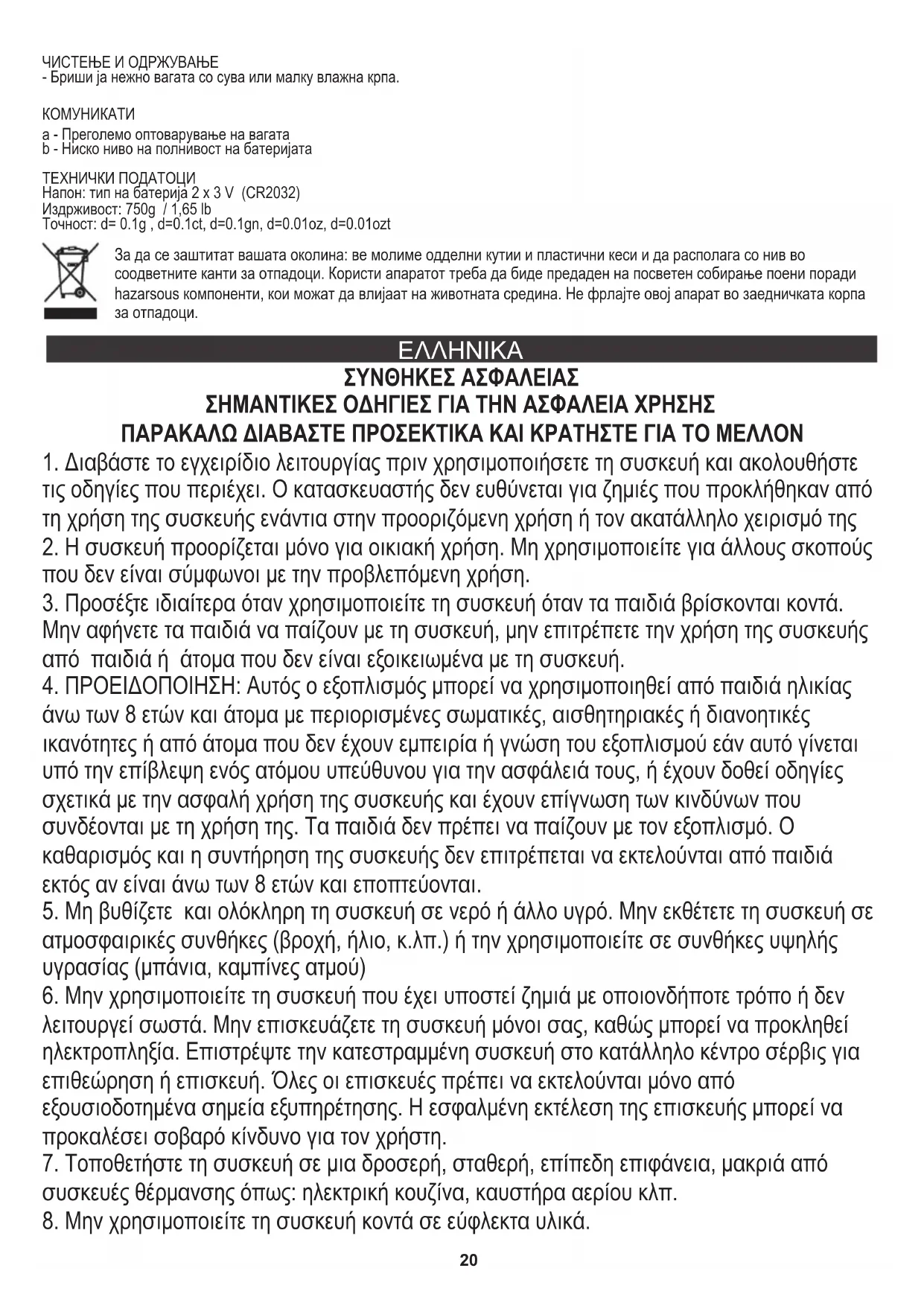 Ισχύς: Τύπος μπαταρίας 2 x 3 V (CR2032) Χωρητικότητα: 750g / 1,65 lb Ακρίβεια: d= 0.1g , d=0.1ct, d=0.1gn, d=0.01oz, d=0.01ozt a - Πάρα πολύ μεγάλο βάρος φορτίου b - Εξασθενημένη μπαταρία ΤΕΧΝΙΚΑ ΧΑΡΑΚΤΗΡΙΣΤΙΚΑ φροντίζουμε το φυσικό περιβάλλον. Παρακαλούμε να πετάτε τις συσκευασίες από χαρτόνι στον κάδο ανακύκλωσης απορριμμάτων χαρτιού. Τις σακούλες από πολυαιθυλένιο (ΡΕ), απορρίψτε τις στον κάδο ανακύκλωσης πλαστικών. Η φθαρμένη συσκευή πρέπει να απορρίπτεται στο κατάλληλο σημείο, εξαιτίας των επικίνδυνων στοιχείων που περιέχει και τα οποία μπορεί να αποτελέσουν απειλή για το περιβάλλον. Η ηλεκτρική συσκευή πρέπει να απορρίπτεται με τέτοιο τρόπο ώστε να περιοριστεί η επαναχρησιμοποίηση της. Εάν στη συσκευή βρίσκονται μπαταρίες, αυτές πρέπει να αφαιρεθούν και να πεταχτούν σε ξεχωριστό κάδο. SLOVENŠČINA VARNOSTNI POGOJI