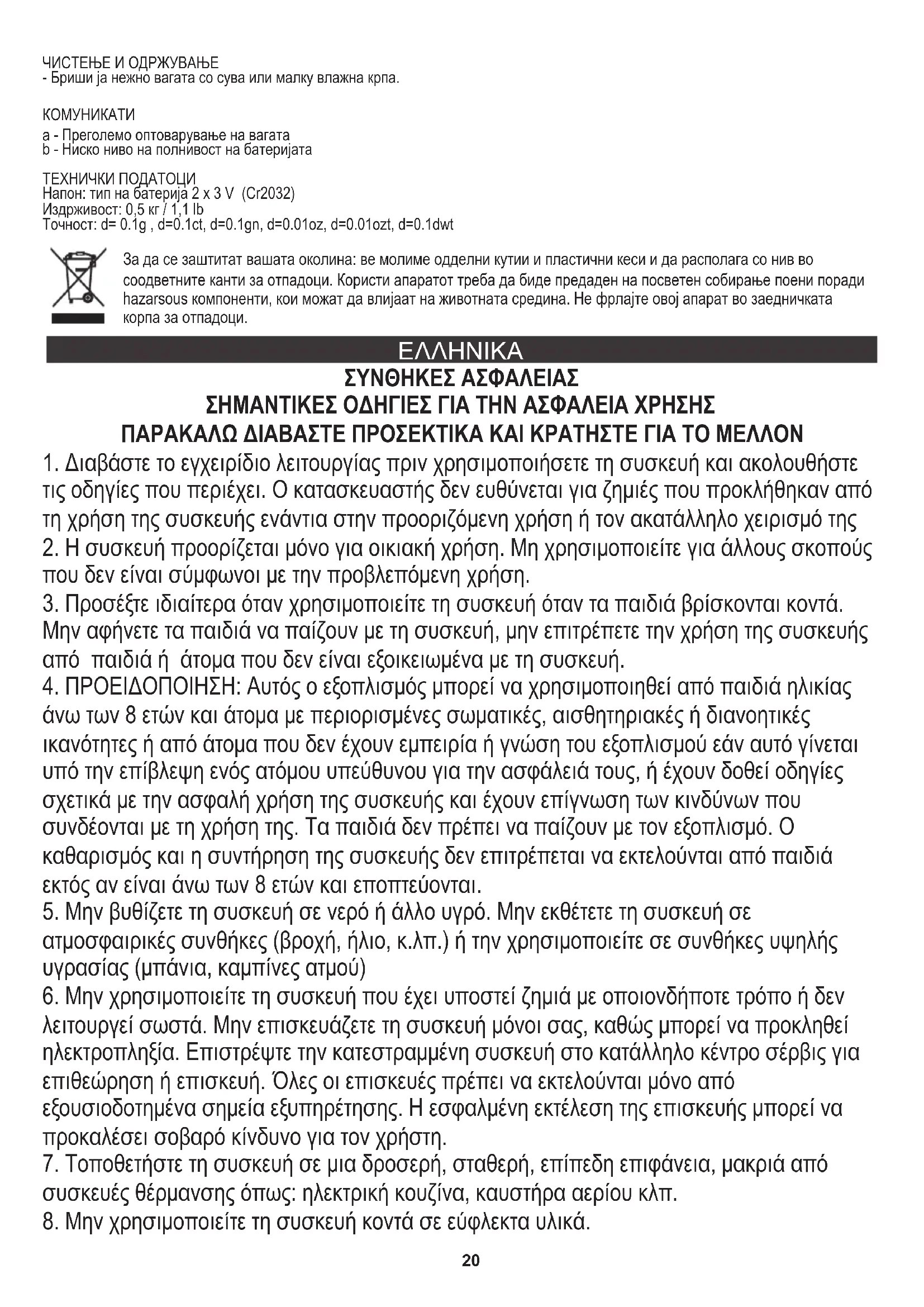 Ισχύς: Τύπος μπαταρίας 2 x 3 V (Cr2032) Χωρητικότητα: 0,5 κιλά Ακρίβεια: d= 0.1g , d=0.1ct, d=0.1gn, d=0.01oz, d=0.01ozt, d=0.1dwt