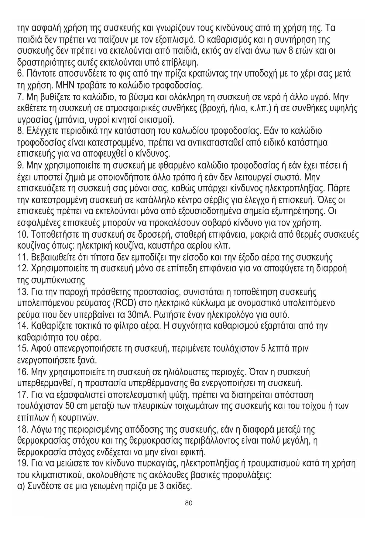 του κλιματιστικού, ακολουθήστε τις ακόλουθες βασικές προφυλάξεις: α) Συνδέστε σε μια γειωμένη πρίζα με 3 ακίδες. την ασφαλή χρήση της συσκευής και γνωρίζουν τους κινδύνους από τη χρήση της. Τα παιδιά δεν πρέπει να παίζουν με τον εξοπλισμό. Ο καθαρισμός και η συντήρηση της συσκευής δεν πρέπει να εκτελούνται από παιδιά, εκτός αν είναι άνω των 8 ετών και οι δραστηριότητες αυτές εκτελούνται υπό επίβλεψη.