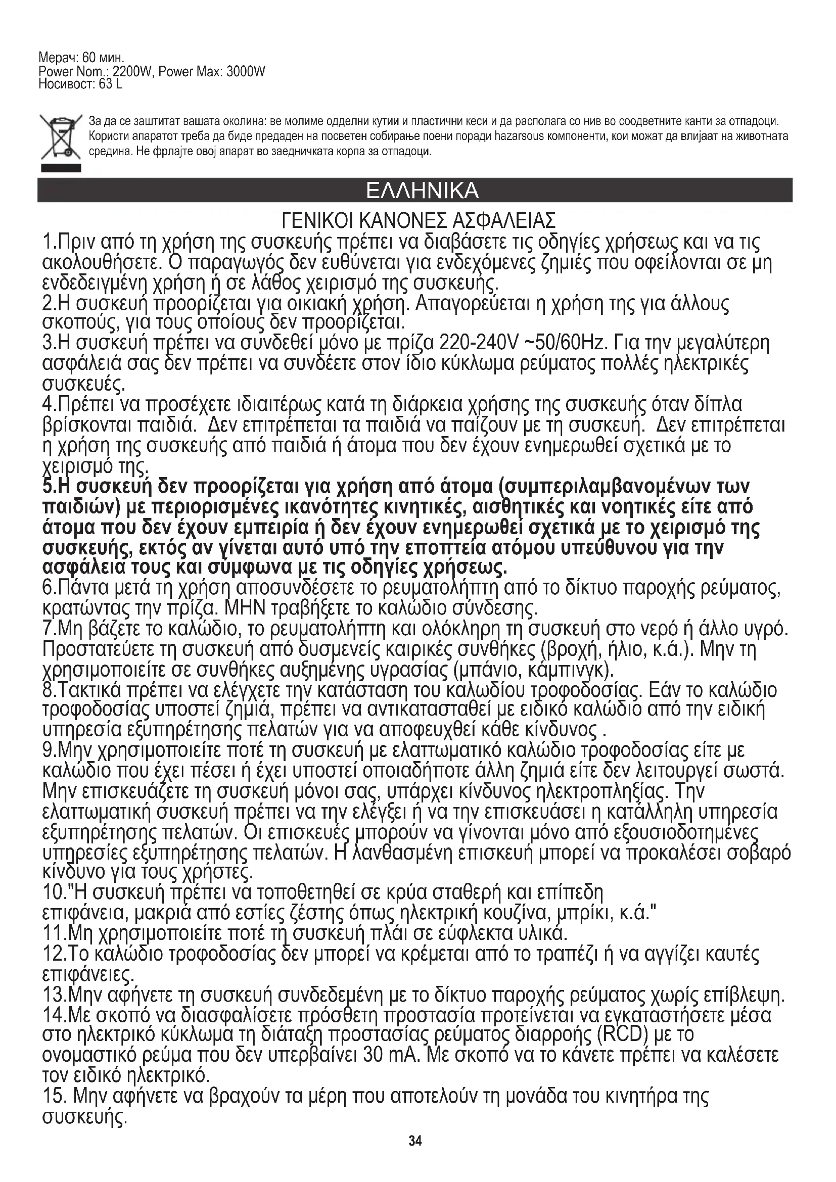 За да се заштитат вашата околина: ве молиме одделни кутии и пластични кеси и да располага со нив во соодветните канти за отпадоци. Користи апаратот треба да биде предаден на посветен собирање поени поради hazarsous компоненти, кои можат да влијаат на животната средина. Не фрлајте овој апарат во заедничката корпа за отпадоци. Power Nom.: 2200W, Power Max: 3000W Мерач: 60 мин. Носивост: 63 L 4.Πρέπει να προσέχετε ιδιαιτέρως κατά τη διάρκεια χρήσης της συσκευής όταν δίπλα βρίσκονται παιδιά. Δεν επιτρέπεται τα παιδιά να παίζουν με τη συσκευή. Δεν επιτρέπεται η χρήση της συσκευής από παιδιά ή άτομα που δεν έχουν ενημερωθεί σχετικά με το χειρισμό της. ΓΕΝΙΚΟΙ ΚΑΝΟΝΕΣ ΑΣΦΑΛΕΙΑΣ 1.Πριν από τη χρήση της συσκευής πρέπει να διαβάσετε τις οδηγίες χρήσεως και να τις ακολουθήσετε. Ο παραγωγός δεν ευθύνεται για ενδεχόμενες ζημιές που οφείλονται σε μη ενδεδειγμένη χρήση ή σε λάθος χειρισμό της συσκευής. 2.Η συσκευή προορίζεται για οικιακή χρήση. Απαγορεύεται η χρήση της για άλλους σκοπούς, για τους οποίους δεν προορίζεται. 3.Η συσκευή πρέπει να συνδεθεί μόνο με πρίζα 220-240V ~50/60Hz. Για την μεγαλύτερη ασφάλειά σας δεν πρέπει να συνδέετε στον ίδιο κύκλωμα ρεύματος πολλές ηλεκτρικές