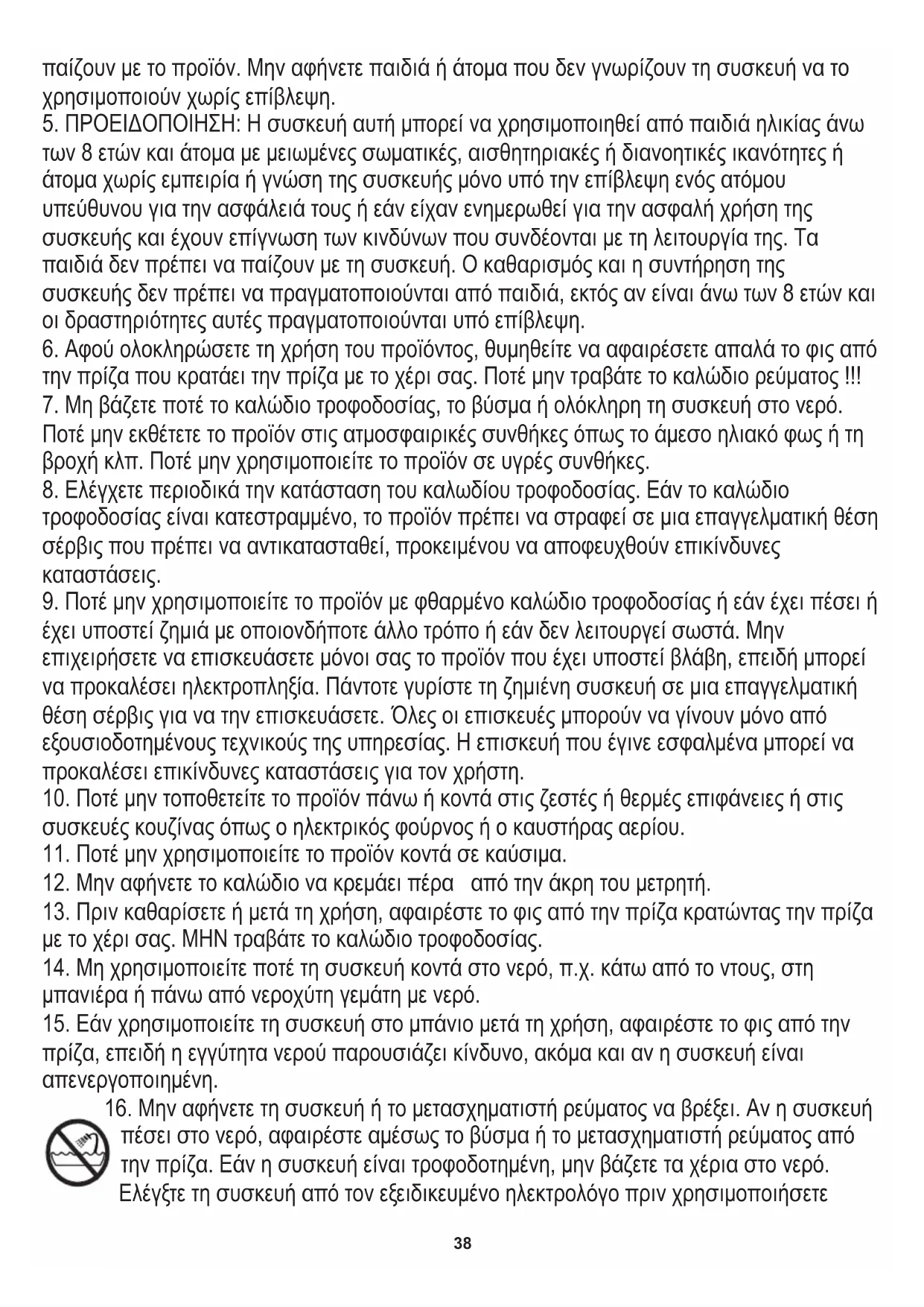 14. Μη χρησιμοποιείτε ποτέ τη συσκευή κοντά στο νερό, π.χ. κάτω από το ντους, στη