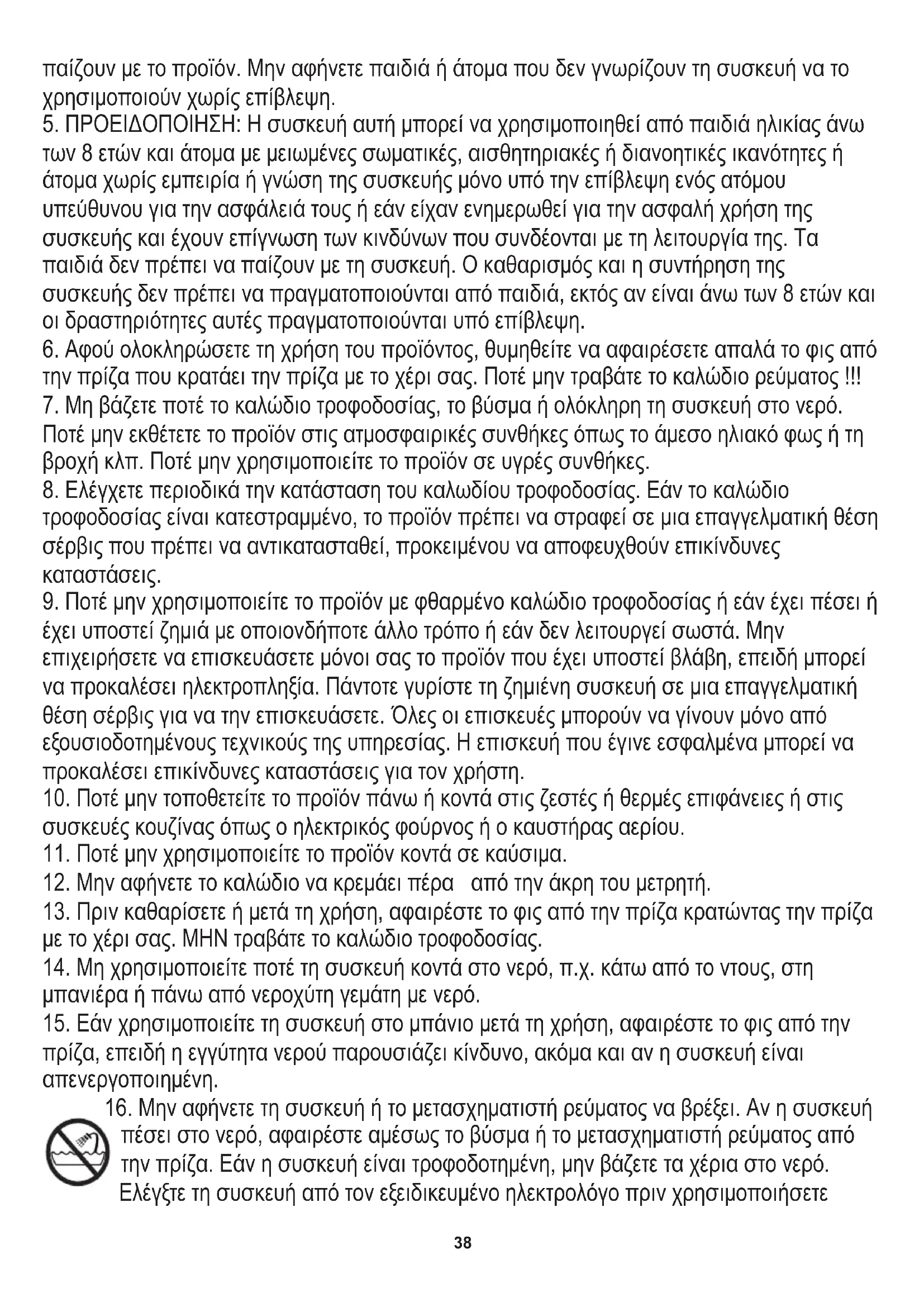14. Μη χρησιμοποιείτε ποτέ τη συσκευή κοντά στο νερό, π.χ. κάτω από το ντους, στη