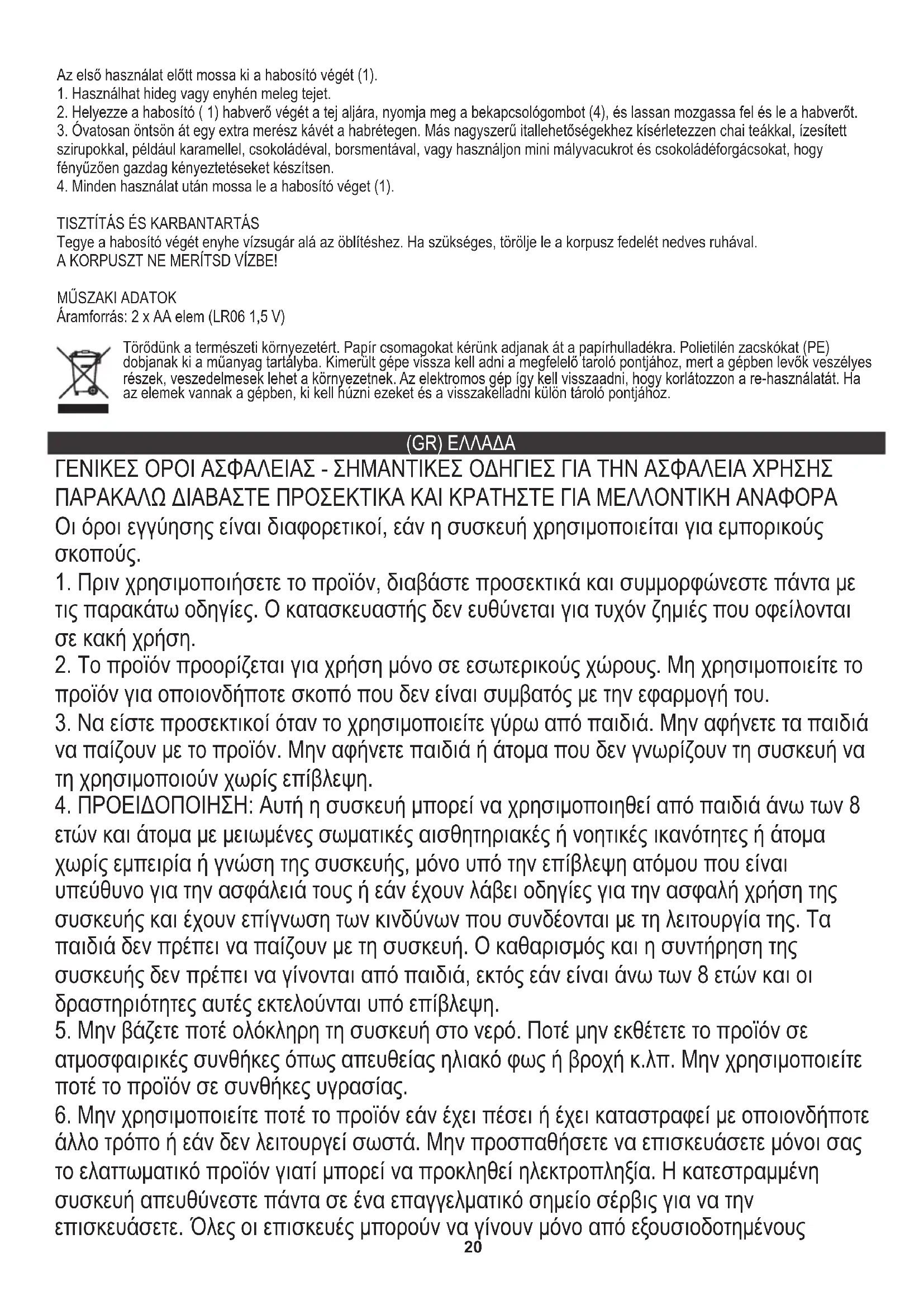 Πηγή ισχύος: 2 x μπαταρίες AA (LR06 1,5 V) Τοποθετήστε το άκρο του αφροποιητή κάτω από μια απαλή ροή νερού για να ξεπλύνετε. Εάν χρειάζεται, σκουπίστε το κάλυμμα του σώματος με υγρό πανί. ΤΕΧΝΙΚΑ ΔΕΔΟΜΕΝΑ ΚΑΘΑΡΙΣΜΟΣ ΚΑΙ ΣΥΝΤΗΡΗΣΗ ΜΗ ΒΑΘΕΙΤΕ ΤΟ ΣΩΜΑ ΣΤΟ ΝΕΡΟ! φροντίζουμε το φυσικό περιβάλλον. Παρακαλούμε να πετάτε τις συσκευασίες από χαρτόνι στον κάδο ανακύκλωσης απορριμμάτων χαρτιού. Τις σακούλες από πολυαιθυλένιο (ΡΕ), απορρίψτε τις στον κάδο ανακύκλωσης πλαστικών. Η φθαρμένη συσκευή πρέπει να απορρίπτεται στο κατάλληλο σημείο, εξαιτίας των επικίνδυνων στοιχείων που περιέχει και τα οποία μπορεί να αποτελέσουν απειλή για το περιβάλλον. Η ηλεκτρική συσκευή πρέπει να απορρίπτεται με τέτοιο τρόπο ώστε να περιοριστεί η επαναχρησιμοποίηση της. Εάν στη συσκευή βρίσκονται μπαταρίες, αυτές πρέπει να αφαιρεθούν και να πεταχτούν σε ξεχωριστό κάδο.22 (MK) Mакедонски ОПШТИ БЕЗБЕДНОСНИ УСЛОВИ - ВАЖНИ ИНСТРУКЦИИ ЗА БЕЗБЕДНОСТ НА